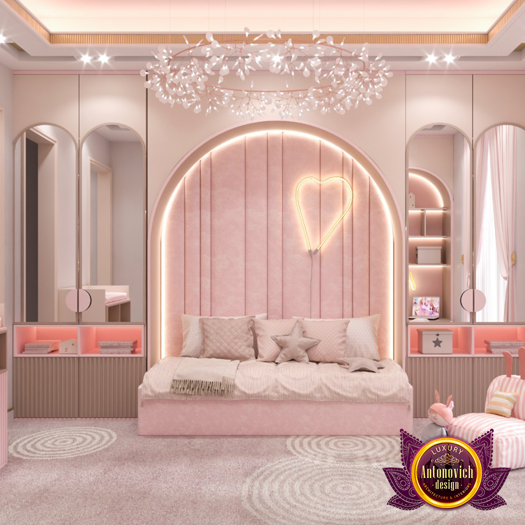 هذه المساحة بأناقتها الرائعة مكان للاسترخاء. الألوان المستخدمة مناسبة لكلا الجنسين. مع تفاصيلها وتشطيباتها الراقية، ضمنت أنطونوفيتش ديزاين (Antonovich Design) أن يكون الداخل مصمماً بأعلى مستوى. الإقامة هنا تشبه الإقامة في فندق فاخر بفضل التخطيط الواسع والعمارة الحديثة الرائعة. للمداخل المتناسقة استكشف التصميم الخارجي في الشارقة، بينما يكمّل التصميم المعماري والداخلي المظهر العام للمساحات. هذا التصميم الأنيق يمنح أفضل مزاج عام لغرفة النوم. تصميم غرفة نوم بنات فاخرة يرفع من مستوى المنزل ككل. الغرفة بأثاثها الجميل مكان رائع للاسترخاء. اللون الوردي المحبب مع الدرجة الكريمية مزيج لوني ممتاز. المفروشات الوردية تتناغم مع ديكور غرفة النوم، كما أن الرفوف الكبيرة ومكتب العمل هما من أجمل المناطق في هذا التصميم الداخلي.