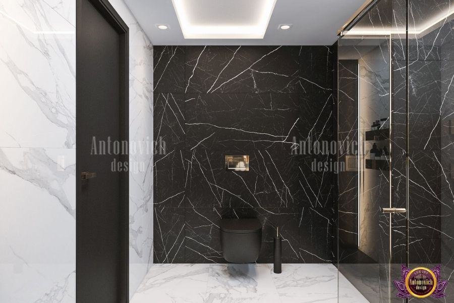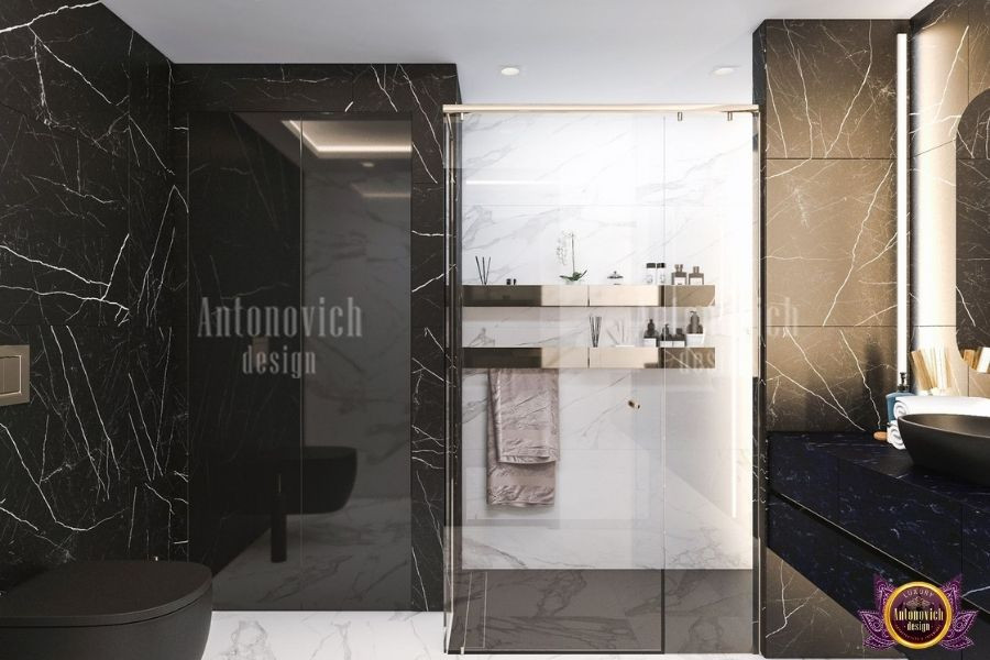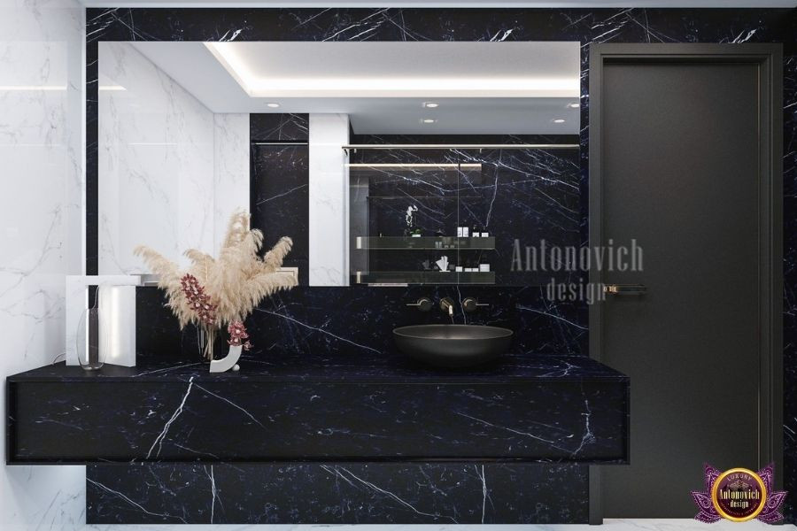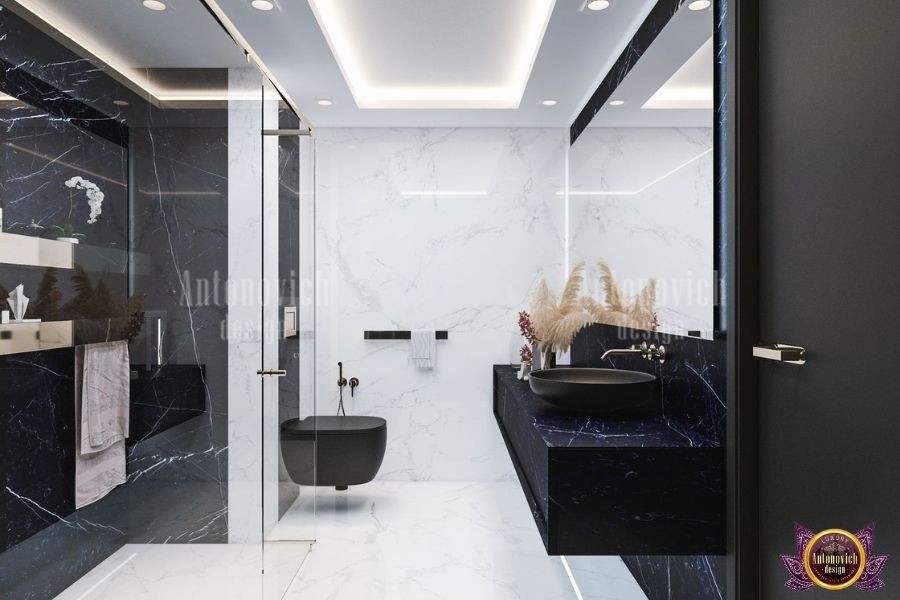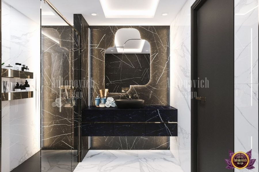 التصميم الفاخر لغرفة النوم في دبي يوفر أجواء أكثر رقياً بفضل توليفة الأسود والذهبي. الأرضيات الرائعة تضيف إلى جمال تصميمات الحمام بشكل عام. المساحة كاملة مبنية بعناية، ما يجعل كل تصميم حمامات مودرن في دبي يعكس توازناً بين الفخامة والراحة، ونعتمد أيضاً أساليب تصميم غرفة نوم مريحة لفلل دبي في بعض المشروعات.