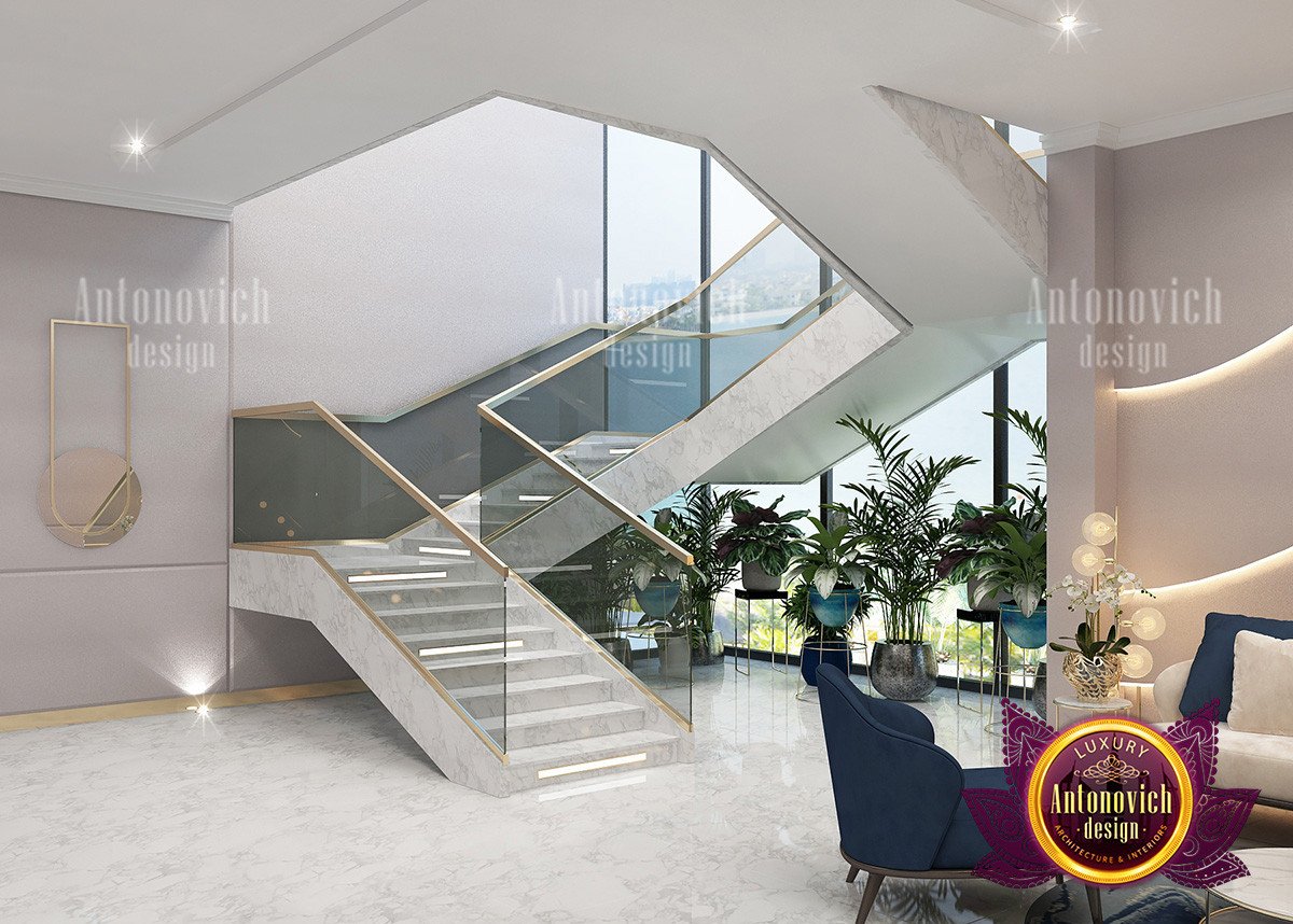 السلالم في هذا التصميم الداخلي للصالة مصممة ببساطة وجمال. الدرابزين الزجاجي يخلق تبايناً مع أثاث الأزرق والكريم. مقابض الذهب تضيف لمسة فاخرة، بينما تمنح النباتات أسفل الدرج مساحة للتنفس داخل التصميم. يتضح استخدام درج زجاجي وتصميم سلم داخلي أنيق في هذا المشروع. السلم يصل إلى ردهة مودرن تعزّز انسيابية التصميم، وتتكامل الردهة الفرعية مع ردهة مودرن وتصميم مدخل فاخر. لتصاميم غرف أخرى انظر مطبخ عائلي مريح وتصميم حمام جميل كنماذج تكاملية داخل المشروع.