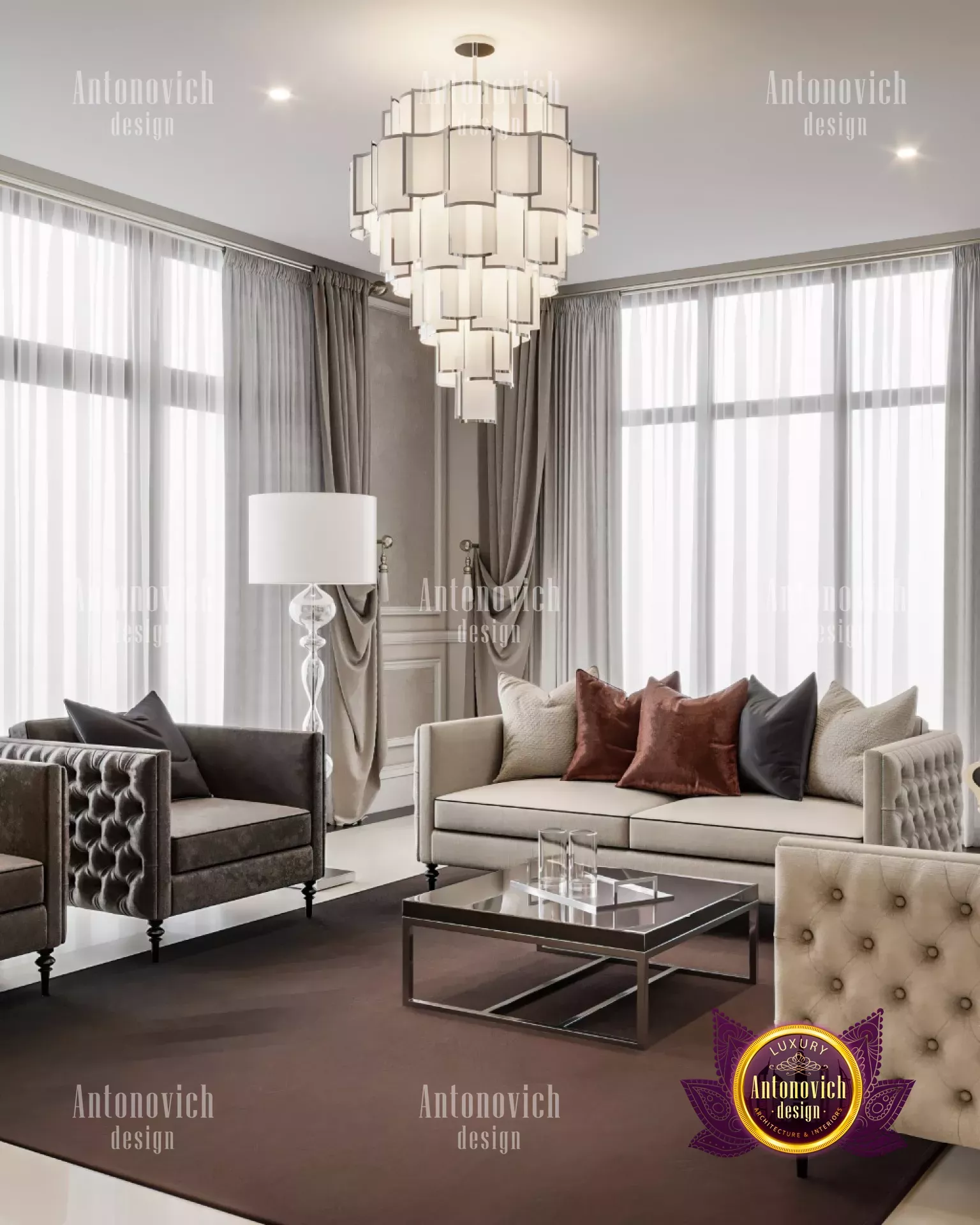 تنبعث من هذه الغرفة أجواء فاخرة. الأثاث في هذا المشروع من أنطونوفيتش ديزاين (Antonovich Design) مصنوع بأعلى جودة. لمشورة الشراء والترتيب، اطلع على متطلبات الأثاث للمنازل الفاخرة. وللمشروعات حسب الطلب، راجع تصميم أثاث فاخر مخصص. المقاعد والطاولات صُممت لتجمع بين الأناقة والراحة. ستجد قطعًا مماثلة ضمن دليلنا محلات الأثاث. ألوانها الرقيقة تُكمل الإبداع الجميل؛ والتشطيبات في هذا المشروع مفصّلة بعناية. سترى إبداعات بارزة تتناسب مع ديكور غرفة المعيشة الفاخرة من كل زاوية. إضاءة هذه الغرفة أيضًا مُختارة بعناية؛ الثريات المدهشة التي تبدو كأنها مياه متدفقة مثالية لهذا النمط. راجع مصدر إلهام الإضاءة للضيافة في تصميم مقاهي في دبي. أجواء هذا المنزل الفاخر تعرض نقوشًا مناسبة لتصميم غرفة المعيشة الفاخرة. إن نظرة فاحصة تكشف عن التصاميم الجميلة التي أبدعتها أنطونوفيتش ديزاين (Antonovich Design). كل تفصيل مدروس بعناية ليشبه فندق خمس نجوم مع أجمل تصميم داخلي. المخمل خيار راقٍ لإدخاله في منزلك؛ فهو يمنح أجواء مترفة مناسبة لمن يبحثون عن بيئة أنيقة. اللون المخملي يُستخدم كلون تباين هنا، بينما الألوان الأساسية هي البني والرمادي. تداخل هذه الألوان يُنتج أجواء صناعية ديناميكية مناسبة لتصميم غرفة المعيشة الفاخرة.