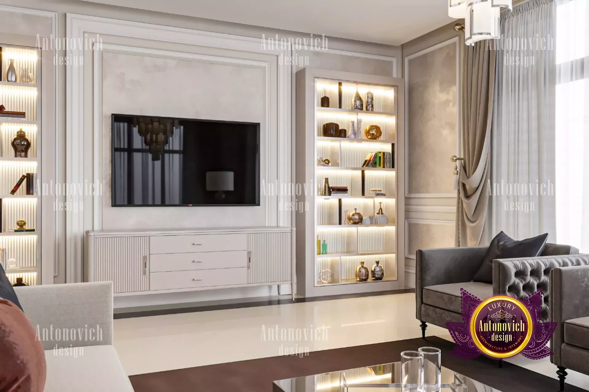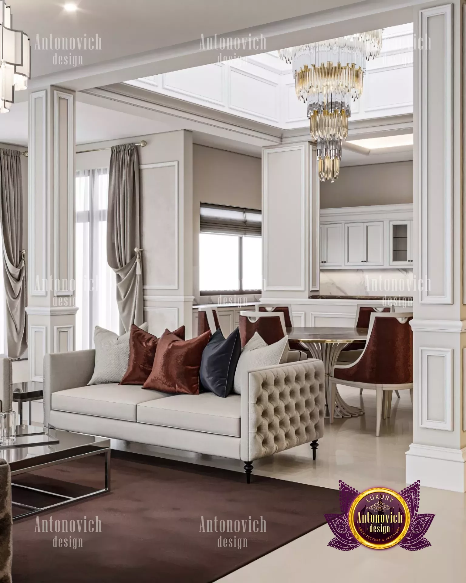 تصميم داخلي أنيق ونابض بالحياة يعكس شخصيتك. النغمات الباردة في هذا تصميم غرفة المعيشة الفاخر تجعل الغرفة ساحرة أكثر. هذا تصميم داخلي الفاخر يحتوي على تصاميم مفصّلة حسب الطلب تناسب أسلوب حياتك وتُشعرك بالرفاهية طوال اليوم. إذا رغبت في تصميم غرفة المعيشة الفاخرة بألوان كريمية وبيضاء، فاعتبر هذه الغرفة نموذجًا رائعًا. الأريكة المميزة تحمل نقوشًا باردة ومثيرة، بينما تشكيلة المربعات الماسية تفوق الروعة في التفاصيل. الأرضية المتميزة تمثّل عنصرًا ثانويًا يقود الانتباه؛ فهي مغطاة بسجادة لطيفة لا تشتت النظر. مع تصميم متواضع لكنه رائعة التفاصيل، وُضع هذا المشروع بروح تجمع بين الطابع الفاخر واللمسة العصرية، ممّا يعكس تصميم غرفة المعيشة الحديثة.