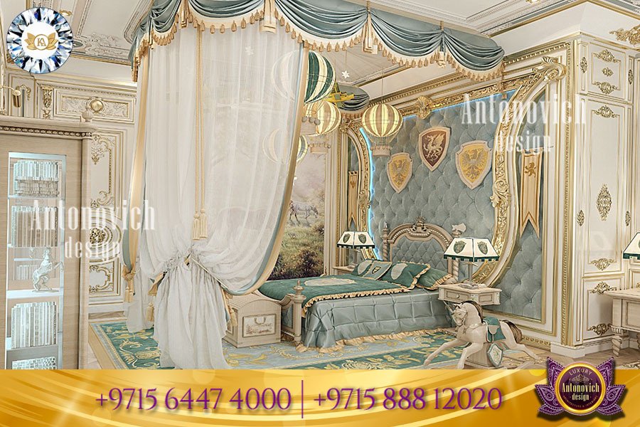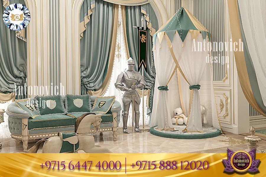 هذا التصميم الداخلي الفاخر للأطفال اتخذ طابعاً ملكياً بفكرة فرسان. استخدمت المواد والديكورات والأثاث الأنيق بعناية فائقة ضمن إجراءات اختيار دقيقة. تؤكد أنطونوفيتش ديزاين أن الفريق اتبع منهجية نظامية في تطوير تخطيط المساحات لتحقيق أفضل توزيع وظيفي وجمالي. كما يستورد الفريق قطعاً من أفضل متاجر الأثاث المنزلي في دبي لضمان مستوى جودة ثابت. كان اختيار تصميم السرير والديكور المرتبط به من أصعب مراحل إتمام التصميم الداخلي لغرفة النوم للأطفال، إذ يمثل السرير العنصر المركزي الذي يجب أن يكون الأكثر أناقة وجذباً. للمزيد من الإرشادات العملية، راجع نصائح تجديد غرفة النوم الحديثة.