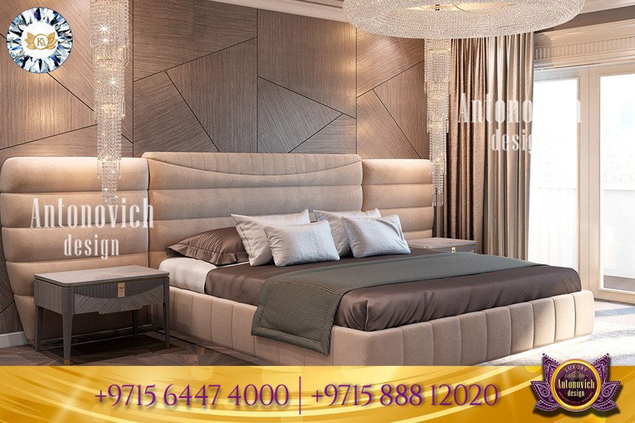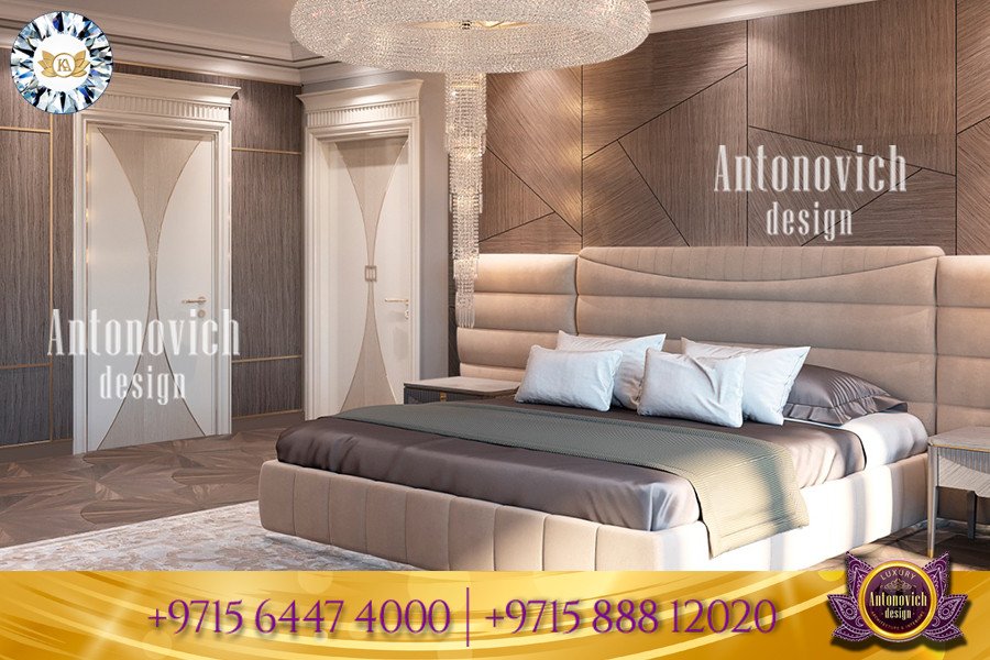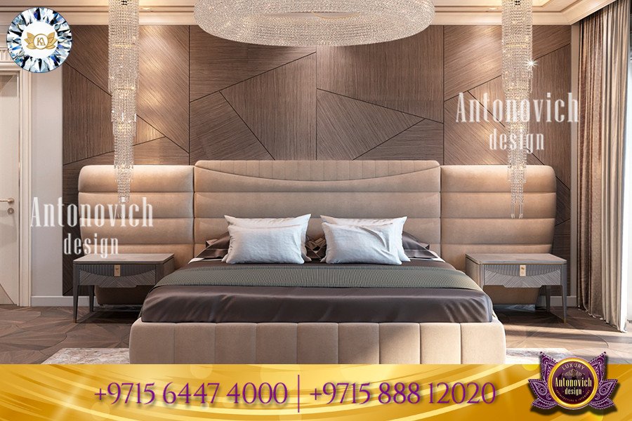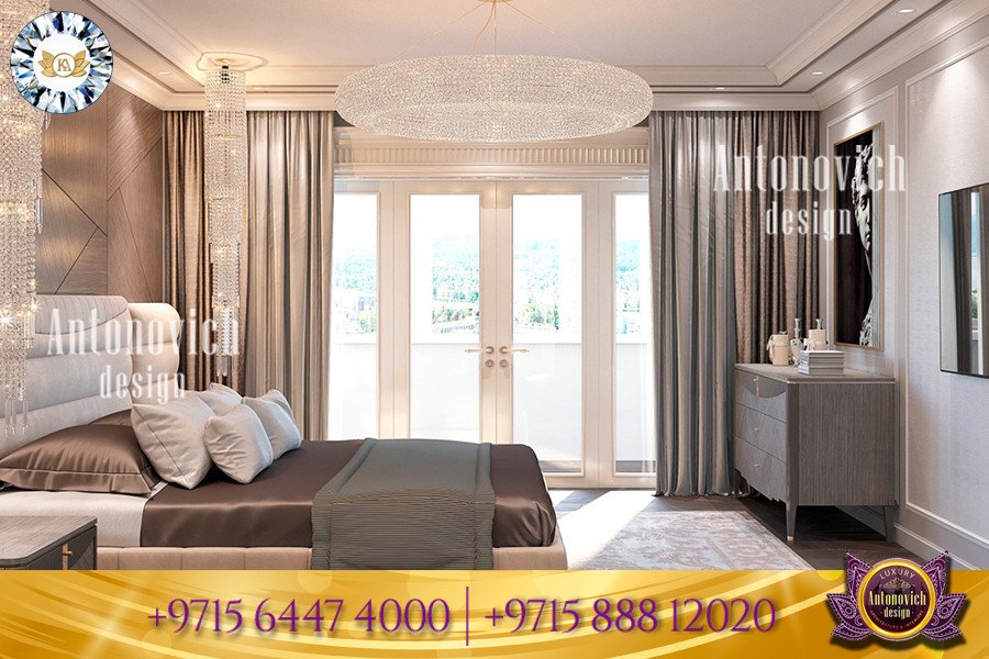ثريا دائرية مملوءة بحبات الكريستال تضيف سحراً إضافياً وفخامة لتصميم الغرفة. بدلاً من مصابيح الطاولات الجانبية، اعتمدت أنطونوفيتش ديزاين (Antonovich Design) ثريا معلقة رائعة مصنوعة أيضاً من حبات كريستال متناغمة مع التصميم. تتيح هذه الغرفة الفاخرة إطلالة خارجية، حيث تتميز الأبواب الزجاجية الكبيرة بأسلوب فاخر مع أعمال جبسية إبداعية؛ ويترابط المخطط مع عناصر خارجية مثل مقاول مسابح الفلل وعمليات تنسيق زراعة من قِبل أفضل شركات تنسيق الحدائق في الإمارات لإكمال المنظر. ويُكمل ذلك تصاميم حمامات سباحة فاخرة للمنازل.