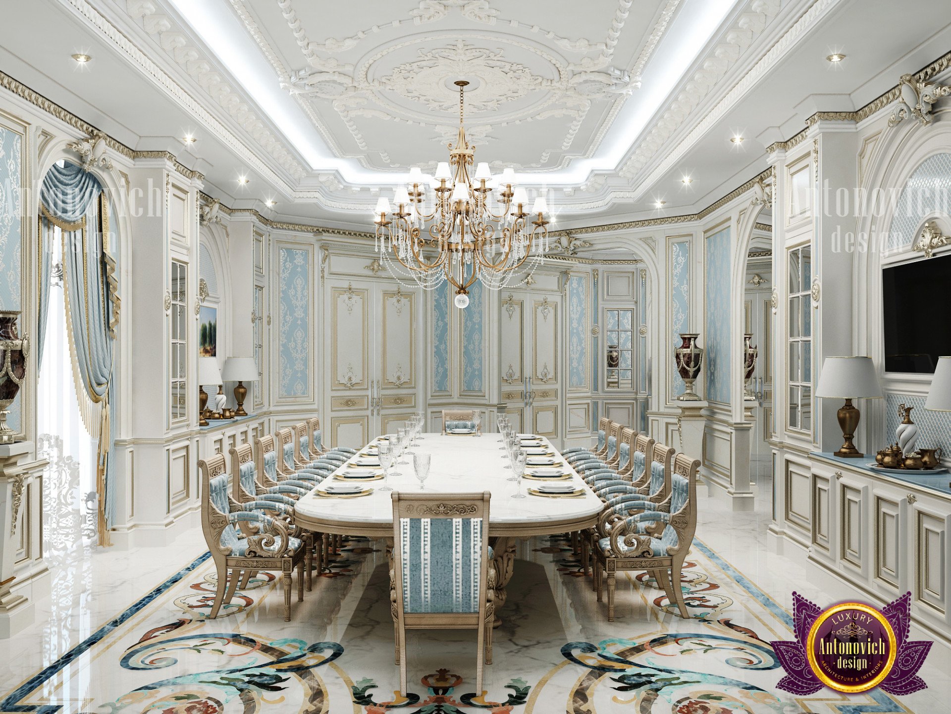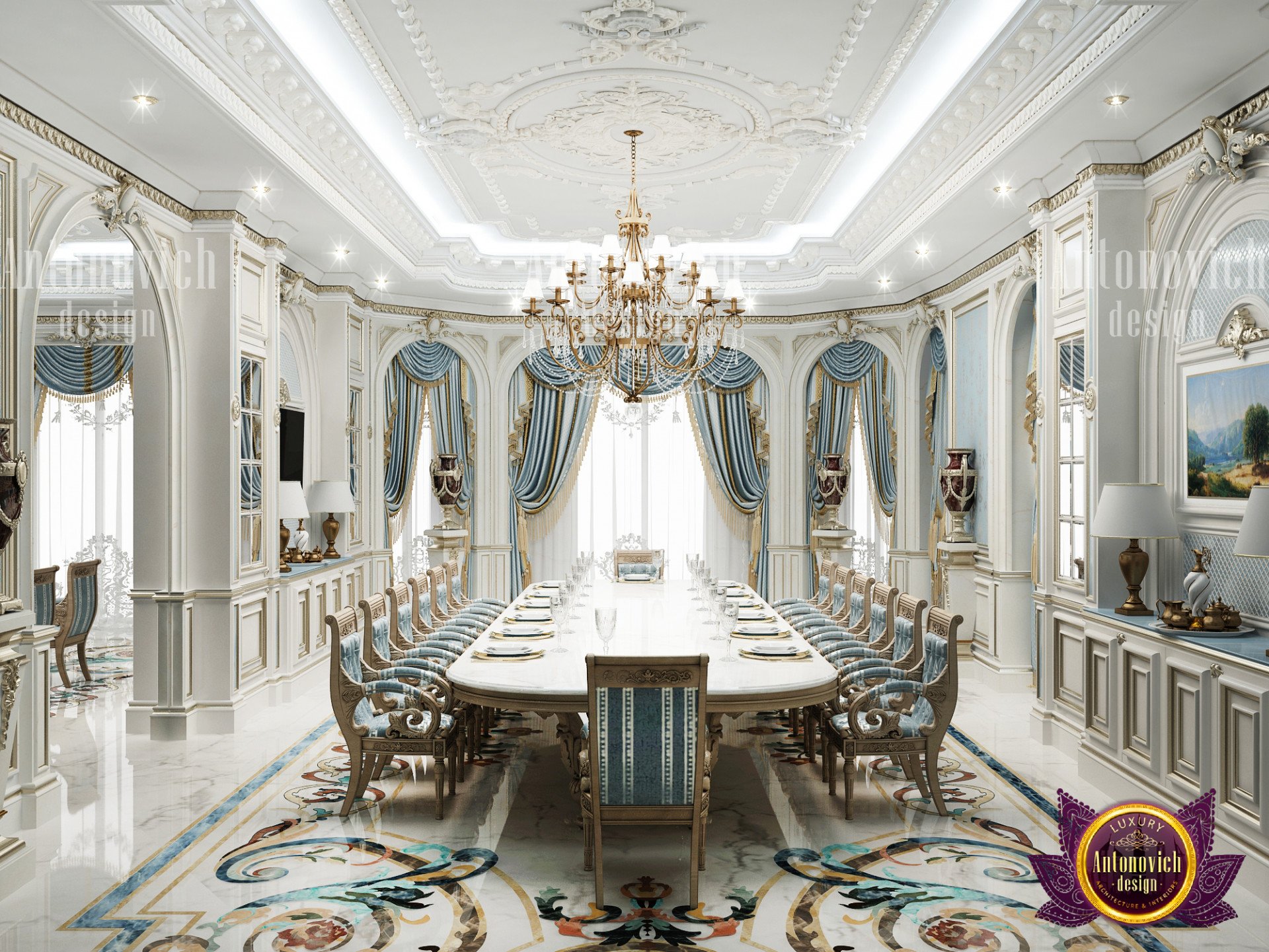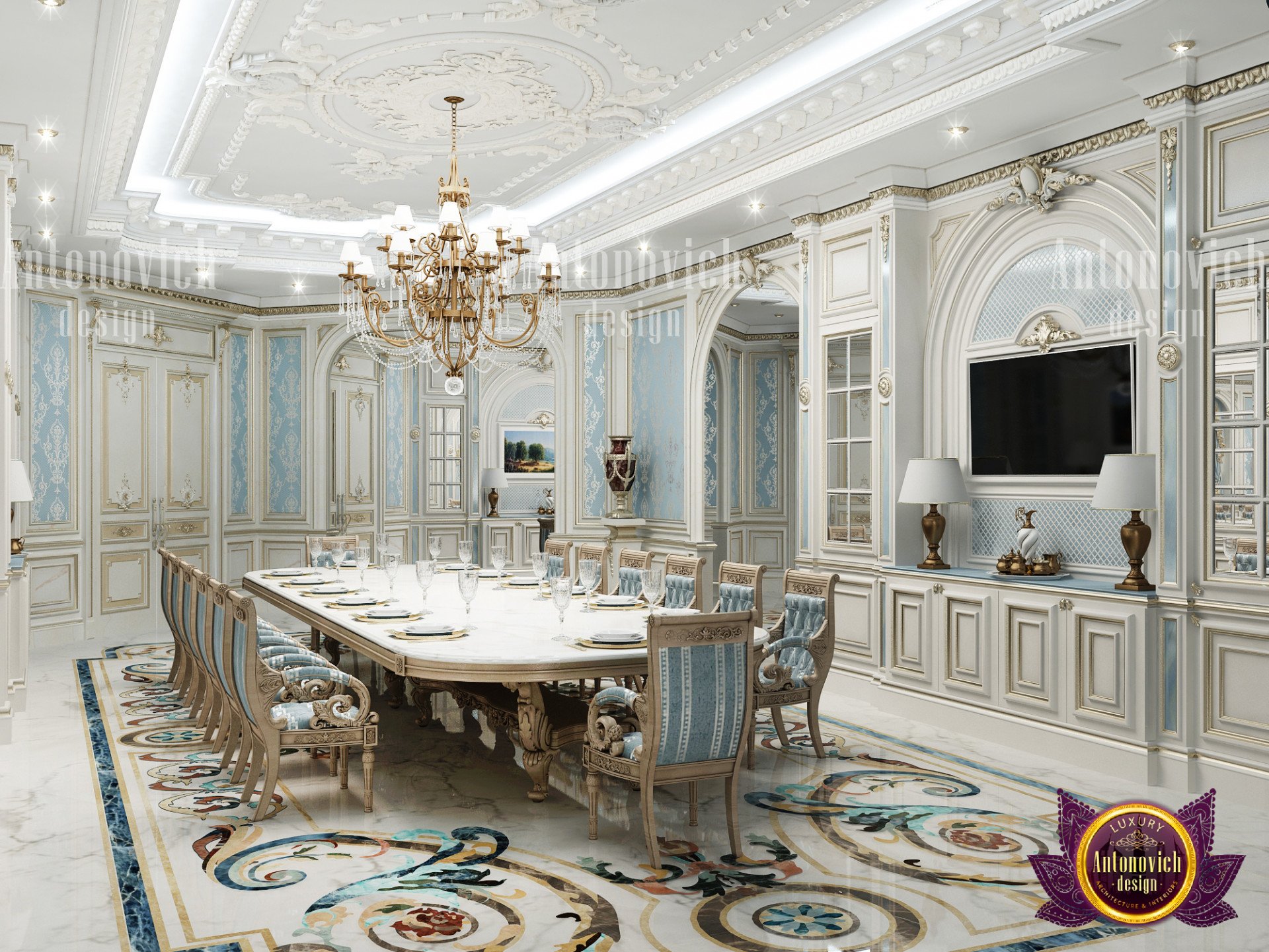 هذه غرفة طعام هادئة وفريدة لتسترخٍ وتتناول وجباتك المميزة. التصميم مصقول بديكور عصري وتركيبات تجعل المشهد أكثر جاذبية وروعة. التماثيل والثريا الكريستالية تخلق أجواءً مضيئة مدهشة في كامل الغرفة. إنها تكمل اللون الفاتح المائل للأزرق الذي يمنح المطابخ طابعاً رومانسيّاً أكثر لتناول الطعام. ميزة أخرى في هذا المطبخ هي الجدران ذات الطبعات الفيكتورية المخصّصة التي تعزز الطابع الكلاسيكي الذي تحمله ثيمة هذه المساحة. التنجيد مبطّن بالذهب ليحافظ على المظهر الفاخر والأنيق. كما يجعل التنجيد المظهر أكثر تخصيصاً وتميزاً. وللمساحات الأخرى مثل الحمامات، اطلع على تصميم حمامات مبتكر. أخبرنا إن أردت أنت مساعدة خبير لتصميم مطبخ أحلامك أو غرفة طعام فاخرة، واحجز استشارتك اليوم.