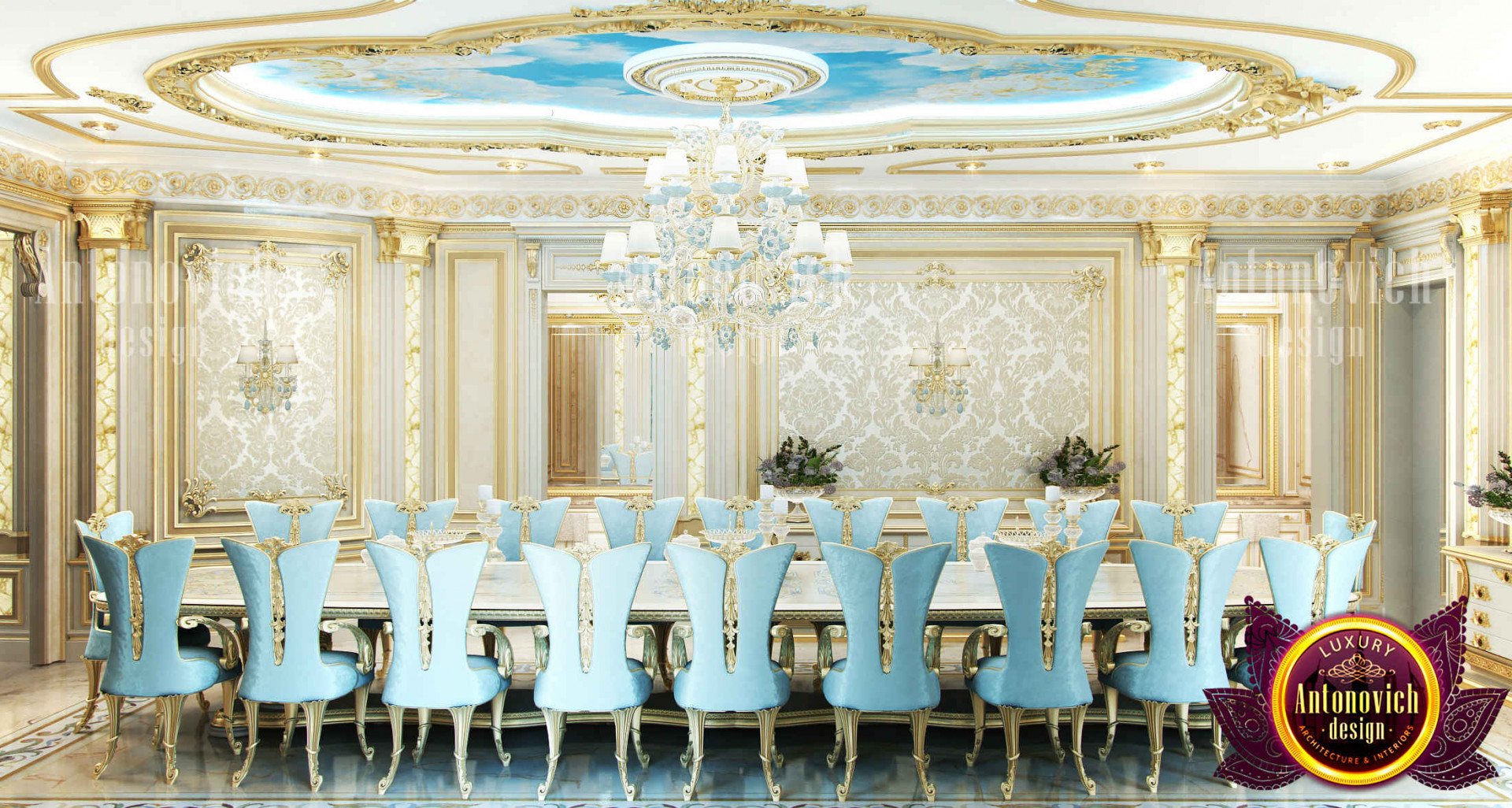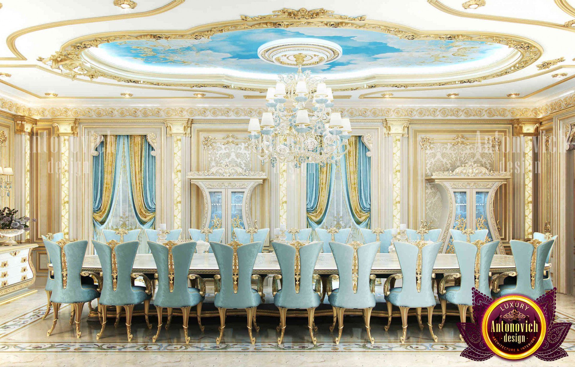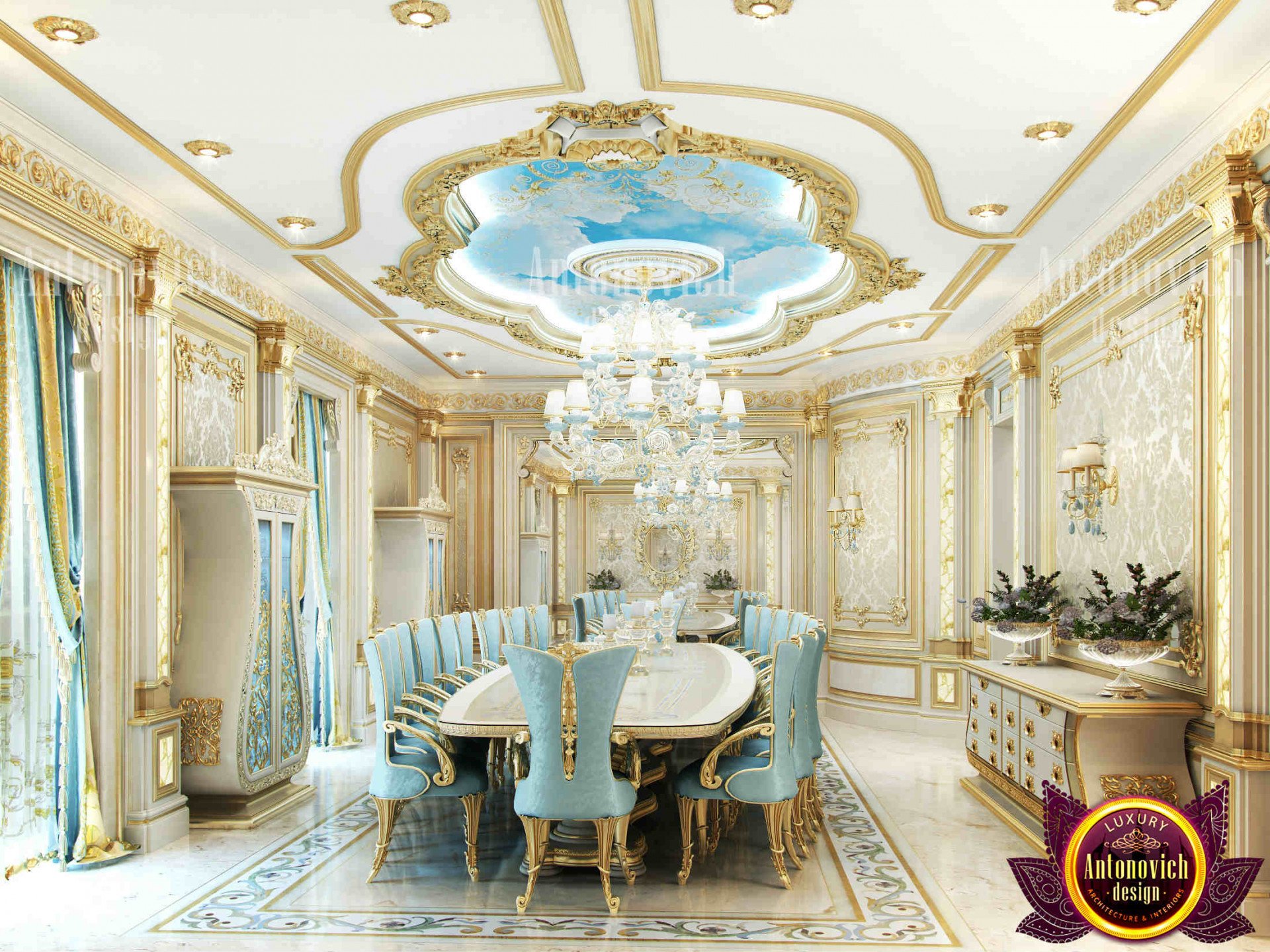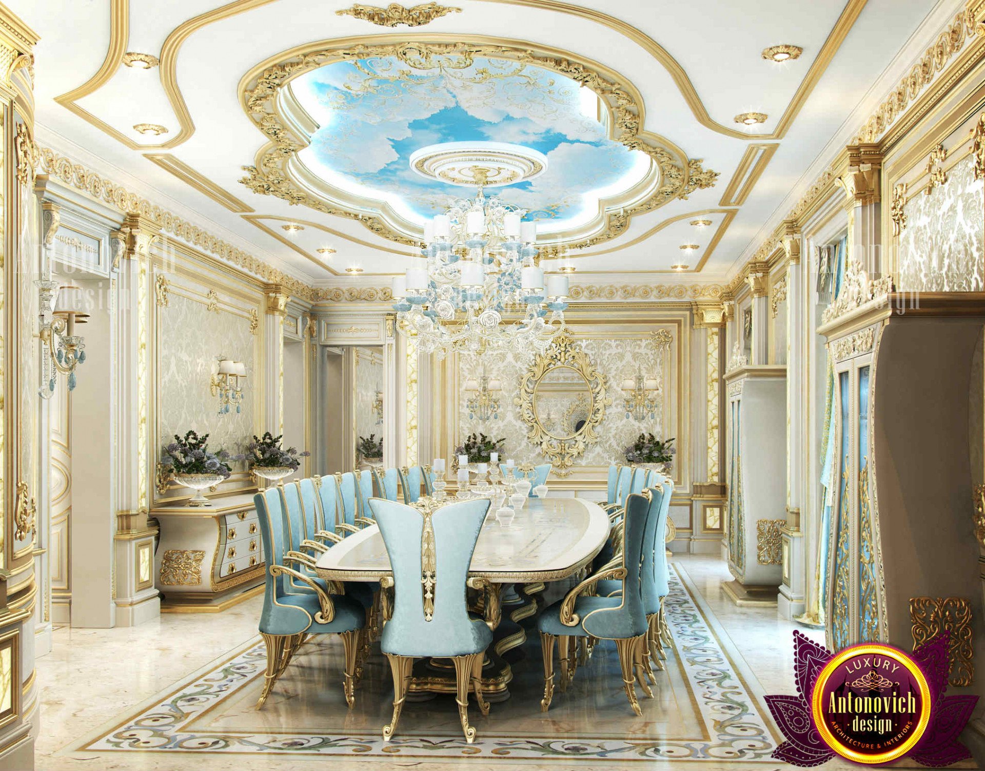 النوافذ في تصميم هذه الغرفة عالية ومغطاة بستائر مخملية فاخرة لغرفة الطعام مع تطريز ذهبي وتحزيمات أنيقة. للحصول على خيارات معالجة نوافذ حديثة يمكن الاطلاع على تصاميم الستائر العصرية. قرر مصممونا استخدام قطع أثاث ضخمة من الخشب المصقول من الأنواع النبيلة. لتعزيز الإضاءة قام فريقنا بتوزيع عدد كبير من المصابيح والمصابيح الجدارية؛ وتبرز إضاءة غرفة الطعام وثريا كريستال كقطعة مركزية تضفي على السقف طابعاً من الفخامة والبهاء، ويمكن الاطلاع على أفكار تصميم الأسقف الفاخرة.