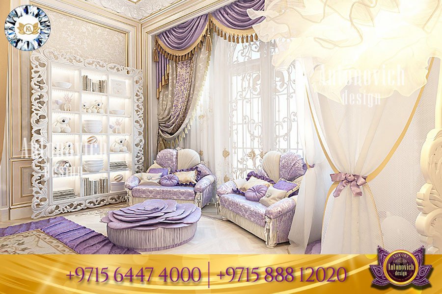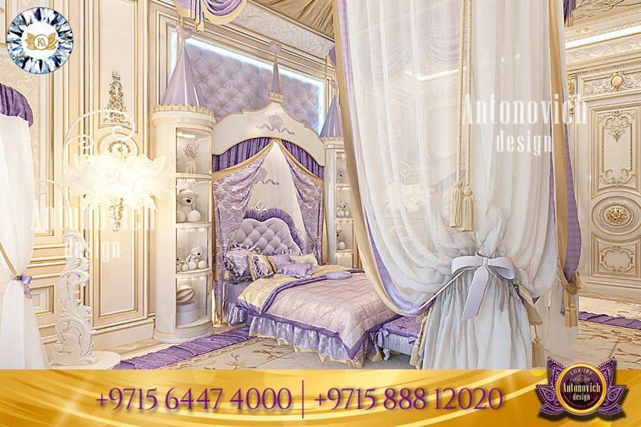 غرفة نوم بطابع أميرة باللون الأرجواني كانت مصدر الإلهام في هذا المشروع لغرفة أطفال. وبما أنها جزء من مفهوم التصميم الداخلي السكني الكلاسيكي، نفَّذت أنطونوفيتش ديزاين (Antonovich Design) تصميماً مميزاً يقدّم إحساساً أميرياً مع الحفاظ على انسجام الديكور مع المفهوم السكني الكامل، كما نفّذت مشاريع مثل تصميم بيركيلي. مخطط فيلا فاخر. عادةً ما تكون مساحة غرفة الأطفال محدودة في التصاميم الداخلية، ومع ذلك فإن هذا تصميم غرفة أطفال بمساحة واسعة بطابع أميرة أرجوانية يتمتع بمساحة كافية لخلق ديكور خيالي وإعداد داخلي أشبه بالقصص.