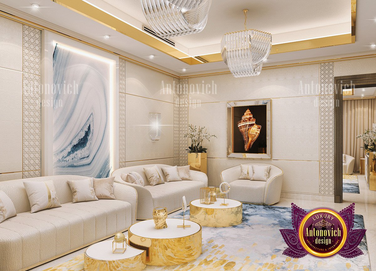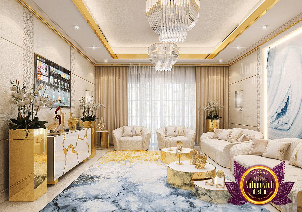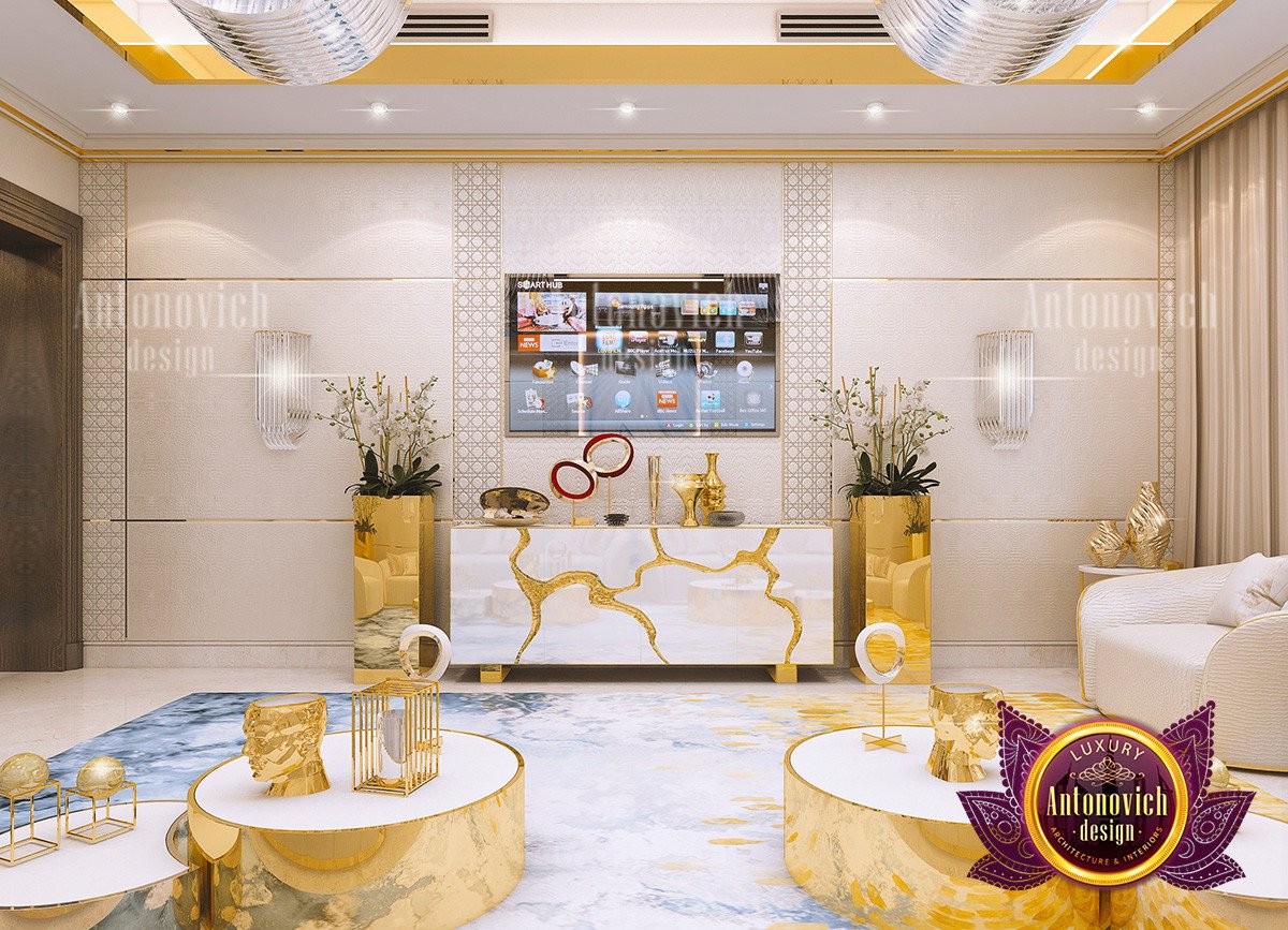 الأثاث في هذه الغرفة من الدرجة الأولى. تصاميم عالمية صُممت لأرقى الأذواق. لا تحبطك المساحة الصغيرة؛ المساحات الأصغر لا تعني فقدان الفخامة. بل تتطلب دراسة إضافية أمكن لأنطونوفيتش ديزاين تحقيقها. في الجانب الآخر من الغرفة يوجد جهاز التلفاز مع رف وخزانة باللونين الأبيض والذهبي — قابلة للتصميم حسب أفضل تصميم لخزائن الطعام في الإمارات. الأنماط جذابة والتركيبة متناغمة.