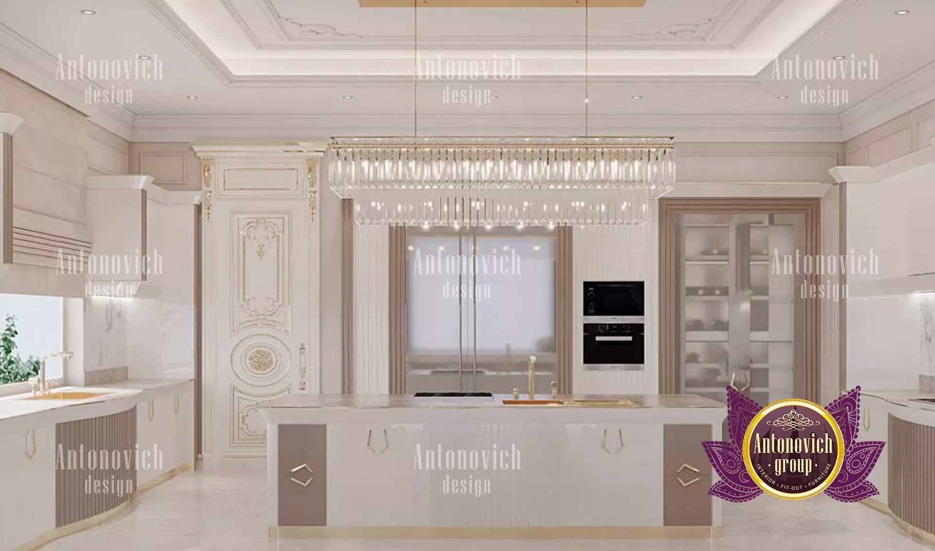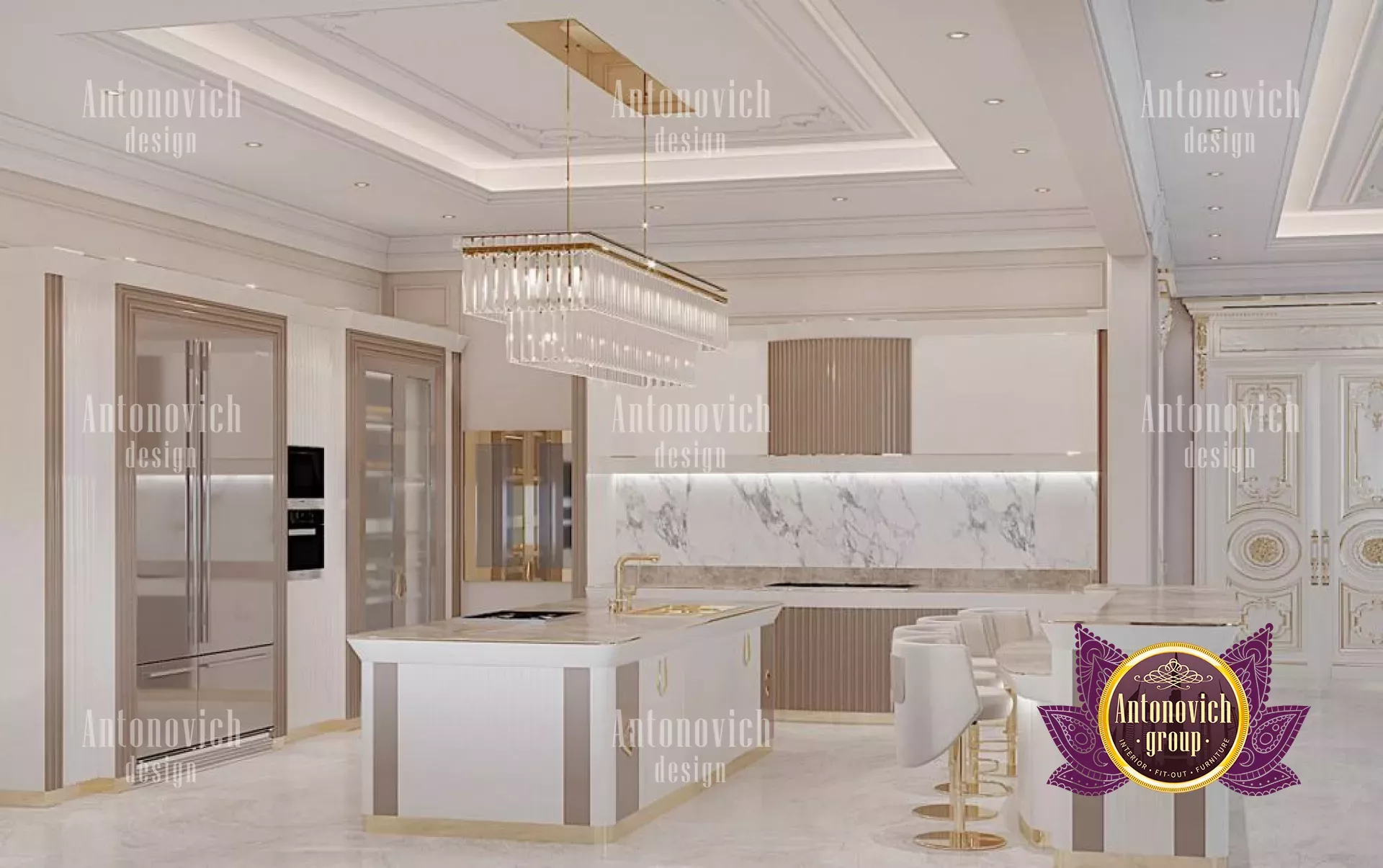 كما يشتمل تصميم المطبخ الفاخر على أثاث فخم ورفيع المستوى. يتم وضع أثاث مطبخي عالي الجودة من دبي بعناية في زوايا المكان الأربع لإكمال الديكور. تُعد الإضاءات الممتازة جزءاً أساسياً من التصميم؛ فثريا كبيرة تضفي طابعاً ثرياً على المساحة، بينما تعزز الإضاءات المحيطة الجو العام الفاخر. الأنماط والزخارف في تصميمات المطبخ الفاخرة جميلة بلا شك؛ الانحناءات والدوائر تنفّذ بإتقان. الأثاث البسيط والأنيق يكمل أيضاً أفكار تصميم داخلي لمطبخ فاخر المعاصرة ويخلق توازناً مع المظهر المعاصر. لمسات خشبية فاتحة على الرفوف والخزائن تضفي على التصميم إحساساً عصرياً، بينما تتناغم انسيابية الثريات مع النغمة العامة لتصاميم المطبخ الفاخرة. تبرز الخطوط الذهبية شعوراً بالغنى والفخامة، وتُكمل الإضاءة الرائعة أجواء المكان. الخطوط الجريئة والنظيفة تخطف الأنظار ولا تجعل النتيجة تقليدية ضمن إطار الحداثة. تضم أفكار وتنفيذ تصميم مطبخ فاخر أجهزة مدمجة صممت خصيصاً لتكمل المظهر العام وتبقى عناصر عملية وجذابة في آنٍ واحد، مع توظيف مبادئ تصميم المنزل الذكي لتكامل الأجهزة.