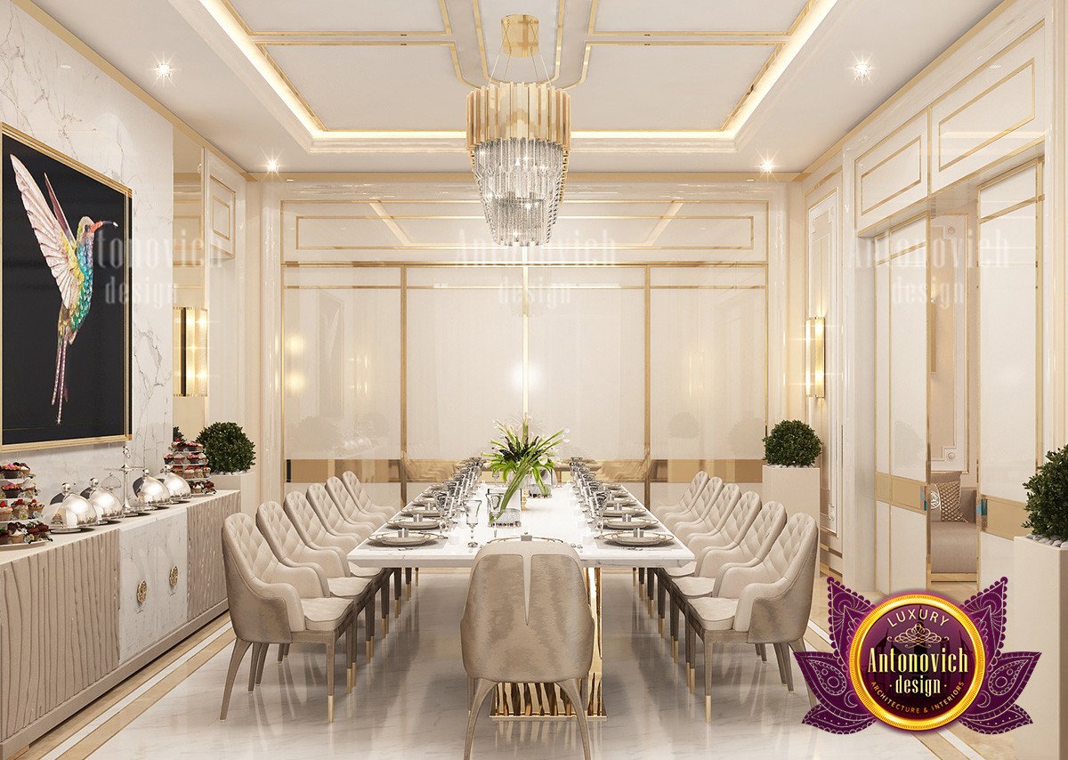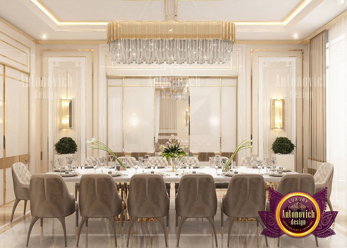 في التصميم الداخلي المعروض في هذا المقال ستلاحظ الاستخدام الواسع للون الذهبي؛ لون فاخر ومهدئ يمنح التصميم الداخلي أناقة وغنى. يتم مزاوجة الذهبي مع اللون البني والأبيض الشاحب، ما يوفر التوازن المطلوب بين الظل والنور الذي تحتاجه منطقة الطعام. هذه المجموعات تبرز كمزيج ألوان غرفة الطعام متوازن يُعزز الإحساس بالفخامة. وللمزيد من أفكار الألوان للمطابخ والمنزل راجع أفكار واتجاهات ديكور المنزل.