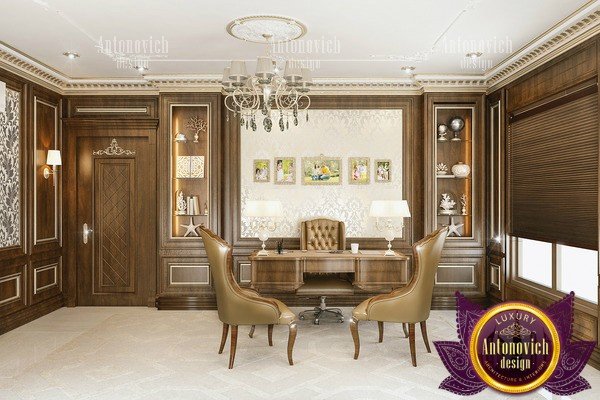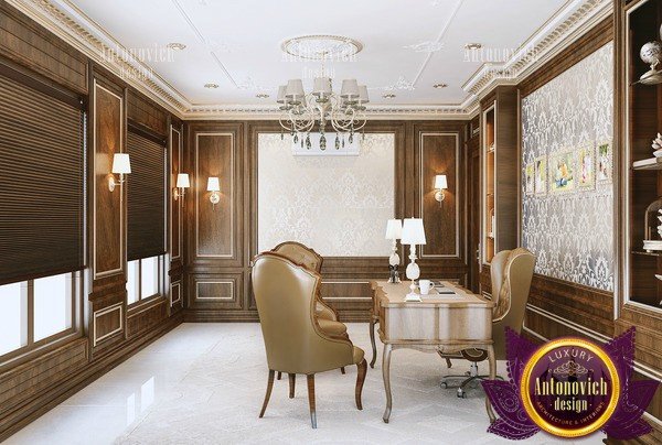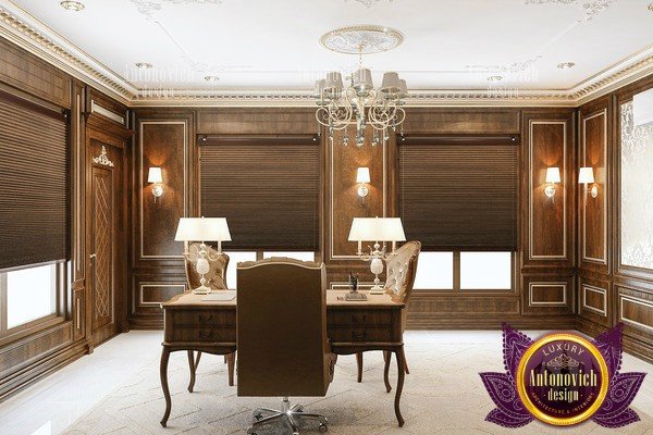 أول ما ينتبه له الضيف عند دخوله المكتب هو الطاولة. التي تبدو رائعة ومريحة وواسعة. كان من المهم بنفس القدر اختيار الخزانات والأرفف والرفوف المناسبة بحيث يمكن وضع جميع المستندات ومواد الديكور في الأماكن المناسبة. يتم اختيار الطاولة وبقية الأثاث المنجد على شكل كراسي بذراعين منجد بالجلد البني الفاتح في المكتب بنفس الأسلوب. اقترب مصممو لاكجري أنتونوفيتش من اختيار الإضاءة بكفاءة - استخدموا ثريا كلاسيكية بظلال أصلية وعناصر زخرفية ، بالإضافة إلى شمعدانات جدارية جميلة وأضواء كاشفة لخلق جو مشرق.