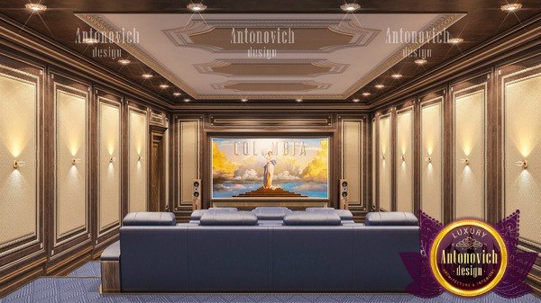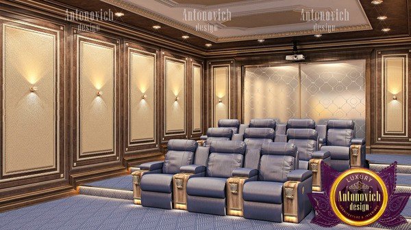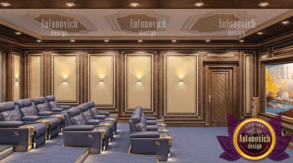 يحمل تركيب الجدران وسقف الغرفة التي توجد بها السينما المنزلية أهمية جمالية ووظيفية. حيث يعتمد المظهر العام للسينما وخصائصها الصوتية على نوع مواد التجهيز على أسطح الجدران والسقف. اختار المصممون لدينا الخشب لتزيينهم - وهو مادة طبيعية دافئة تبدو فاخرة ومريحة في الوقت نفسه في السينما المنزلية من لاكشري أنتونوفيتش ديزاين. و للقيام بذلك ، كان على مصممنا أن يلعب بلونه وملمسه ، وأن يضيف المنحوتات والقوالب والتذهيب والتلوين. ونتيجة لذلك ، حصلنا على تصميم داخلي فريد للسينما .