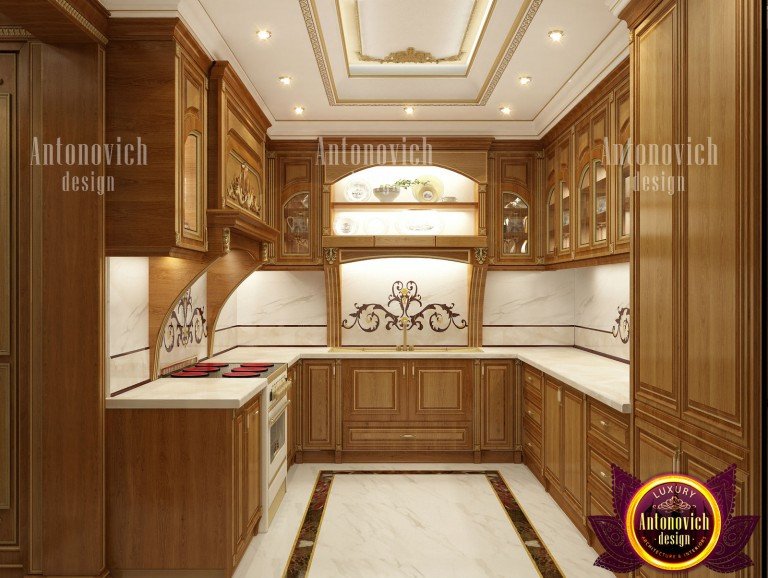 ونظرًا لشدة العملية، فإن الأرضيات في منطقة الطهي متينة ومقاومة للرطوبة وسهلة التنظيف وغير زلقة. يمكن تسمية هذه الأرضية الرخامية من تصميم لاكشري أنطونوفيتش بالتصميم التقليدي للداخلية للمطبخ بأسلوب كلاسيكي. تم صنع البلاط الرخامي المستخدم في هذا المشروع بدرجات اللون البيج ، كما أن الحواف الداكنة حول محيط المطبخ بنسيج رخامي تجعل الأرضية متناقضة. تجهيزات الأرضيات في هذه الحالة تعكس زخرفة الجدران. تم تزيين جدران المطبخ ذات اللون البيج الفاتح بضفائر القهوة وظلال الشوكولاتة ، والتي تعكس اللون مع الأثاث الخشبي الكلاسيكي مع واجهات مزخرفة. يقترح التصميم الداخلي الكلاسيكي للمطبخ ضبط النفس والديكور المعتدل والصارم ، لذلك ، فإن التصميم المقتضب مع كورنيش السقف ، المزين بالنقوش والتذهيب ، يناسب تمامًا تركيب السقف.