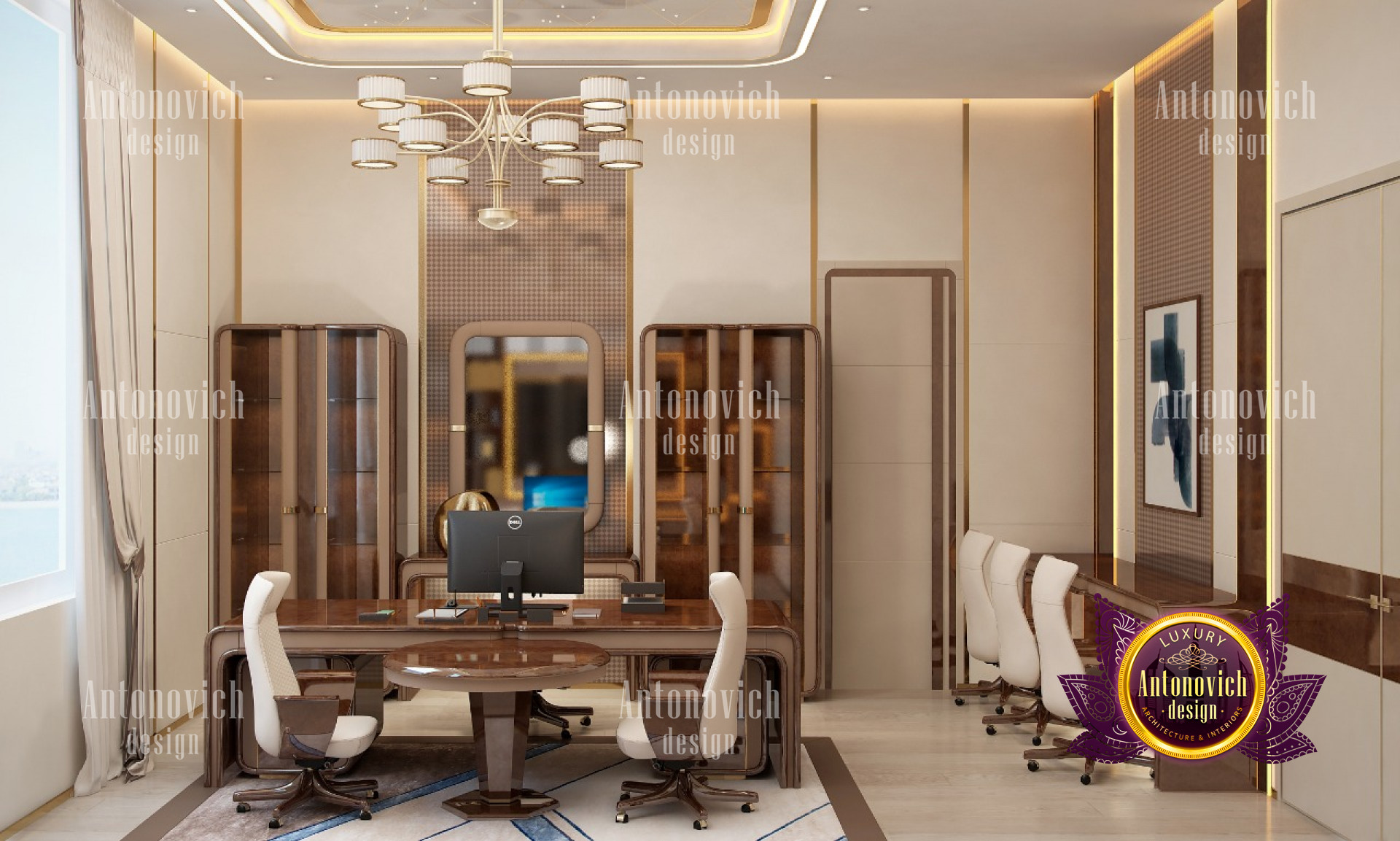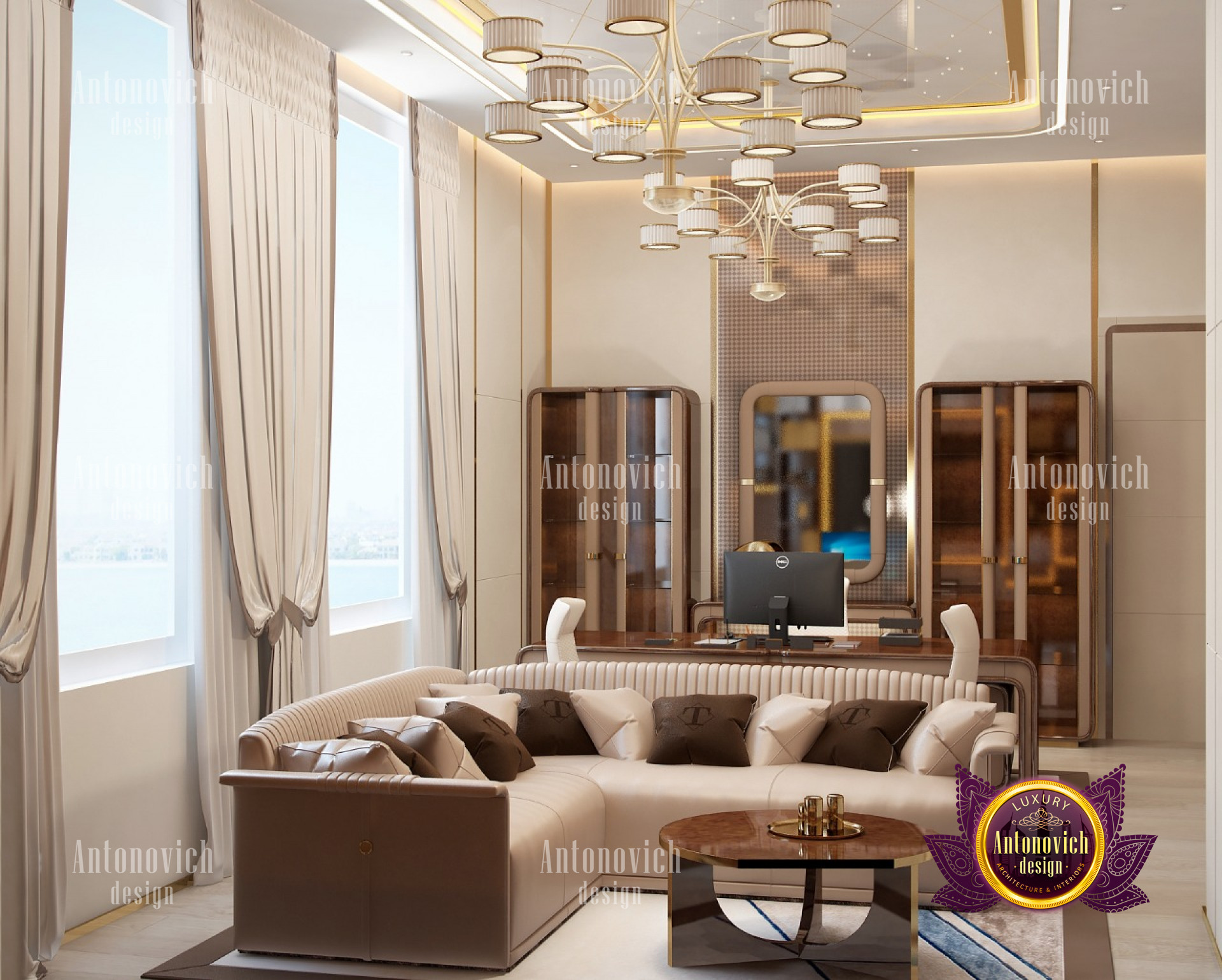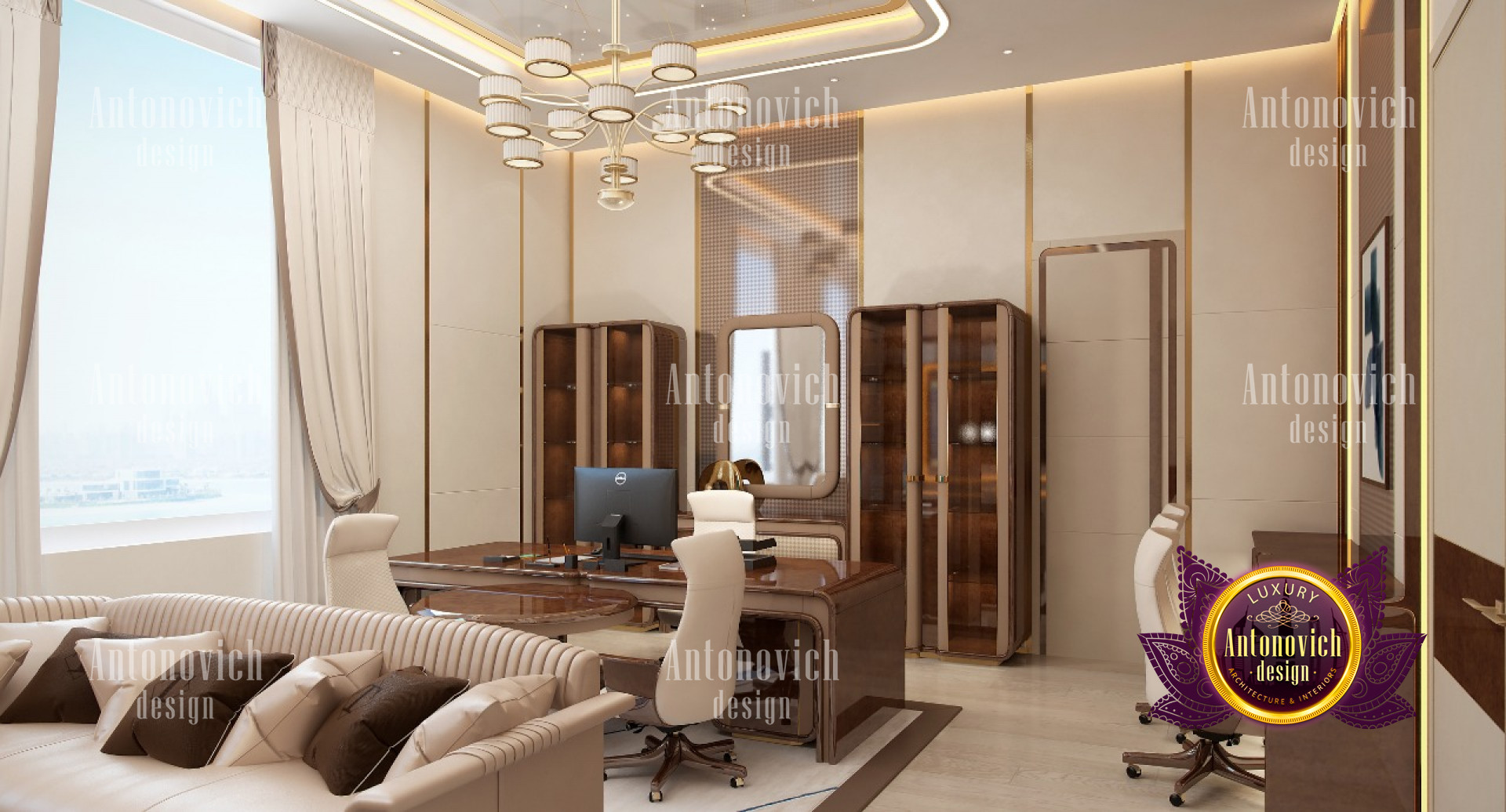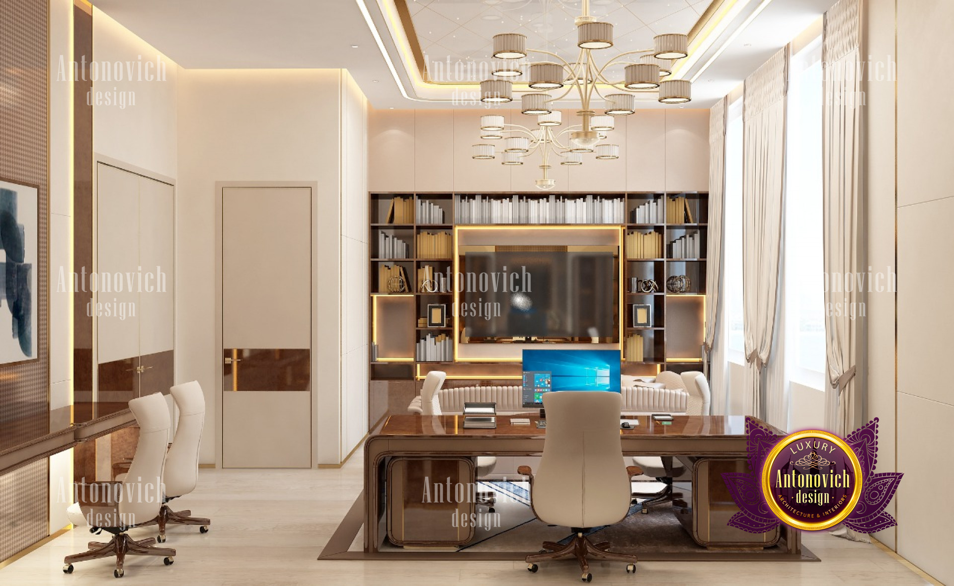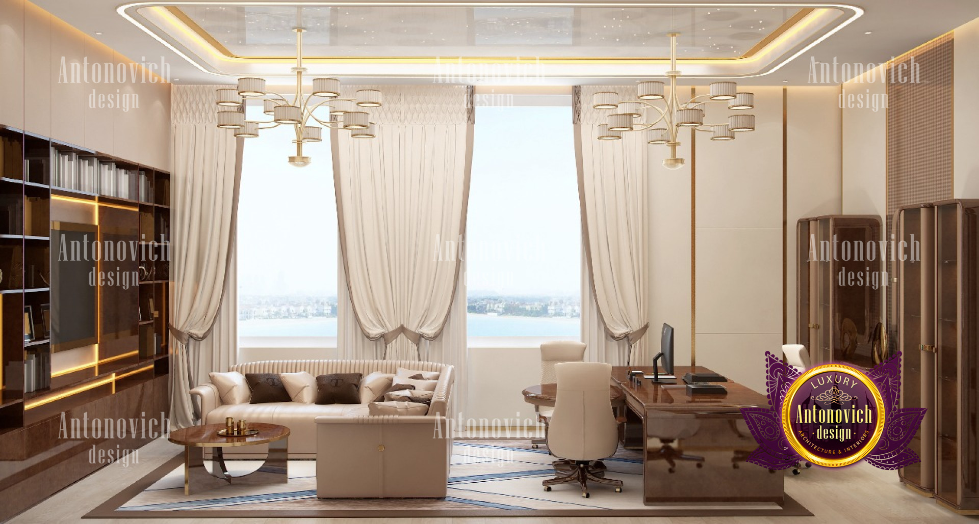 هل تبحث عن خدمة تصميم داخلي في كمبوديا؟ يمكن أن يساعدك تصميم أنتونوفيتش الفاخر في جعل التصميم الداخلي لمكتب المنزل الفاخر الذي تحلم به! هذا التصميم الداخلي ذو اللون البني المذهل به الكثير من الرقي. تحتوي الغرفة الضخمة على أثاث مذهل حيث يمكنك استقبال ضيوفك. تم بناء الطاولات وكراسي المكتب جيدًا بحيث يخلق هذا مظهرًا أنيقًا للتصميم الداخلي الفاخر للمكتب المنزلي.