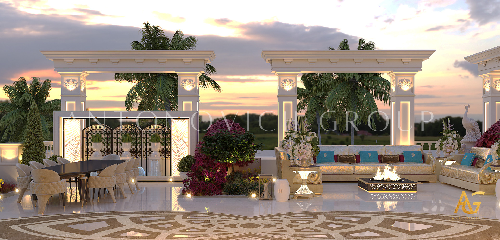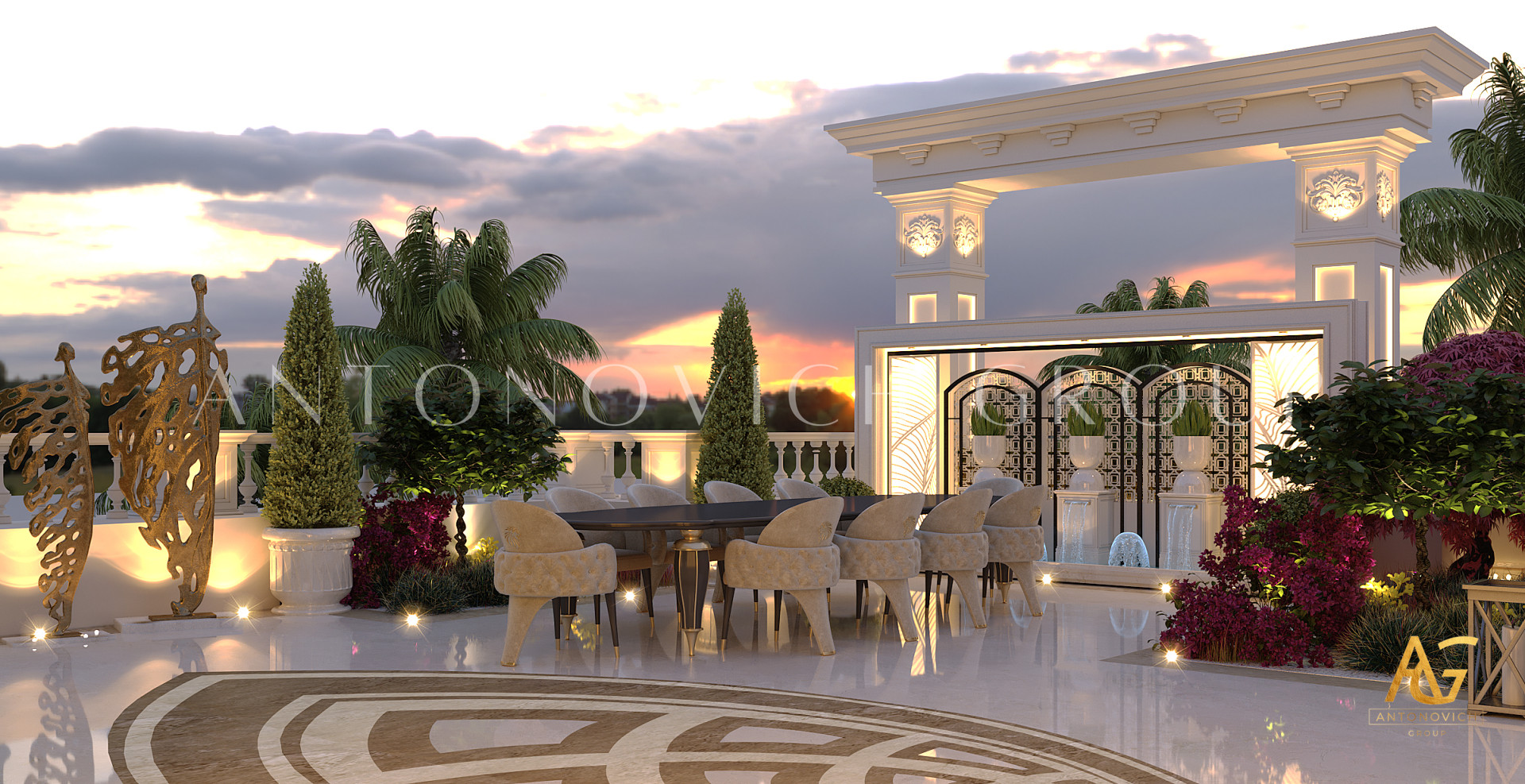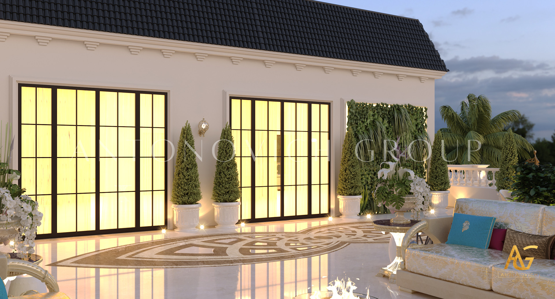 لا ينتهي التزيين الفاخر في الداخل. من الميزات المائية وإضاءة الحدائق إلى ترتيبات الجلوس الخارجية، تخلق مجموعة أنتونوفيتش مناظر طبيعية جذابة تمتد بأناقة الفيلا إلى الطبيعة.