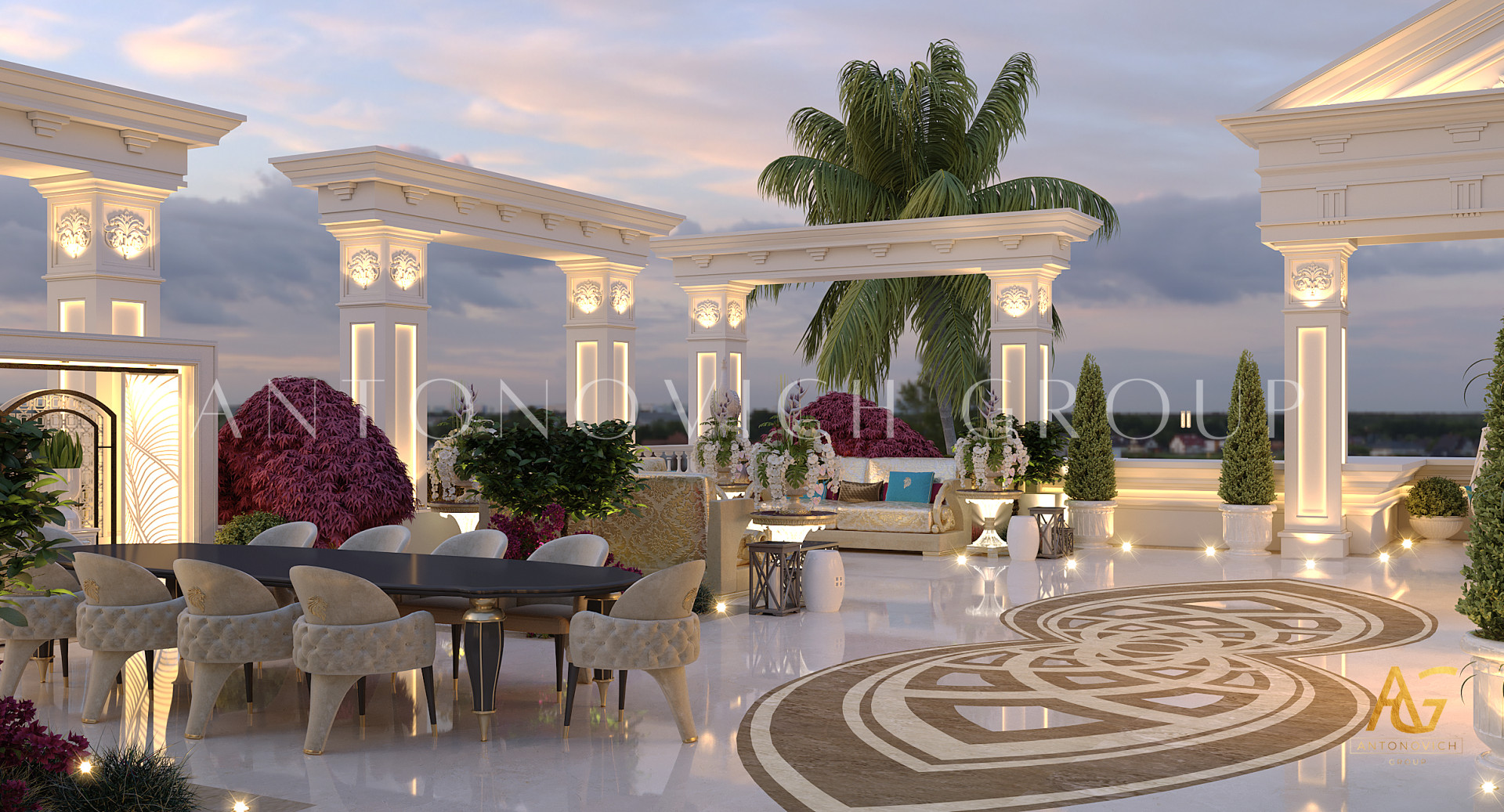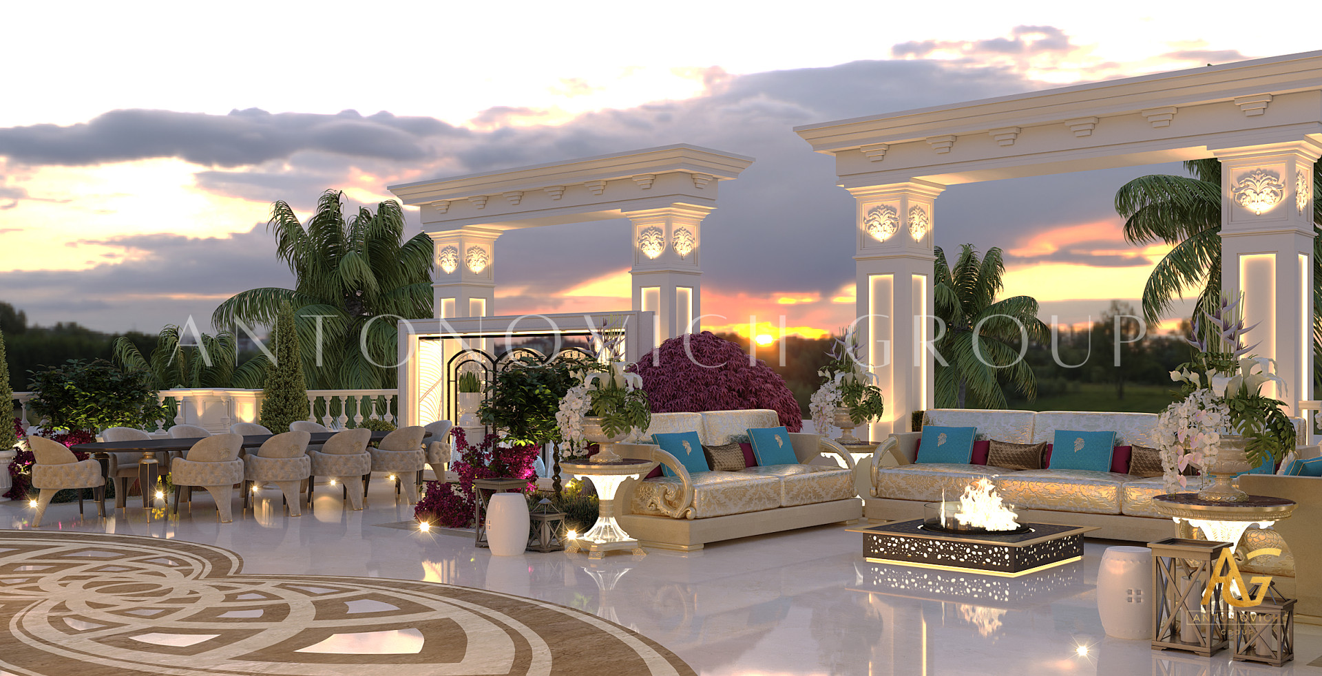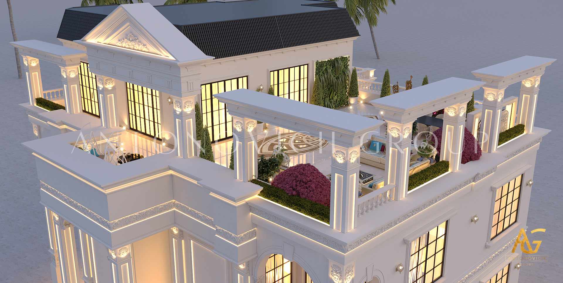 لا ينتهي التزيين الفاخر في الداخل. من الميزات المائية وإضاءة الحدائق إلى ترتيبات الجلوس الخارجية، تخلق مجموعة أنتونوفيتش مناظر طبيعية جذابة تمتد بأناقة الفيلا إلى الطبيعة.