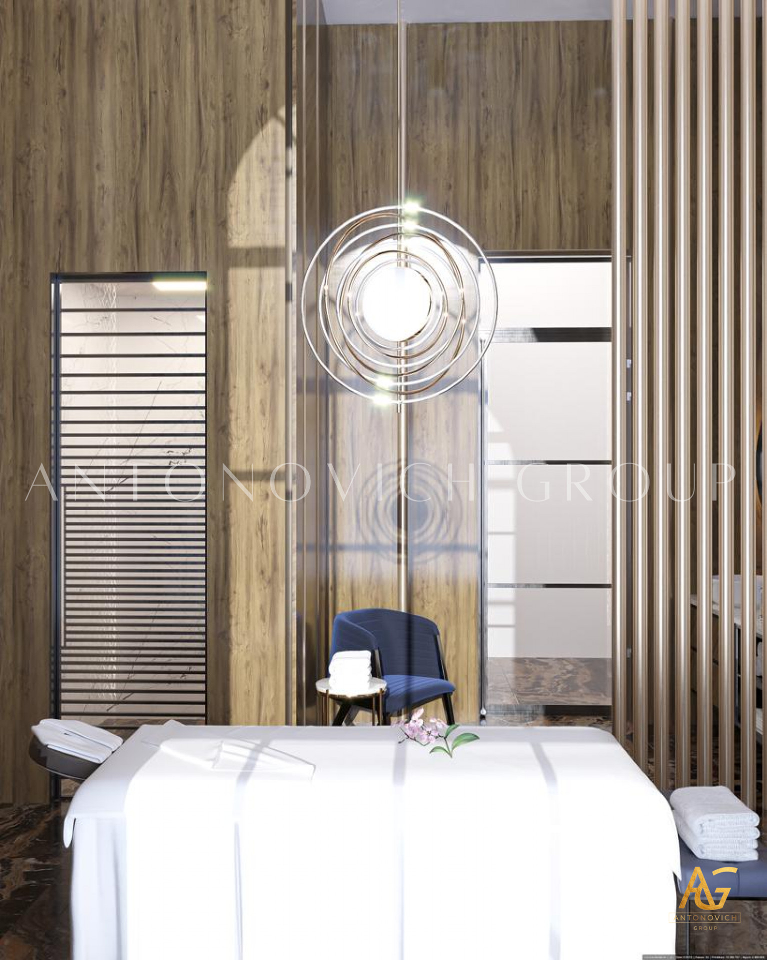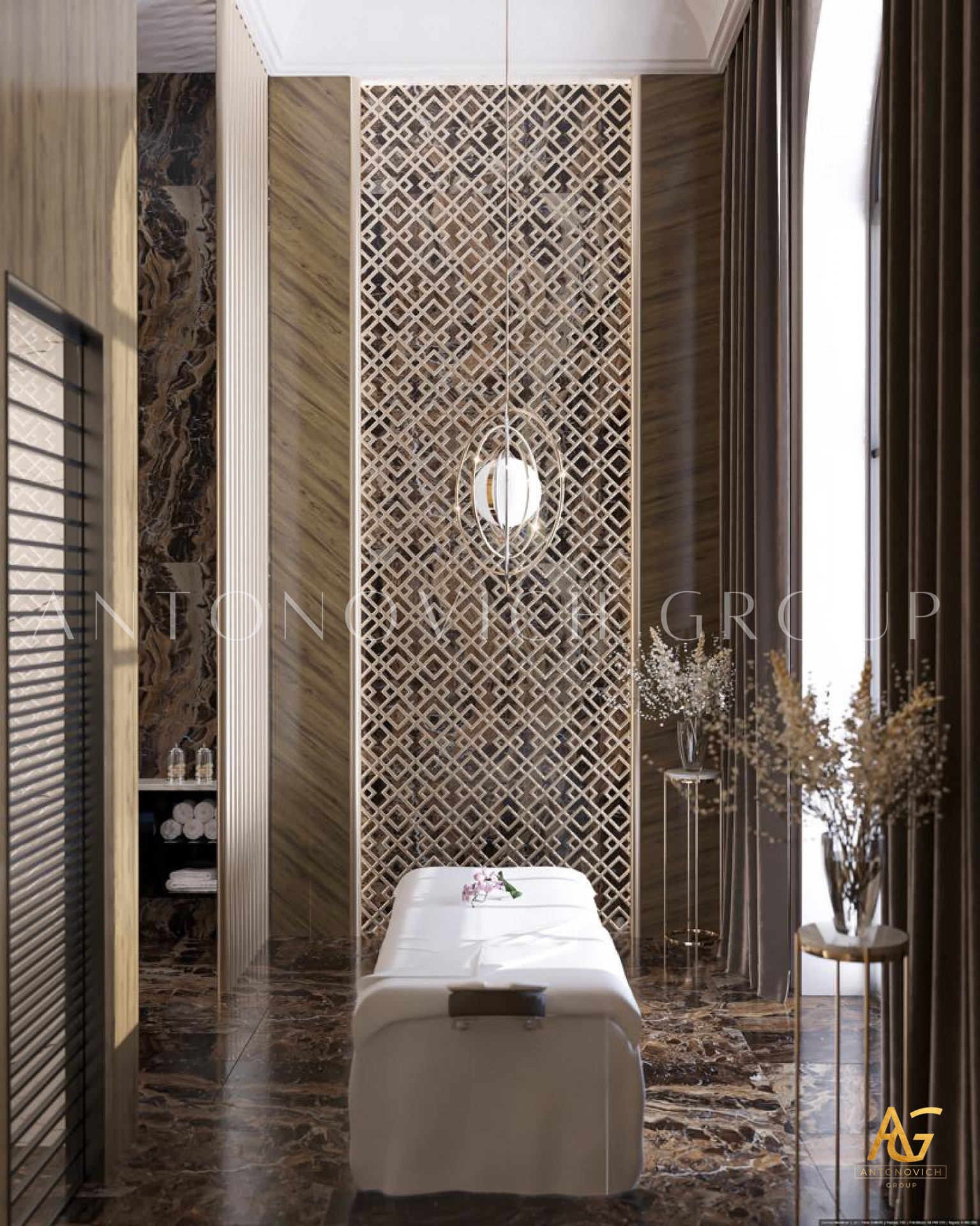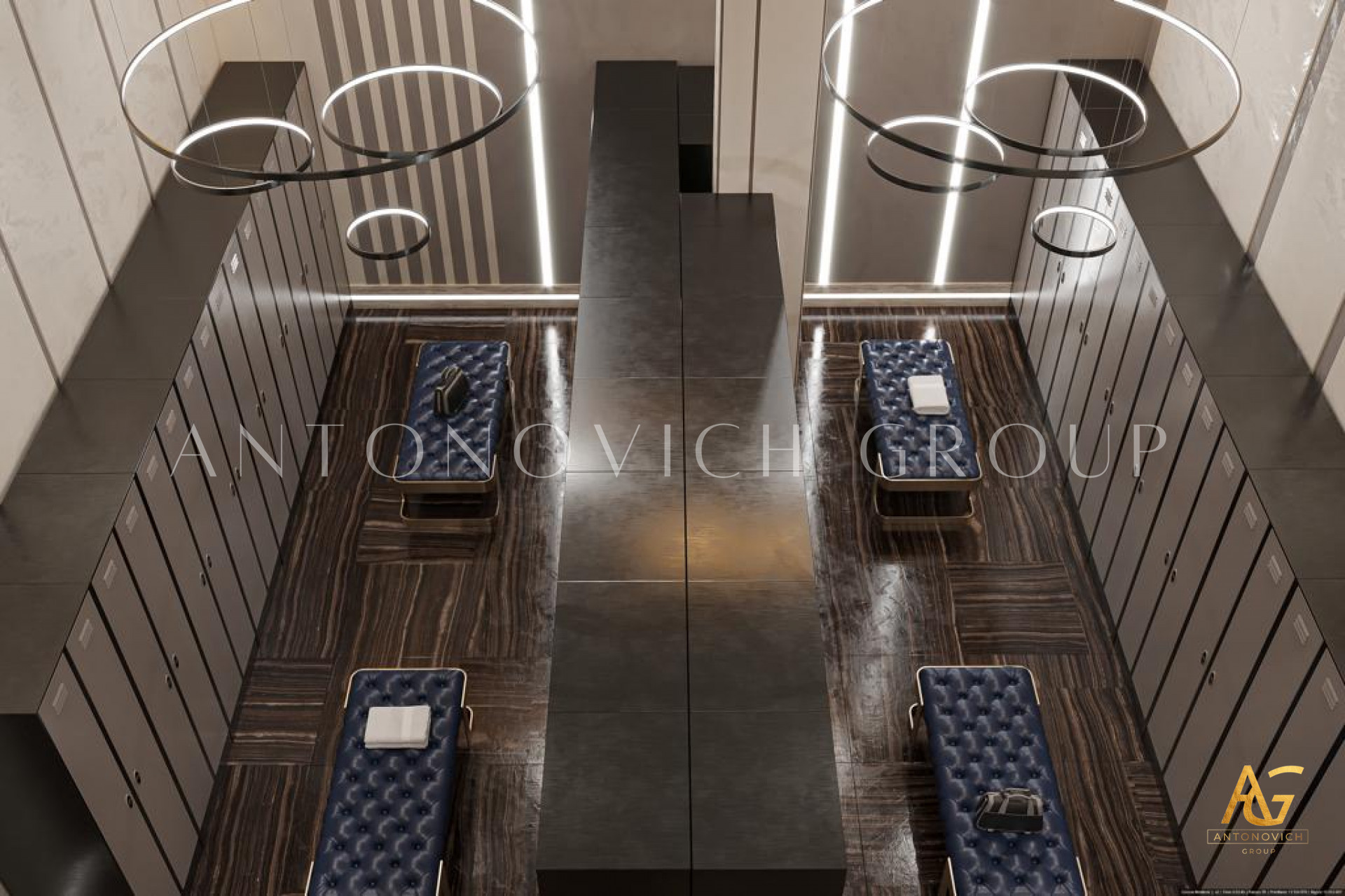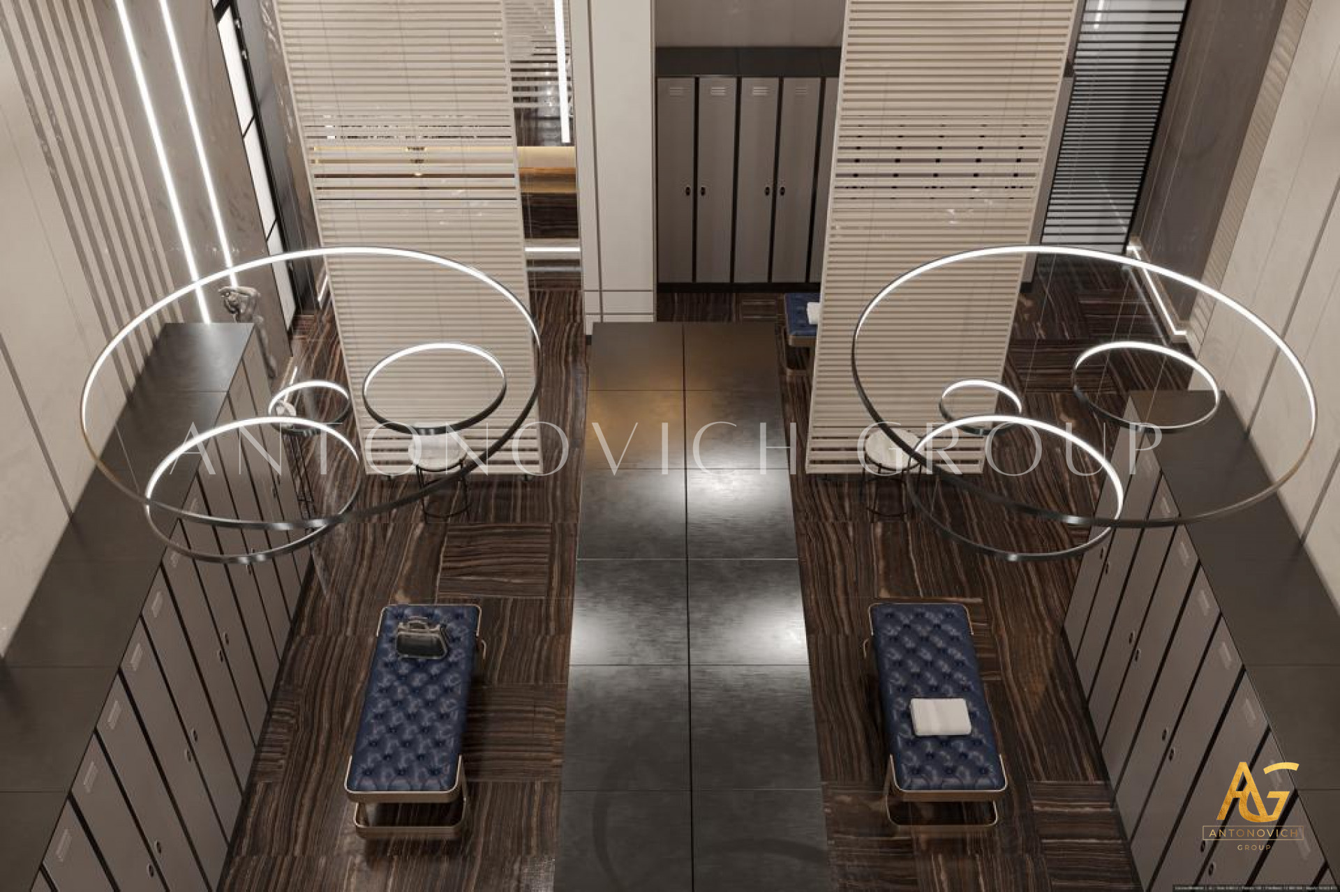 إن غرفة تبديل الملابس في التصميم الداخليفي الامارات هي واحدة من أكثر الأماكن استخدامًا في السبا. لذا يجب أن يكون المنتجع الصحي ، مثل هذا الديكور الداخلي الفاخر في دبي ، الذي أنشأته شركة شركة تجهيز السبا المشهورة عالميًا لاكشري انتونوفيتش ديزاين مع أفضل مصممي الديكور الداخلي في دبي فانه تصميم داخلي فسيحًا ومرتبًا. وينضح التصميم الداخلي الفاخر والمتطور في دبي بأجواء جميلة وأنيقة ويشتمل التصميم الداخلي المذهل للسبا على مجموعة متنوعة من الأنماط التي تعمل معًا لإنشاء عمل فني. فإنه مثل متحف ، ولكن مع التركيز على التصميم الداخلي الراقي. أحد الجوانب الأكثر لفتًا للانتباه في تصميم المنتجع الصحي الحديث هذا هو المزيج الرائع من اللون البني والأسود والإضاءة الصحيحة. حيث يعد مفهوم اللون الأسود من خلال الجدران والديكورات أحد مجالات التركيز الأساسية لتصميم السبا الحالي. تجمع لاكشري أنطونوفيتش ديزاين ، مع أفضل مصممي الديكور الداخلي في دبي ، بين المواد الفاخرة التي تم تشطيبها بتفاصيل مصنوعة خصيصًا لتعزيز تعقيد وأناقة هذا التصميم الداخلي الحديث.
