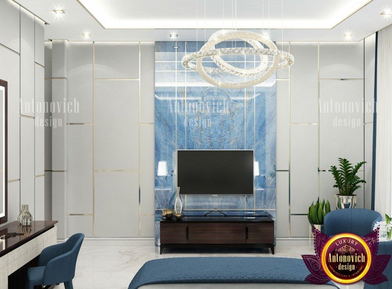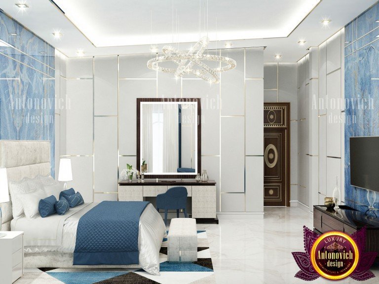 لاستكمال التصميم الداخلي لغرفة النوم الفاخرة بكفاءة ، اختار مصممينا الأثاث الرائع والجميل. يعتبر السرير هو العنصر الرئيسي في أي غرفة نوم ، والتي تحدد هدفها الرئيسي. سرير أنيق مع اللوح الأمامي عالي المنجدة في المخمل الأبيض ، مجموعة مذهلة من الكراسي باللون الأزرق الملكي الغني ، أصداء تقليم لهجة الجدار. أثاث خشبي باهظ الثمن على شكل وحدة تحكم وطاولة لارتداء الملابس تتناغم بشكل متناسق مع الصورة المشرقة الشاملة للغرفة. .