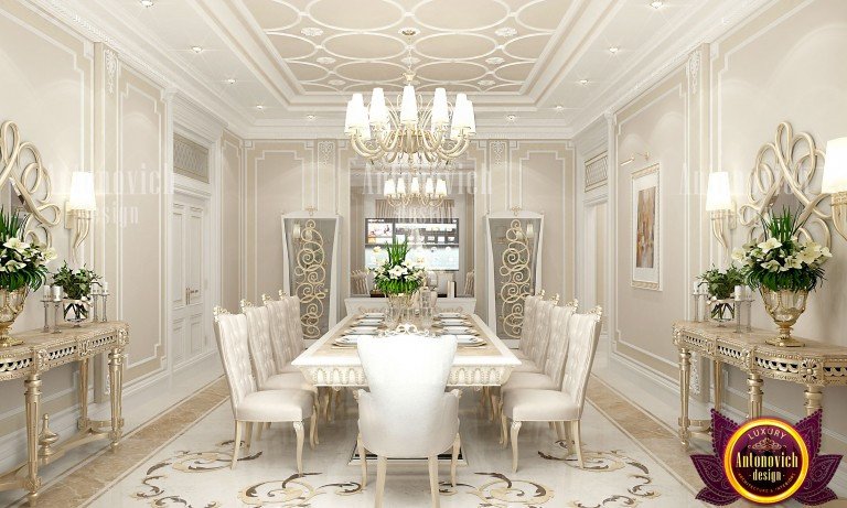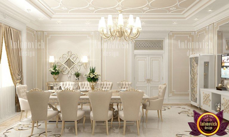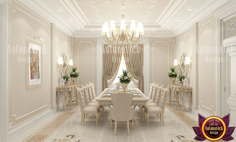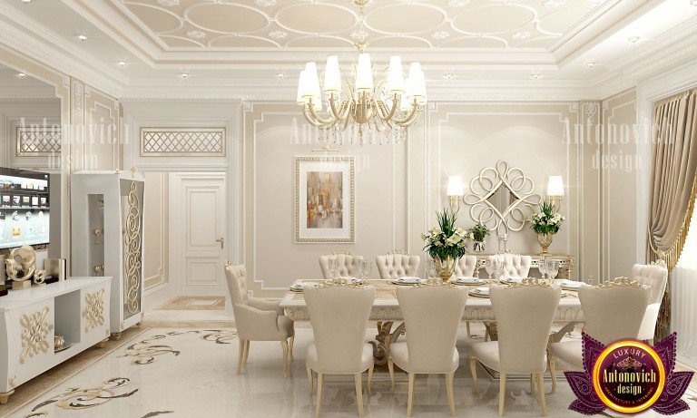 تحولت غرفة الطعام في نمط الكلاسيكية الحديثة ، بطريقتها الخاصة غير عادية، خفيفة وجيدة التهوية، تجذب الانتباه. كانت فكرة المصممين من أنتنوفيش للتصميم الفاخر كرة أصلية - بالنسبة لغرفة الطعام ، اختاروا عناصر زخرفية ومثيرة للاهتمام: القوالب الجصية ، العناصر الكلاسيكية ، الطنف والعناصر الزخرفية المنحوتة المزخرفة التي يمكن تتبعها على الأرضية الرخامية في الشكل من السجاد حول منطقة الطعام ، وعلى عناصر الأثاث المذهب المنحوت