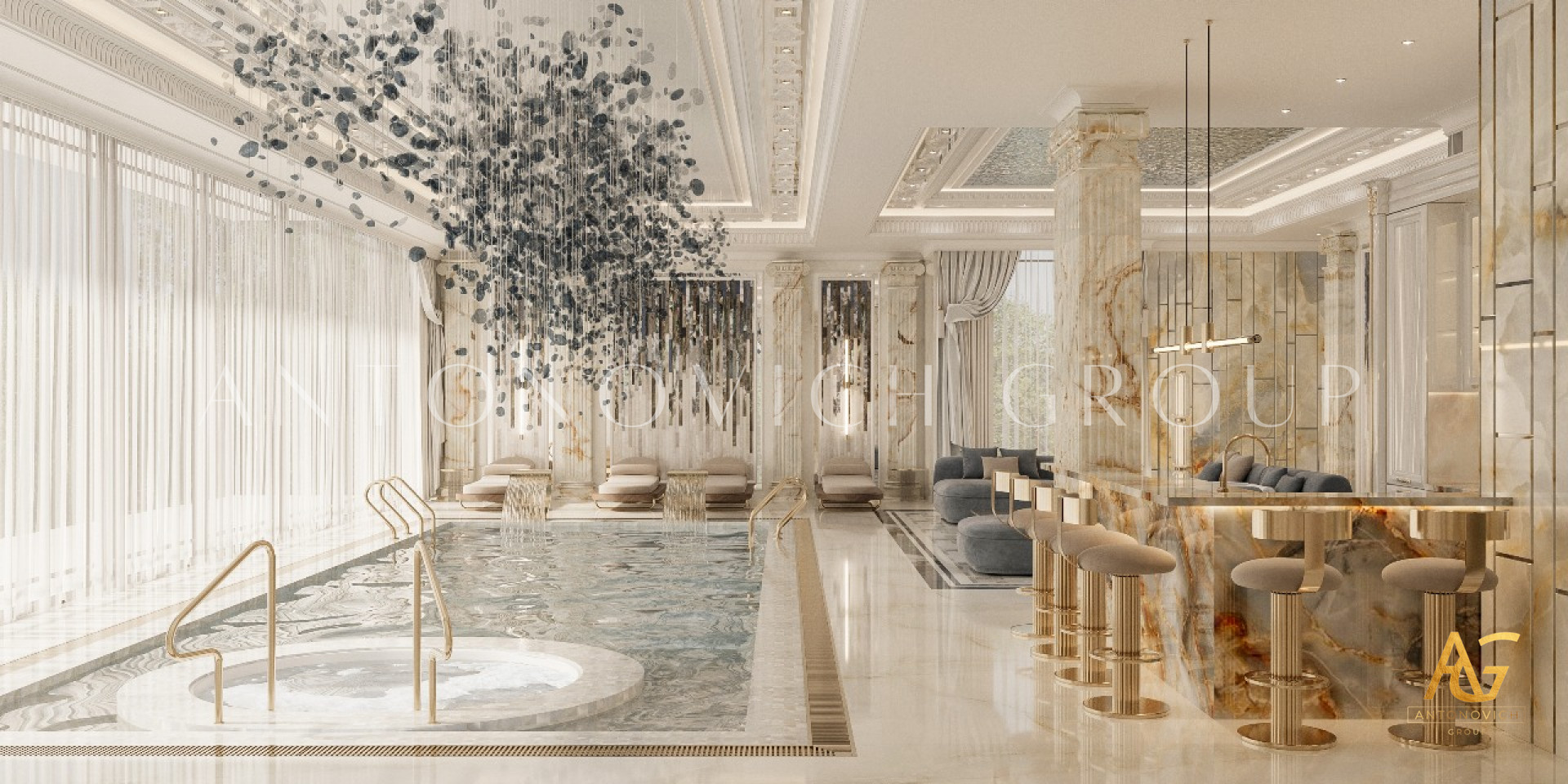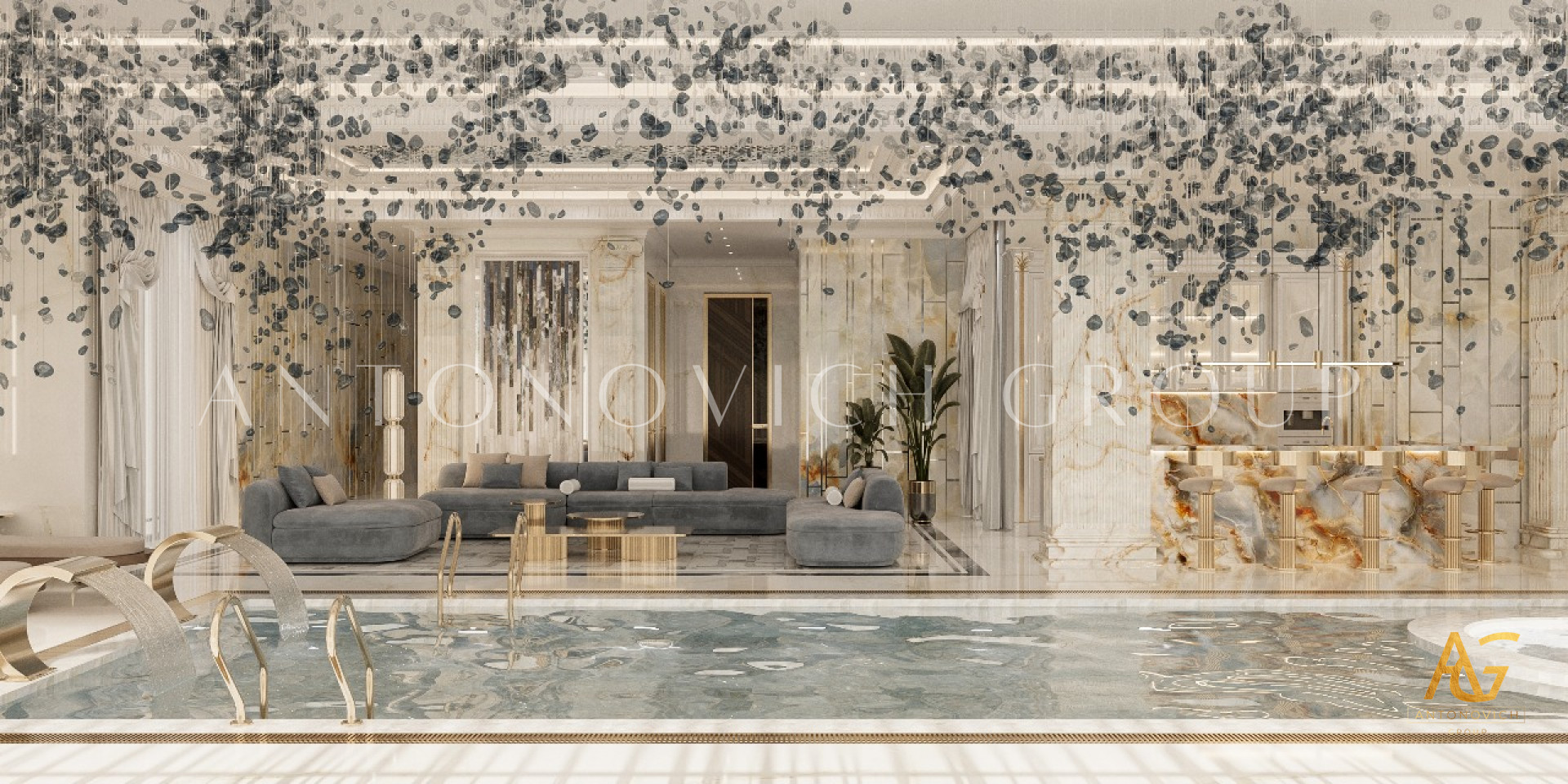 أنشأ المصممين الموهوبين لاستوديو التصميم لاكشري أنطونوفيتش ديزاين التصميم الداخلي المشرق جداً والإحتفالي للمسبح. حصل المظهر الفاخر بشكل خاص على النكهة الشرقية. مزيج من الظلال الفيروزية والسماوية والذهبية شكلت مزاج العيد مع اللمسات الفاخرة. تصميم الفيلا في دبي في كل التفاصيل يؤكد على الاحترام لأصحاب المنزل. الحل الأصلي لتقسيم المسبح الى قسمين أصبح تحول هذا التصميم للمشروع. الجزء الرئيسي للجدران، و السقف و حوض المسبح تم تزينهم ببلاط الموزاييك ذو اللون الأزرق. على هذه الخلفية، تبدو الأعمدة الفاخرة مع الرؤوس الجصية المذهبة و الديكور الأصلي للقاعدة. أجبرت العديد من نقاط الأضواء الكريستالية وخطوط LED الخلفية بإظهار التصميم الداخلي بشكل مشرق وواهج. وأصبح التصميم الفاخر للمسبح حلم رائع محقق لأصحاب المنزل.