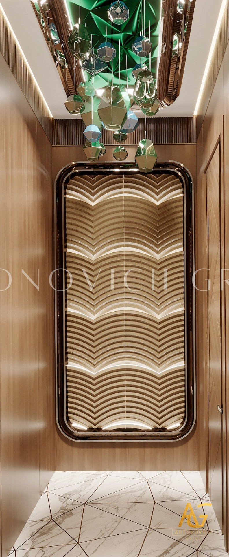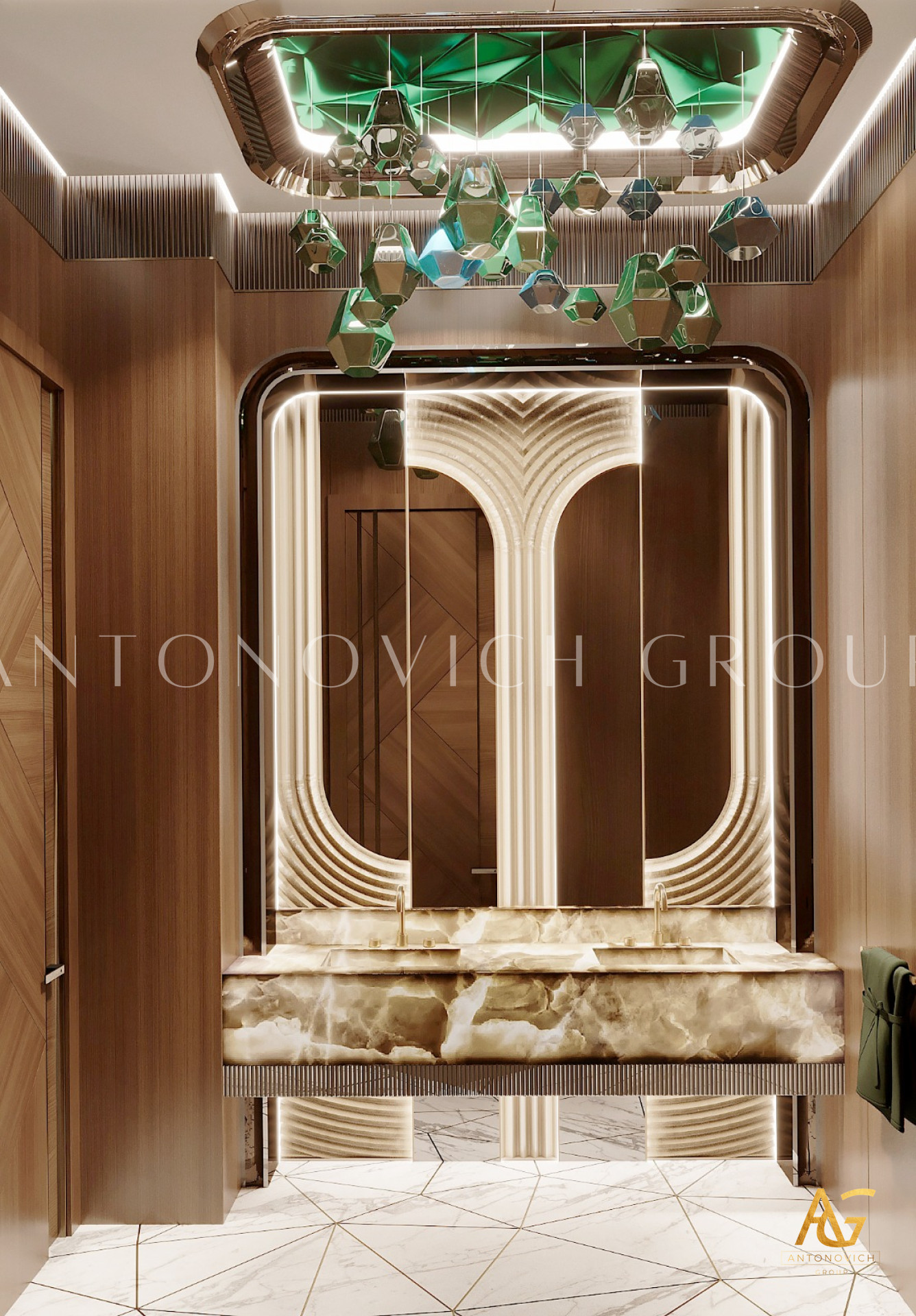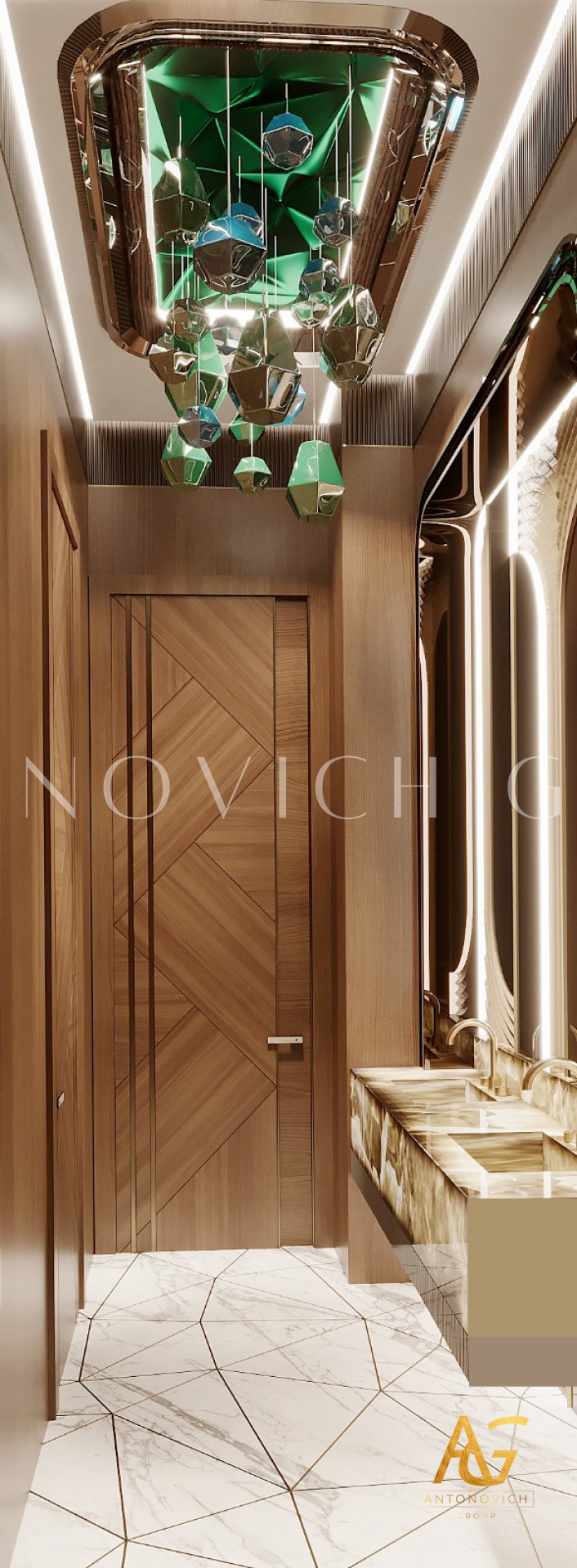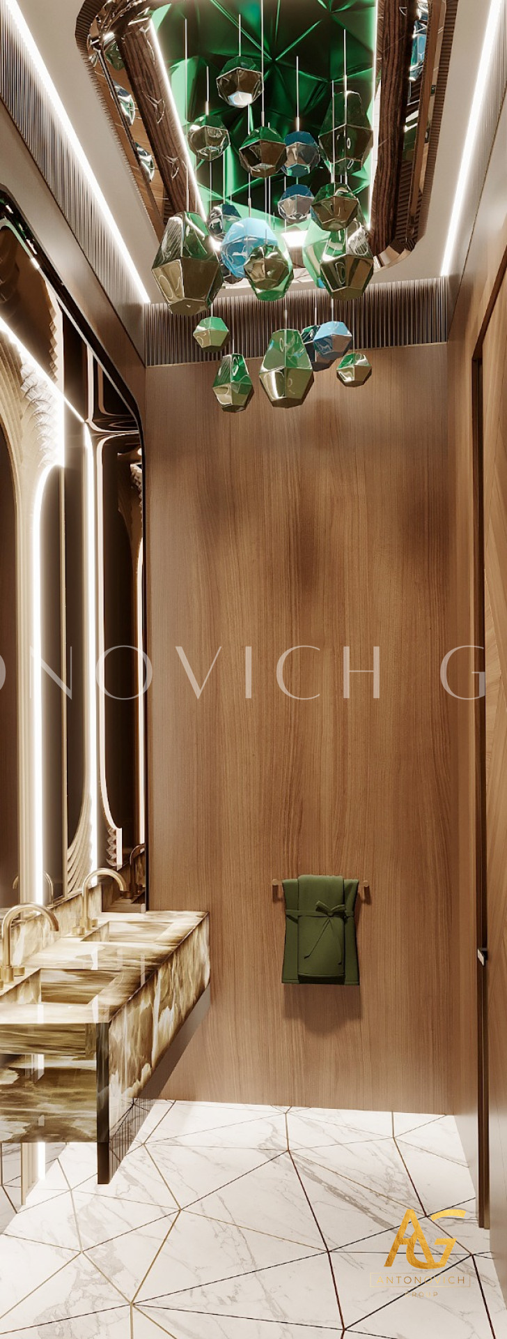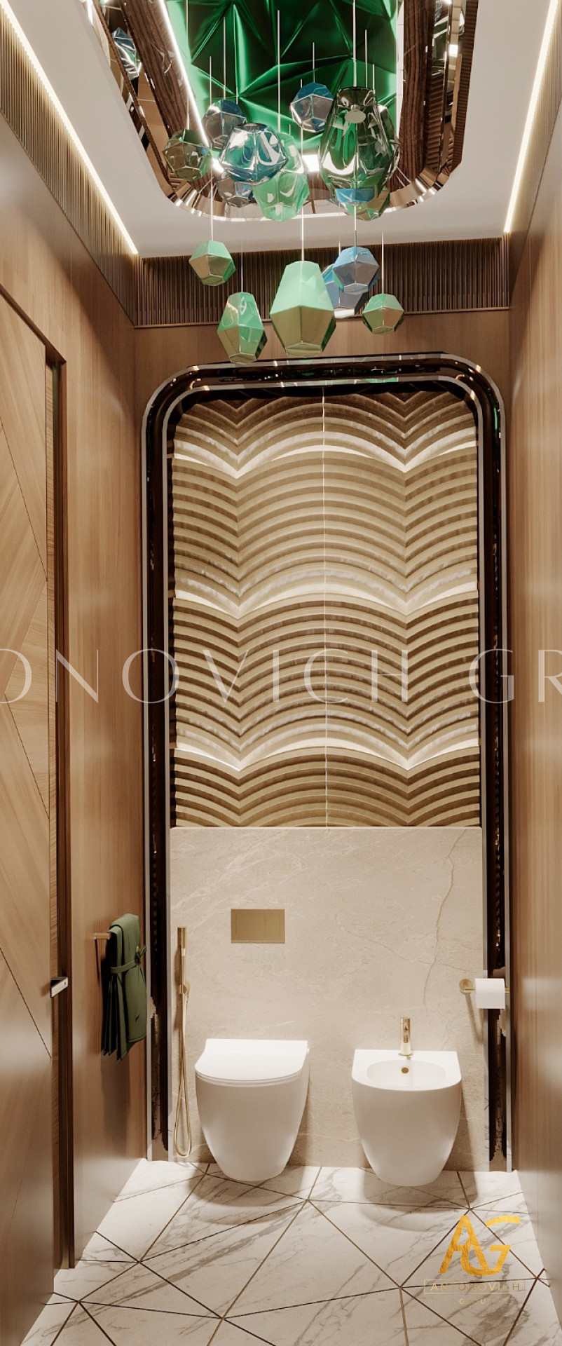 يتميز تصميم الحمام بأسلوب التبسيط بطابع مشرق للغاية وباهظ. اتخذ المصممون الداخليون أساسًا مادة كثيفة مثل الرخام. الجدران مزينة بالحجر الطبيعي باللون الرمادي الباهت مع عروق طبيعية جميلة. بلاط رخامي أبيض على الأرض في انسجام تام مع السقف الأبيض. تصميمات الحمامات مضاءة بأضواء السقف الحديثة بأسلوب عالي التقنية. تبدو المساحة خفيفة وجيدة التهوية بفضل حلول تصميم الحمامات الإبداعية. كابينة الاستحمام مسيجة بالزجاج الشفاف. كجزء من ديكور الأرضيات أصبح البناء الجميل من الحصى البحرية البيضاء. يتم توسيع الإضاءة الإضافية بصريًا في تصميم المرحاض. منطقة الغسيل تخلق الوهم بأنها تطفو في الهواء ، وتبدو سهلة وخالية من الوزن. الراحة الحديثة مع اللمسات الفكرية المميزة لكل عمل من أعمال المصممين لاكشري انتونوفيتش ديزاين استديو. مزيج مثالي من المواد والألوان والقوام يملأ داخل الحمام الجميل بتناغم مطلق وسحر الراحة المنزلية.