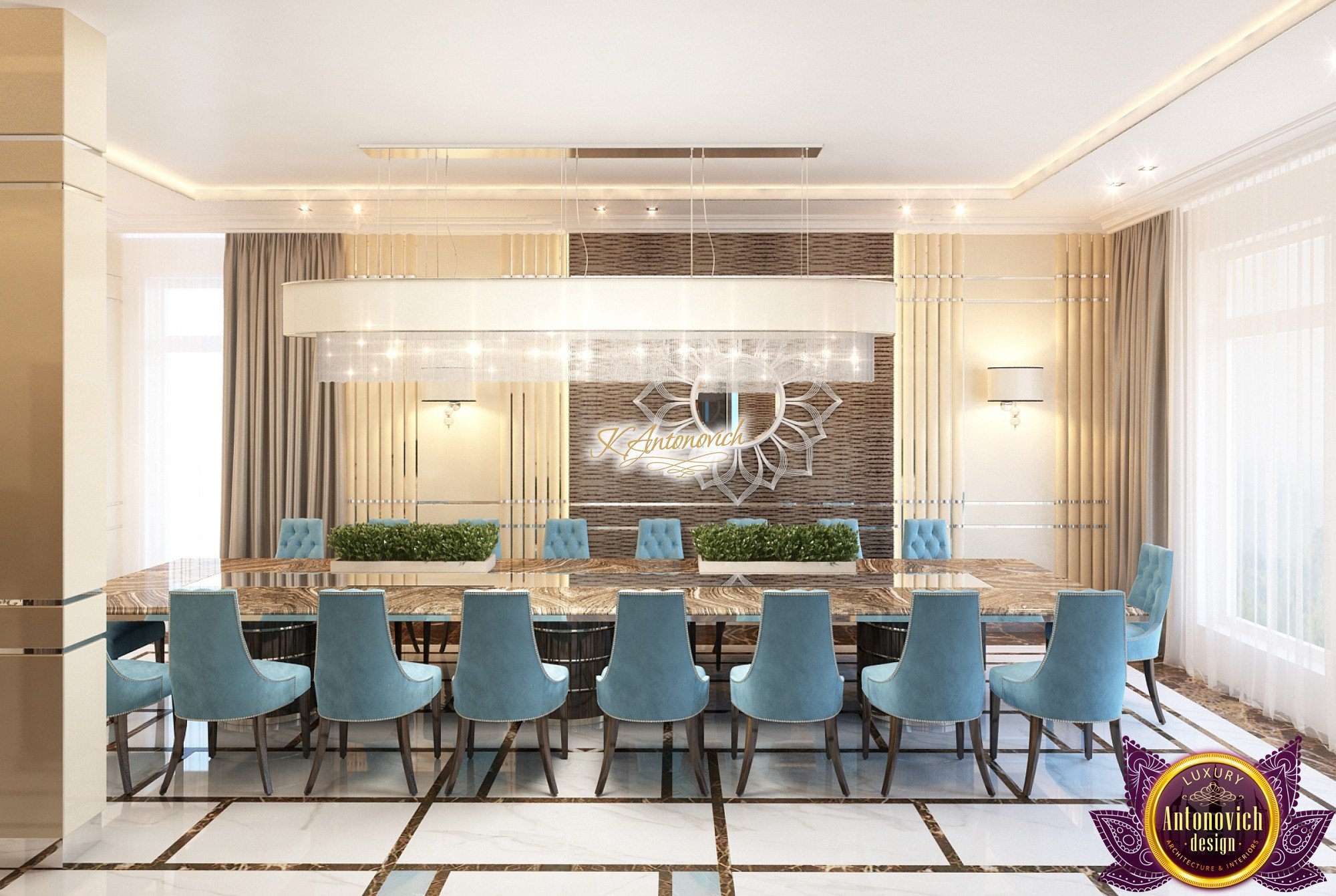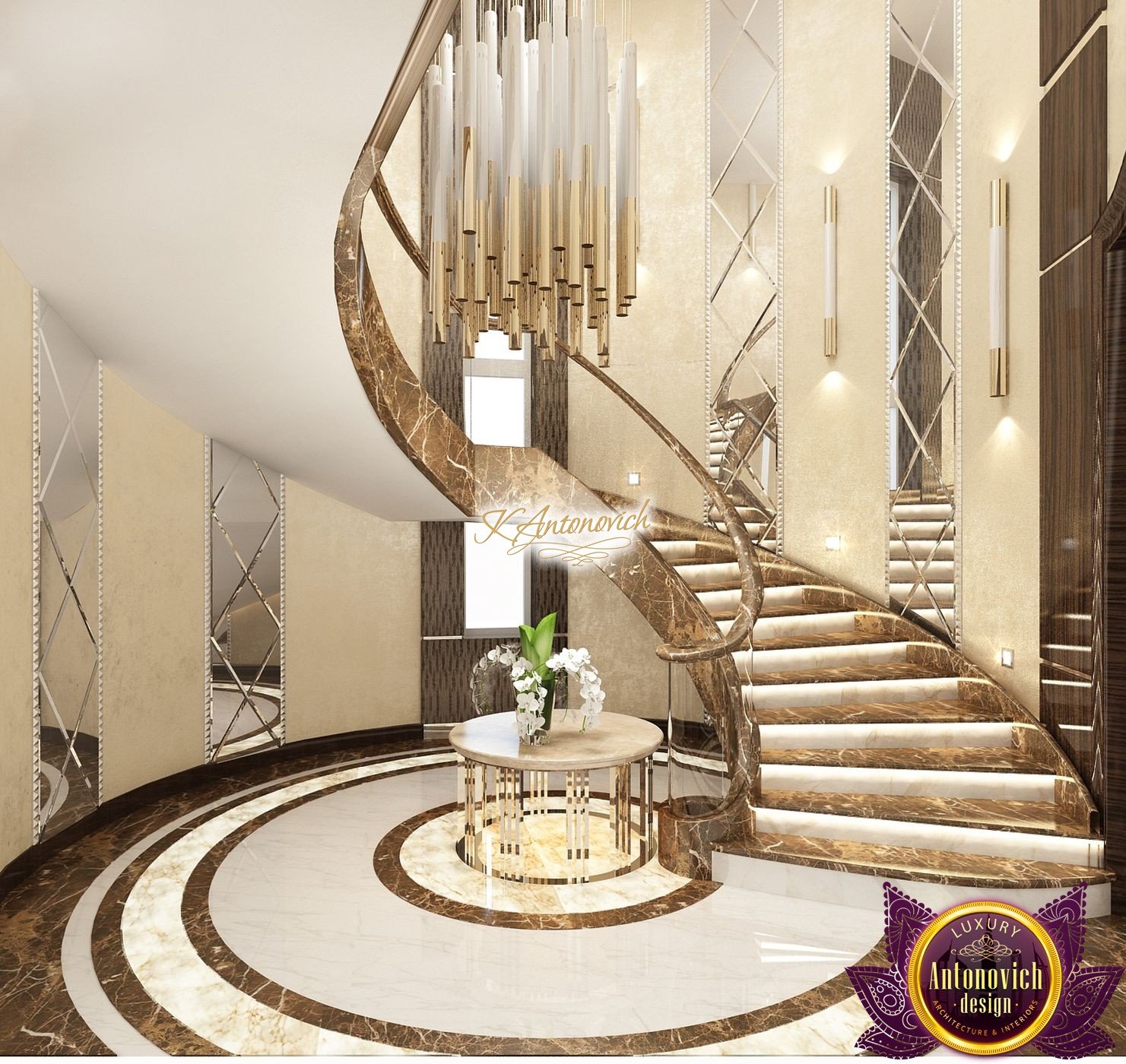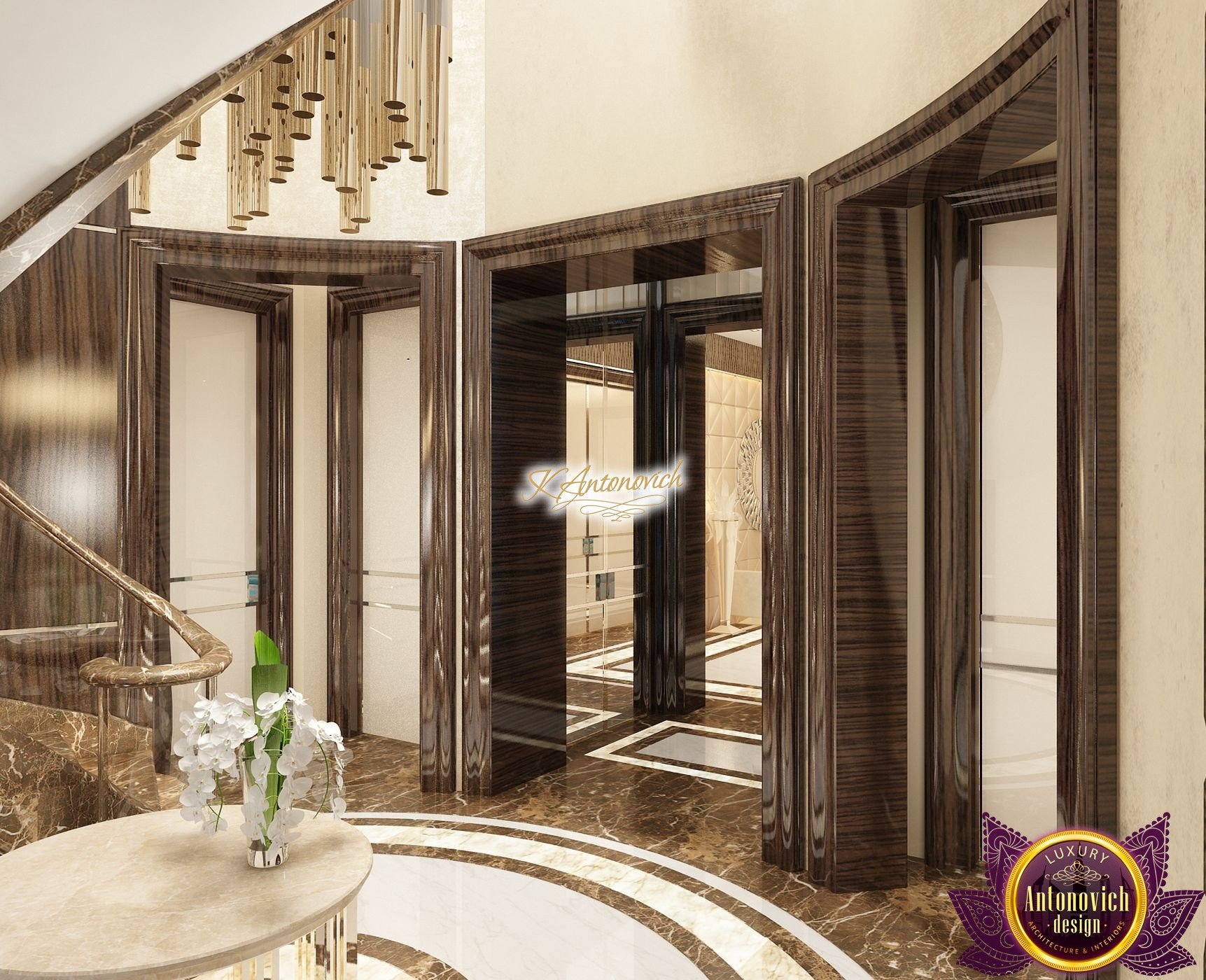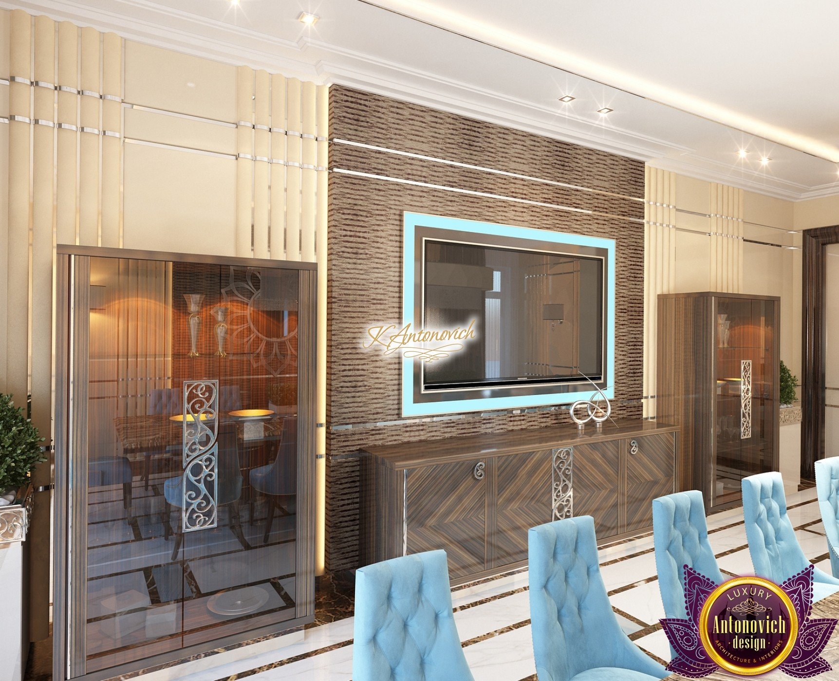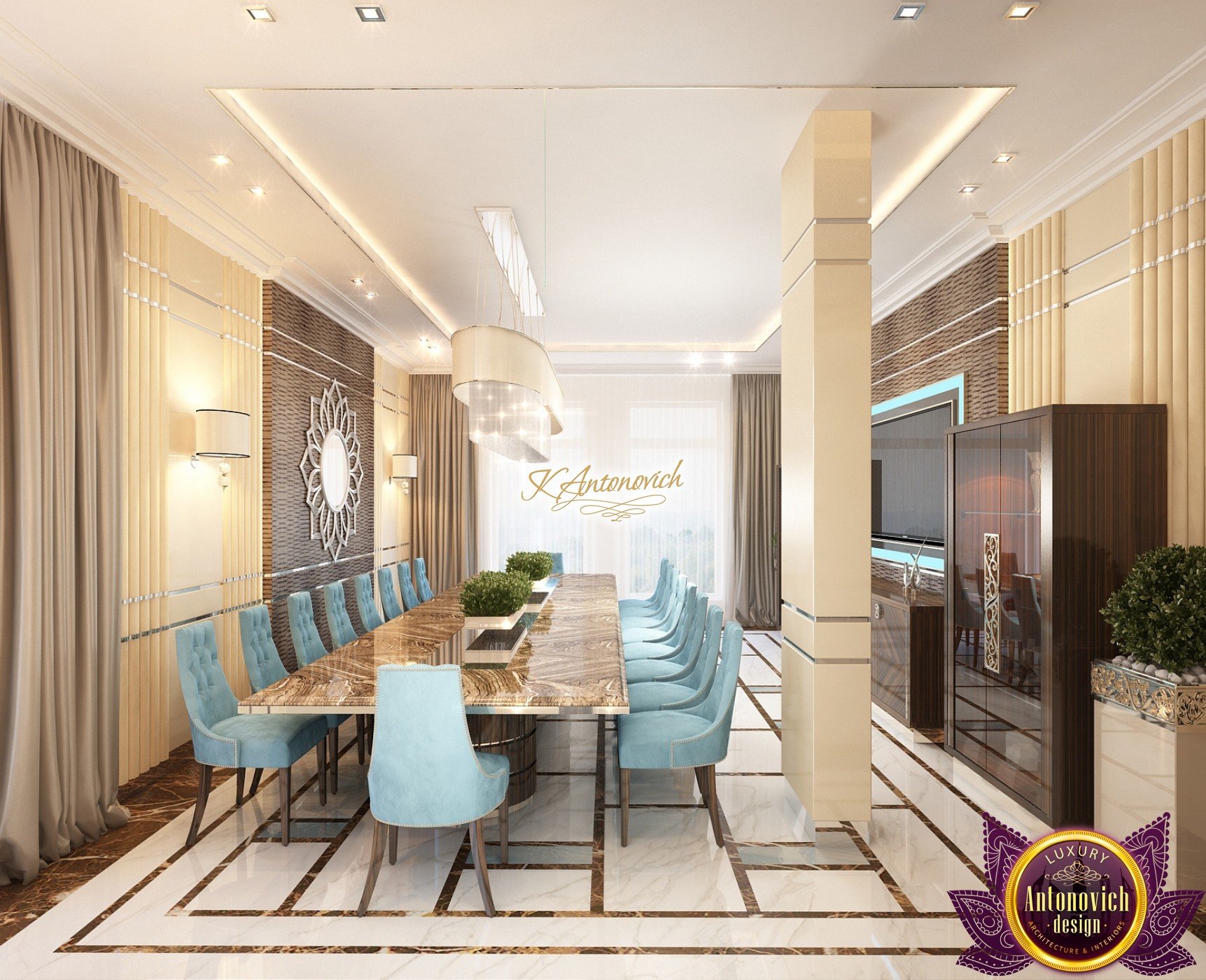 Interior design, as an art, of the studio Luxury Antonovich Design, is creating unique masterpieces of luxury and comfort in a variety of styles. The interior of this luxury villa in the style of modern classics.Each room in the house has acquired its own special character while remaining as a single entity in the overall design concept of the house.The living room is dominated a monochrome range of beige and chocolate colors. A large number of soft sofas says that the house has a cheerful and friendly atmosphere. The silk curtains in the living room, shade of milk chocolate became a cozy addition.Extravagant wall decor blends with the flooring design.The living room is extended to the spacious dining room, which confirms the kindness and hospitality of the owners of the house.Overall, in pastel shades very bright and juicy looks 18 soft seats upholstered in velvet blue hue. No less luxurious and modern look has the kitchen with a dining area.For this part of the space house, designers proposed style of minimalism.Fine materials and the perfect organization of the space give the kitchen a very nice and respectable look.At the same time, the interior is very comfortable and ergonomic.A spiral staircase with graceful curves connects the two floors of the house.Each of marble steps is highlighted. In order to visually enlarge the space of staircase portal designers used in the decoration of the walls mirrored panels with bevel. In these panels reflected wonderfully a beautiful chandelier in art deco style.Soft decor panels of leather, solid lacquered wood, and vertical greening on walls filling the interior with particularly cozy and warm mood.