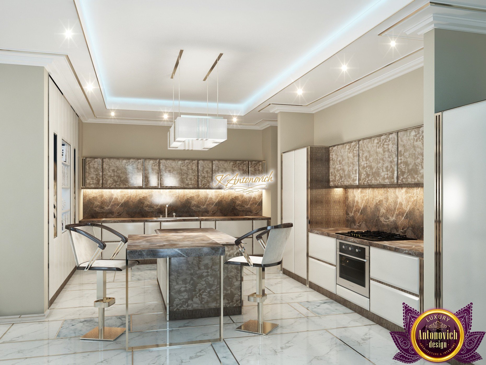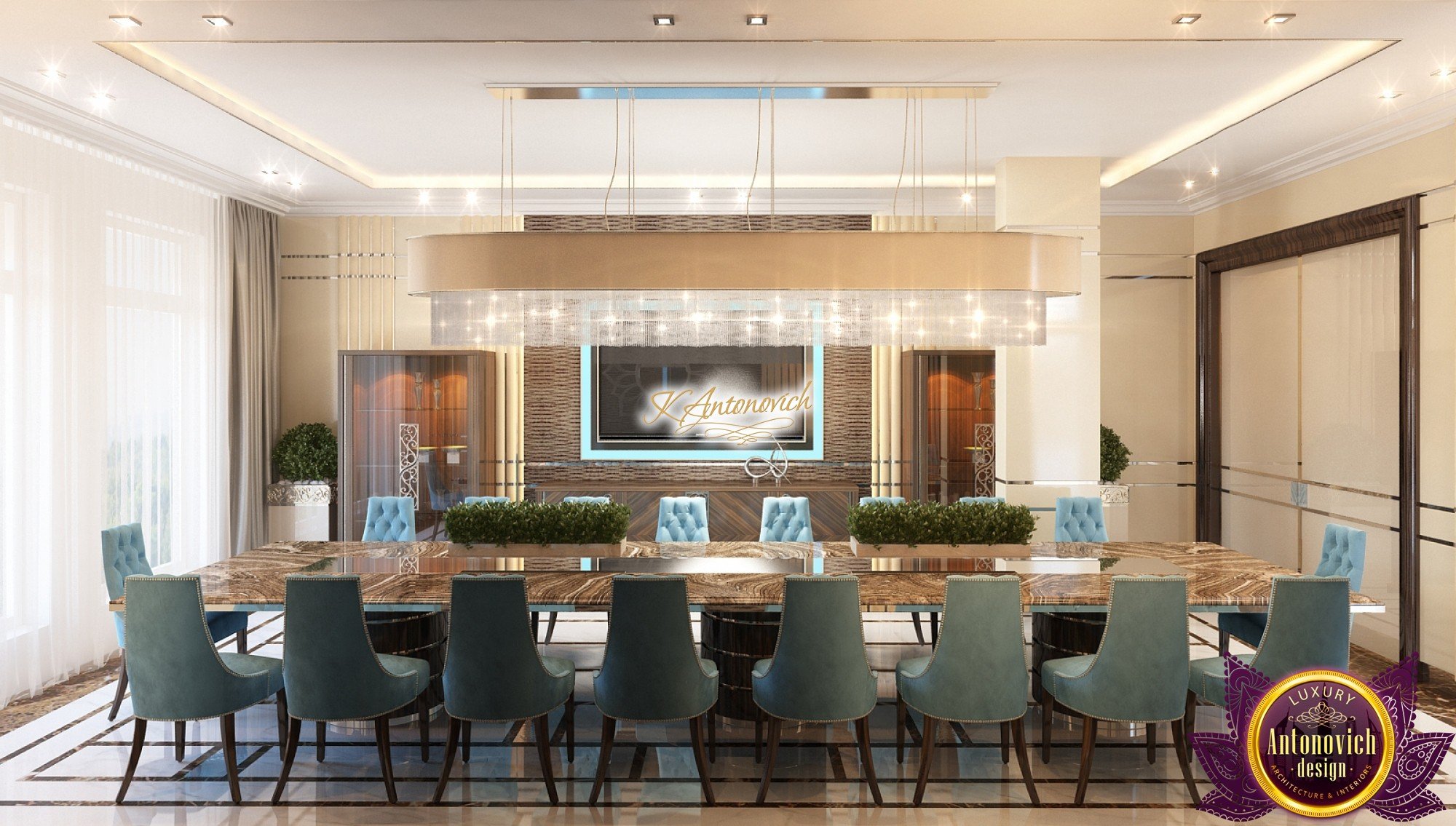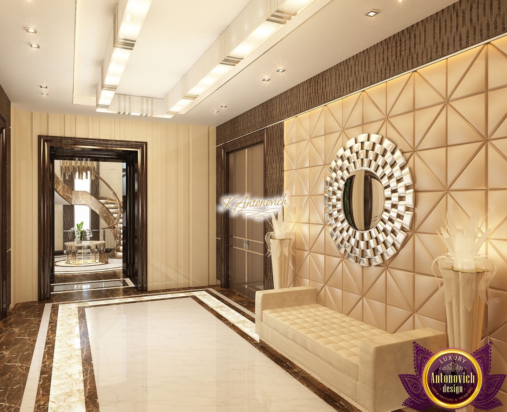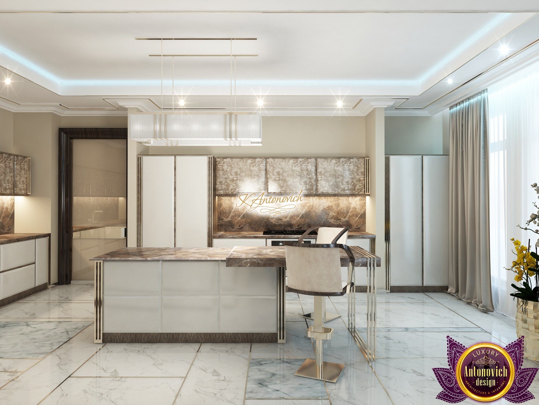 Interior design, as an art, of the studio Luxury Antonovich Design, is creating unique masterpieces of luxury and comfort in a variety of styles. The interior of this luxury villa in the style of modern classics.Each room in the house has acquired its own special character while remaining as a single entity in the overall design concept of the house.The living room is dominated a monochrome range of beige and chocolate colors. A large number of soft sofas says that the house has a cheerful and friendly atmosphere. The silk curtains in the living room, shade of milk chocolate became a cozy addition.Extravagant wall decor blends with the flooring design.The living room is extended to the spacious dining room, which confirms the kindness and hospitality of the owners of the house.Overall, in pastel shades very bright and juicy looks 18 soft seats upholstered in velvet blue hue. No less luxurious and modern look has the kitchen with a dining area.For this part of the space house, designers proposed style of minimalism.Fine materials and the perfect organization of the space give the kitchen a very nice and respectable look.At the same time, the interior is very comfortable and ergonomic.A spiral staircase with graceful curves connects the two floors of the house.Each of marble steps is highlighted. In order to visually enlarge the space of staircase portal designers used in the decoration of the walls mirrored panels with bevel. In these panels reflected wonderfully a beautiful chandelier in art deco style.Soft decor panels of leather, solid lacquered wood, and vertical greening on walls filling the interior with particularly cozy and warm mood.