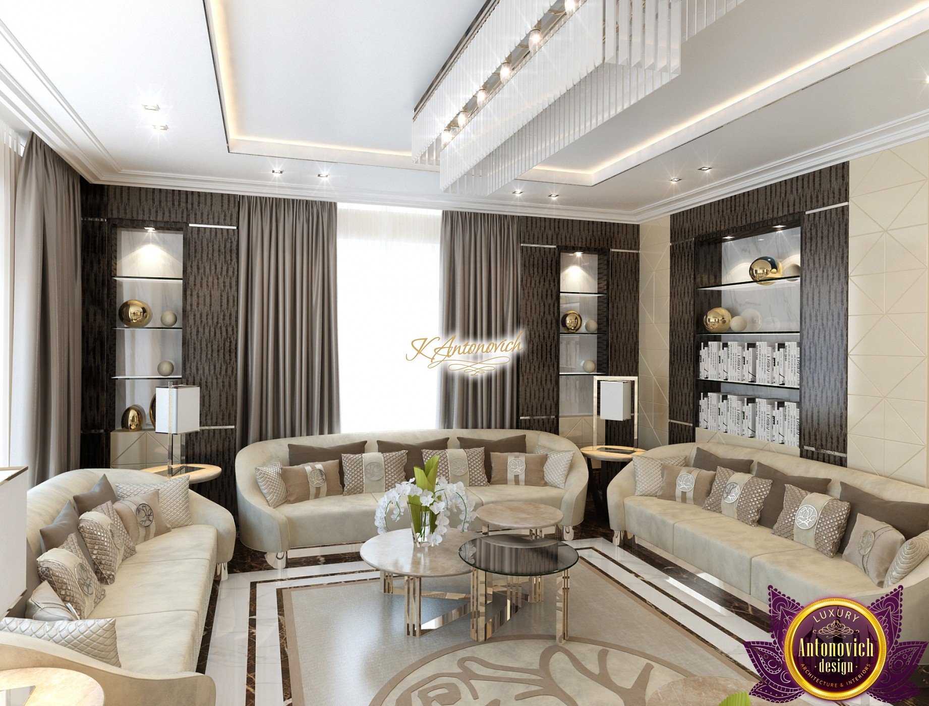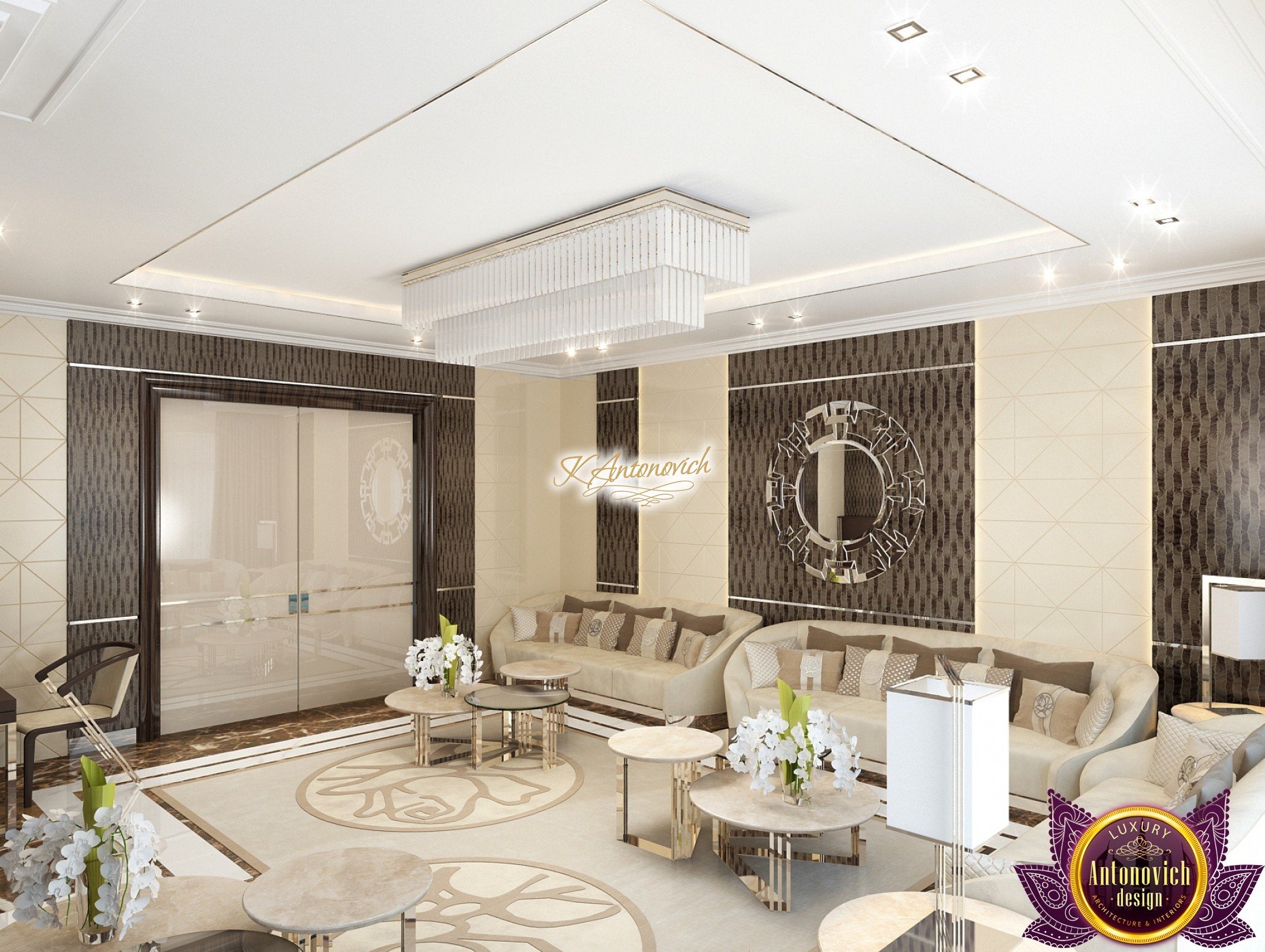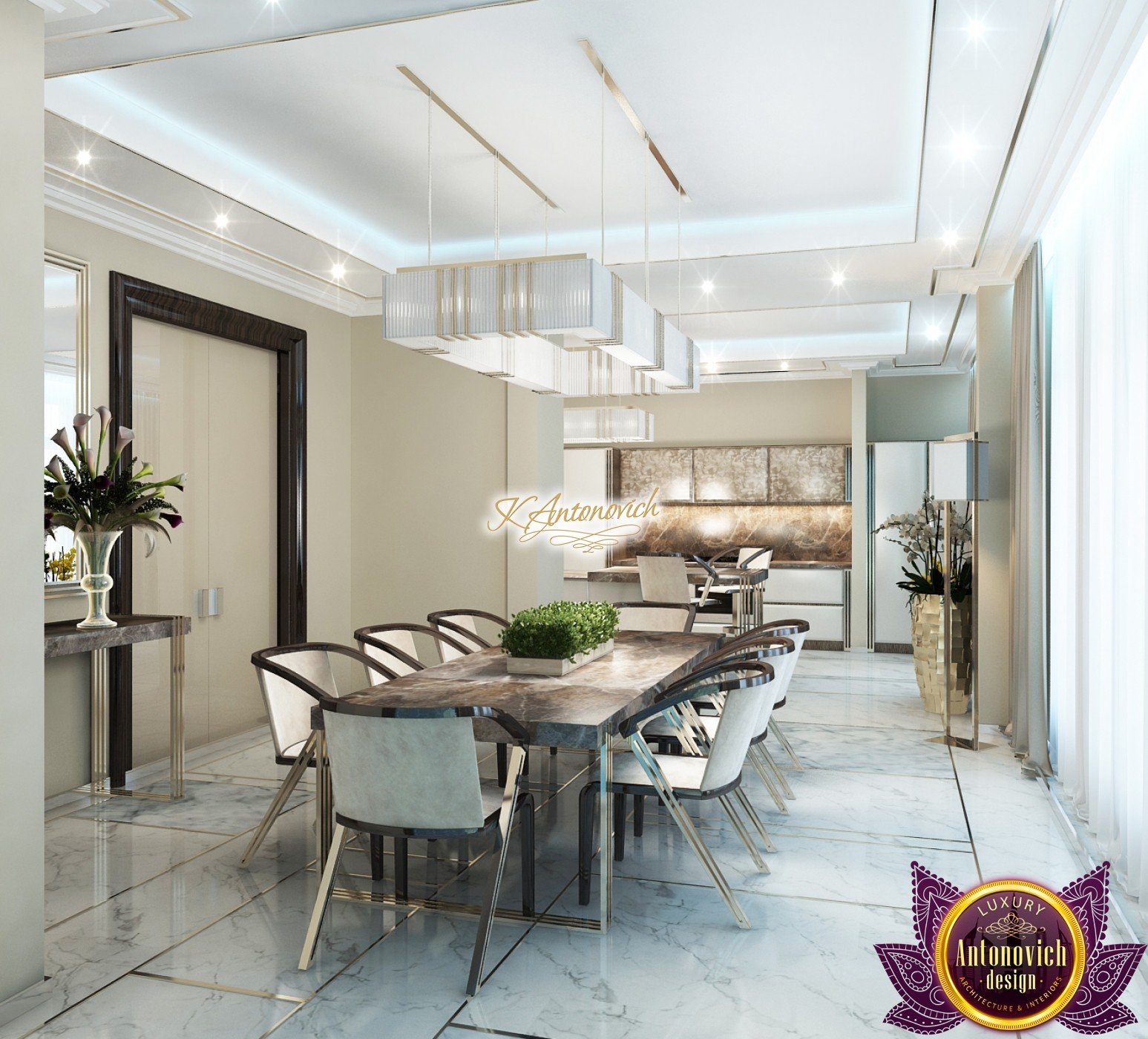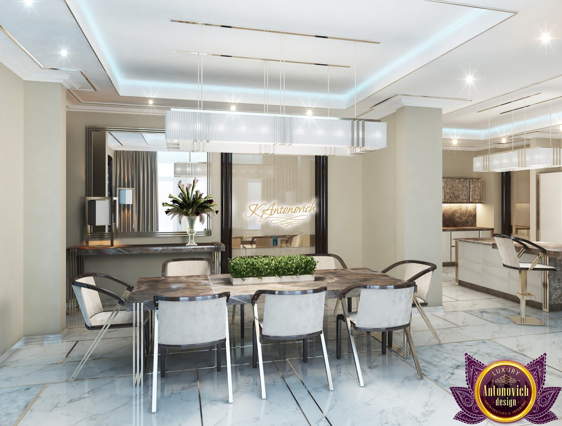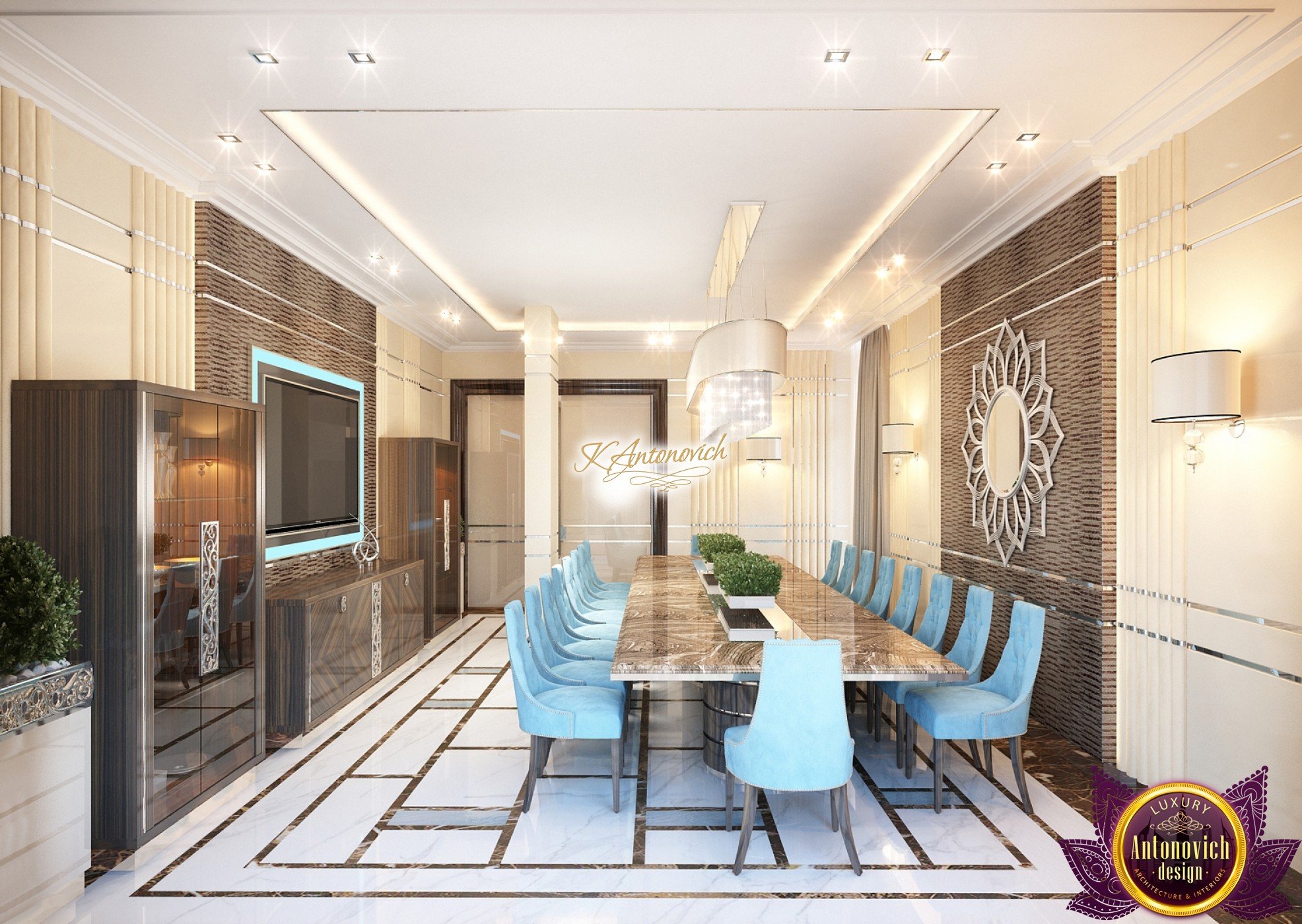 Interior design, as an art, of the studio Luxury Antonovich Design, is creating unique masterpieces of luxury and comfort in a variety of styles. The interior of this luxury villa in the style of modern classics.Each room in the house has acquired its own special character while remaining as a single entity in the overall design concept of the house.The living room is dominated a monochrome range of beige and chocolate colors. A large number of soft sofas says that the house has a cheerful and friendly atmosphere. The silk curtains in the living room, shade of milk chocolate became a cozy addition.Extravagant wall decor blends with the flooring design.The living room is extended to the spacious dining room, which confirms the kindness and hospitality of the owners of the house.Overall, in pastel shades very bright and juicy looks 18 soft seats upholstered in velvet blue hue. No less luxurious and modern look has the kitchen with a dining area.For this part of the space house, designers proposed style of minimalism.Fine materials and the perfect organization of the space give the kitchen a very nice and respectable look.At the same time, the interior is very comfortable and ergonomic.A spiral staircase with graceful curves connects the two floors of the house.Each of marble steps is highlighted. In order to visually enlarge the space of staircase portal designers used in the decoration of the walls mirrored panels with bevel. In these panels reflected wonderfully a beautiful chandelier in art deco style.Soft decor panels of leather, solid lacquered wood, and vertical greening on walls filling the interior with particularly cozy and warm mood.