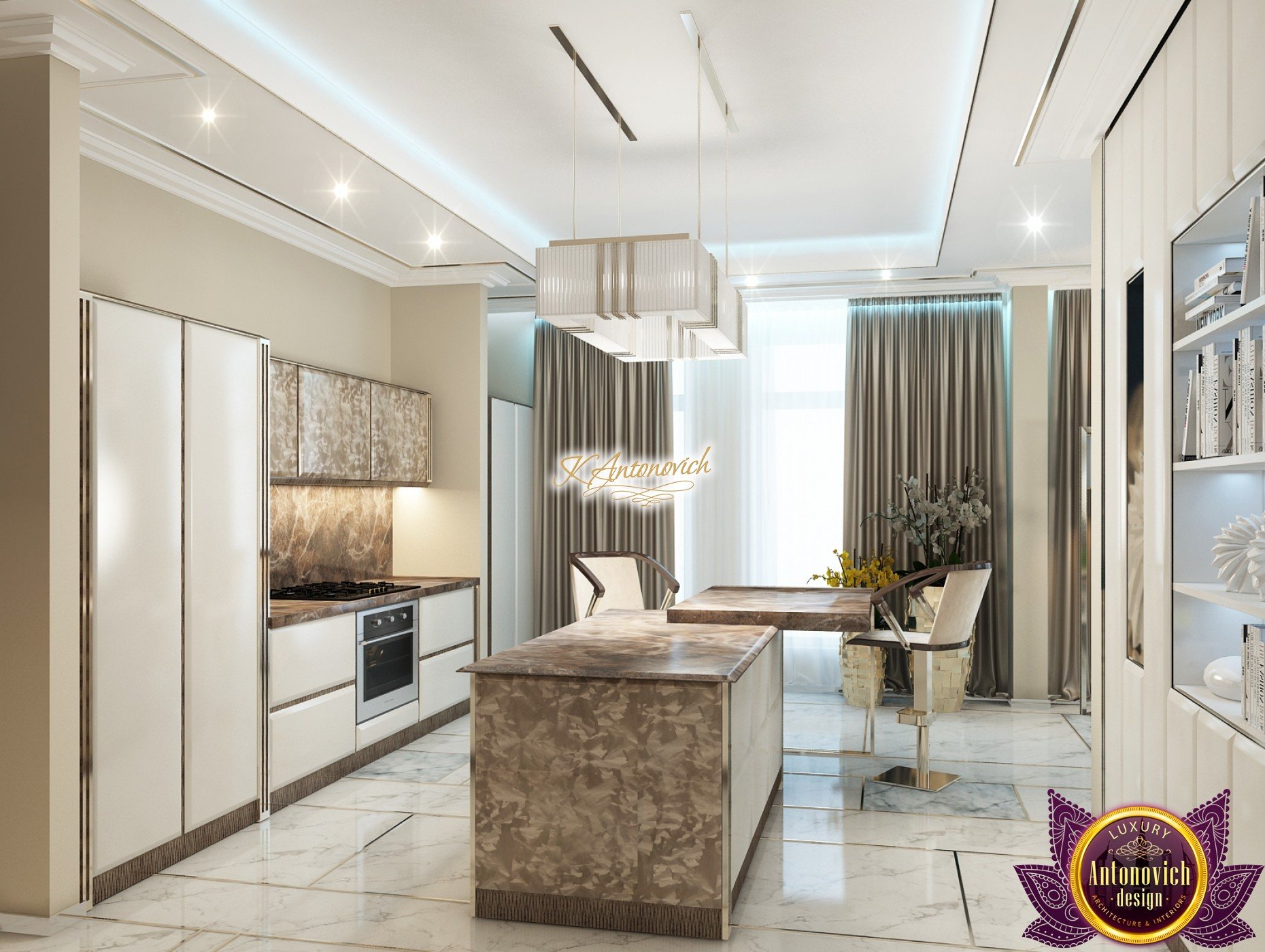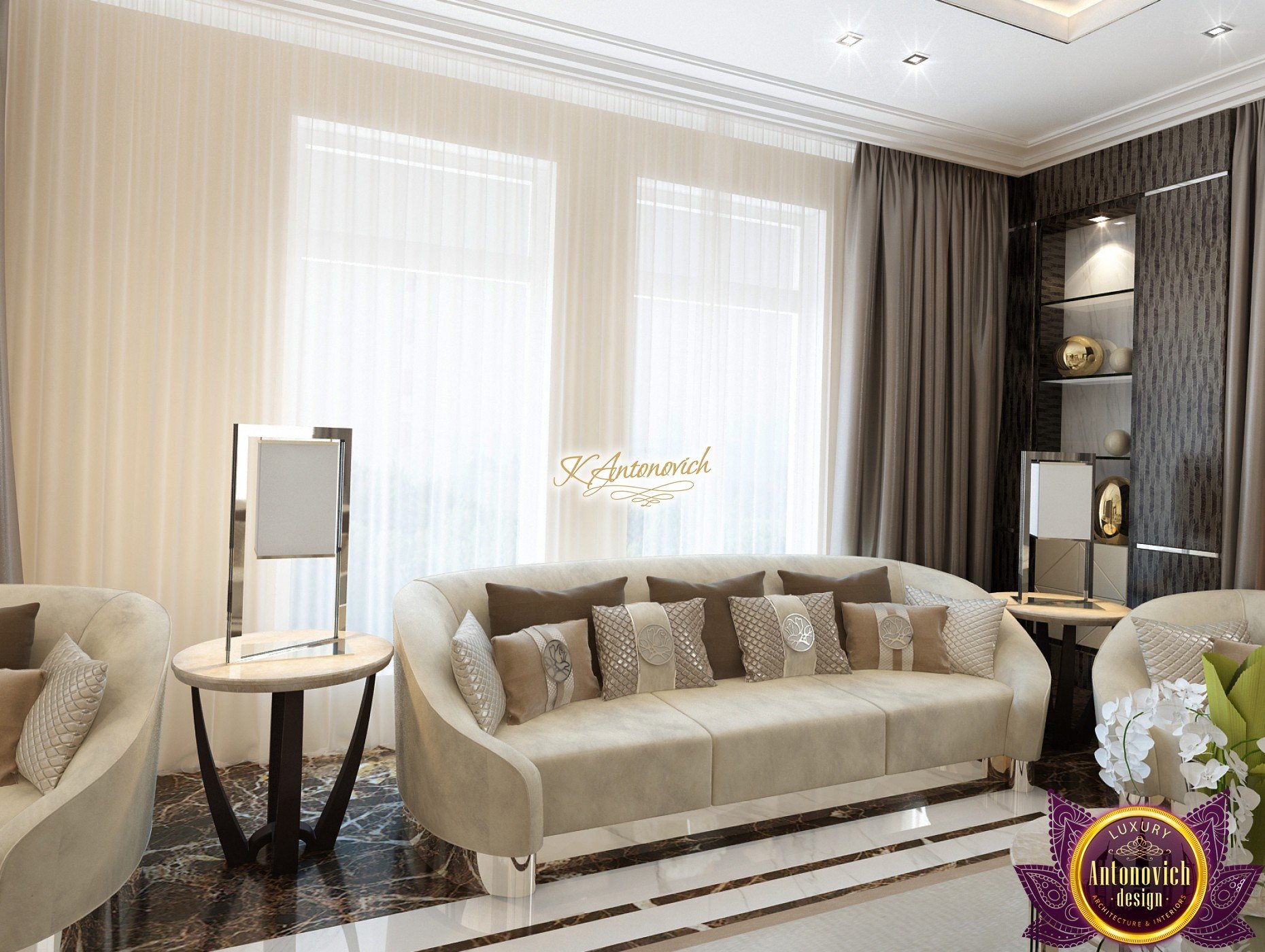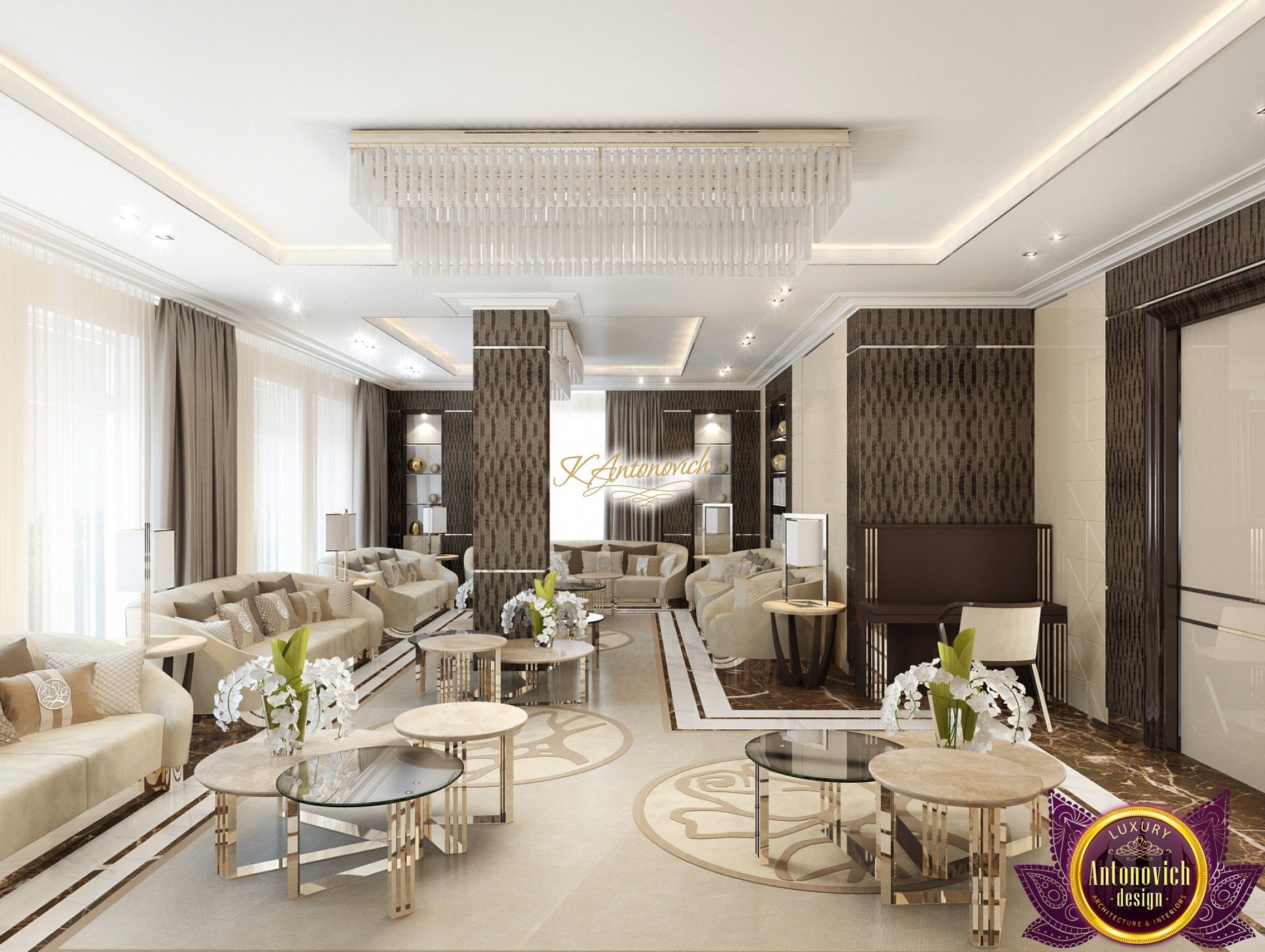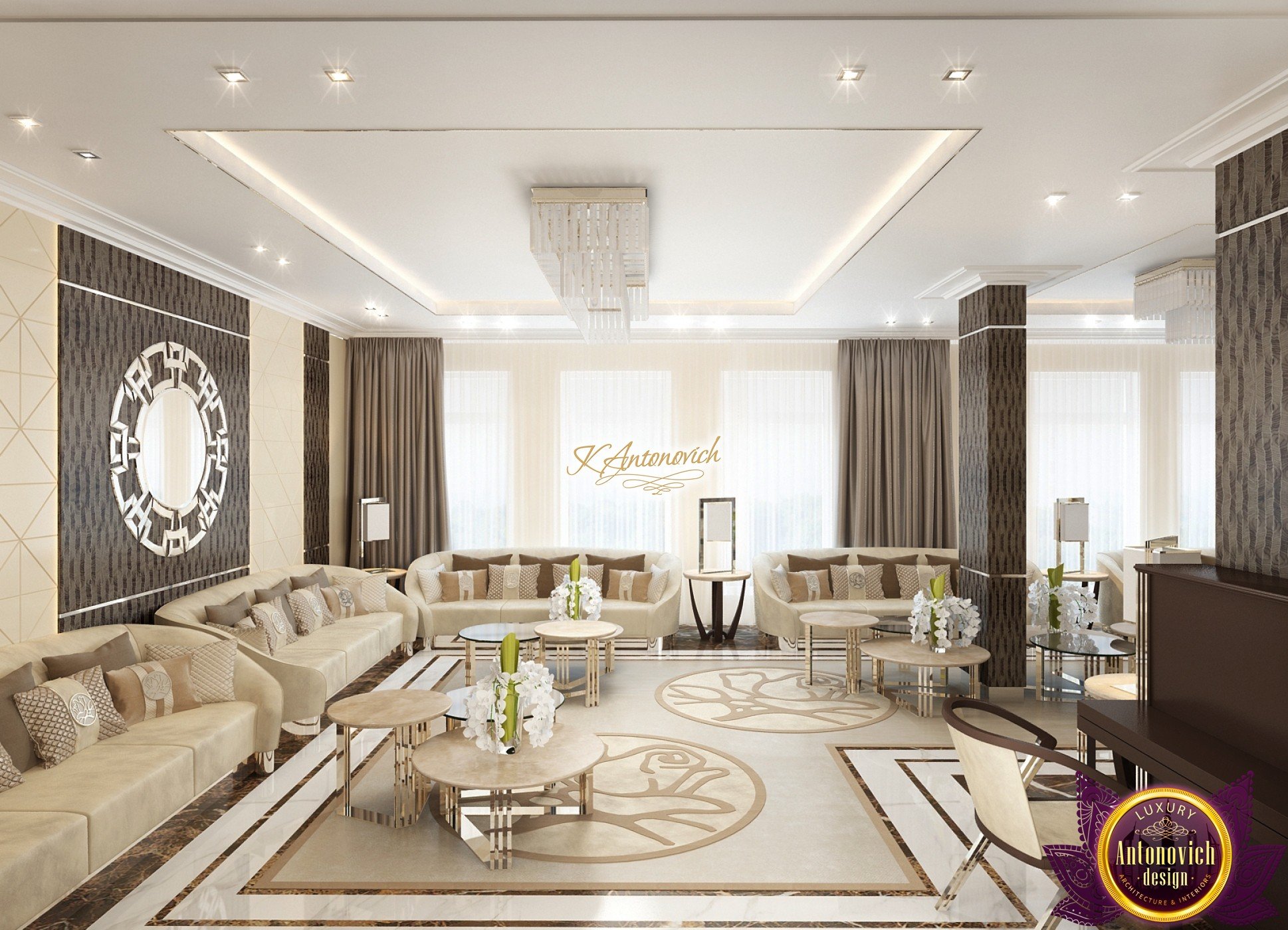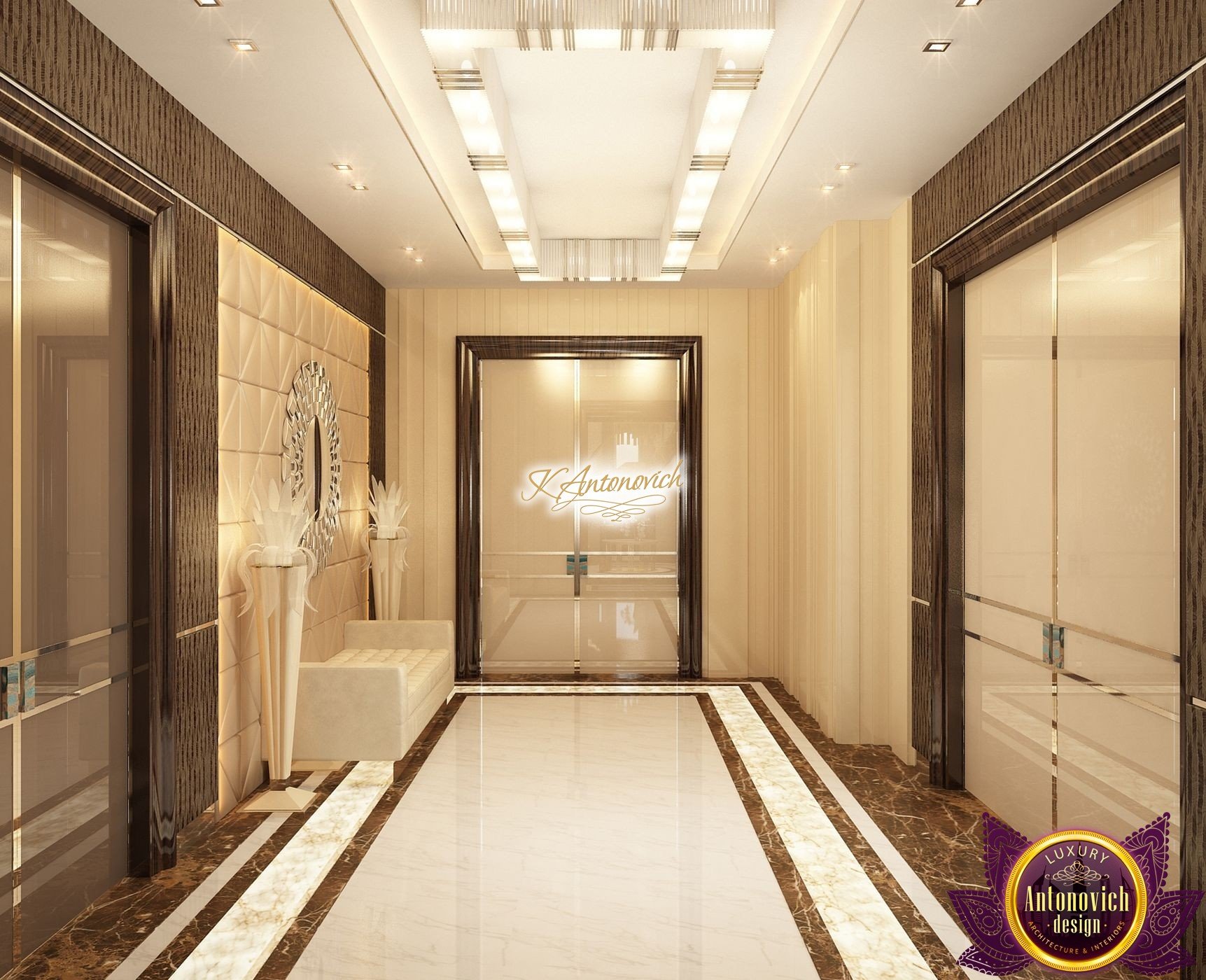 Interior design, as an art, of the studio Luxury Antonovich Design, is creating unique masterpieces of luxury and comfort in a variety of styles. The interior of this luxury villa in the style of modern classics.Each room in the house has acquired its own special character while remaining as a single entity in the overall design concept of the house.The living room is dominated a monochrome range of beige and chocolate colors. A large number of soft sofas says that the house has a cheerful and friendly atmosphere. The silk curtains in the living room, shade of milk chocolate became a cozy addition.Extravagant wall decor blends with the flooring design.The living room is extended to the spacious dining room, which confirms the kindness and hospitality of the owners of the house.Overall, in pastel shades very bright and juicy looks 18 soft seats upholstered in velvet blue hue. No less luxurious and modern look has the kitchen with a dining area.For this part of the space house, designers proposed style of minimalism.Fine materials and the perfect organization of the space give the kitchen a very nice and respectable look.At the same time, the interior is very comfortable and ergonomic.A spiral staircase with graceful curves connects the two floors of the house.Each of marble steps is highlighted. In order to visually enlarge the space of staircase portal designers used in the decoration of the walls mirrored panels with bevel. In these panels reflected wonderfully a beautiful chandelier in art deco style.Soft decor panels of leather, solid lacquered wood, and vertical greening on walls filling the interior with particularly cozy and warm mood.