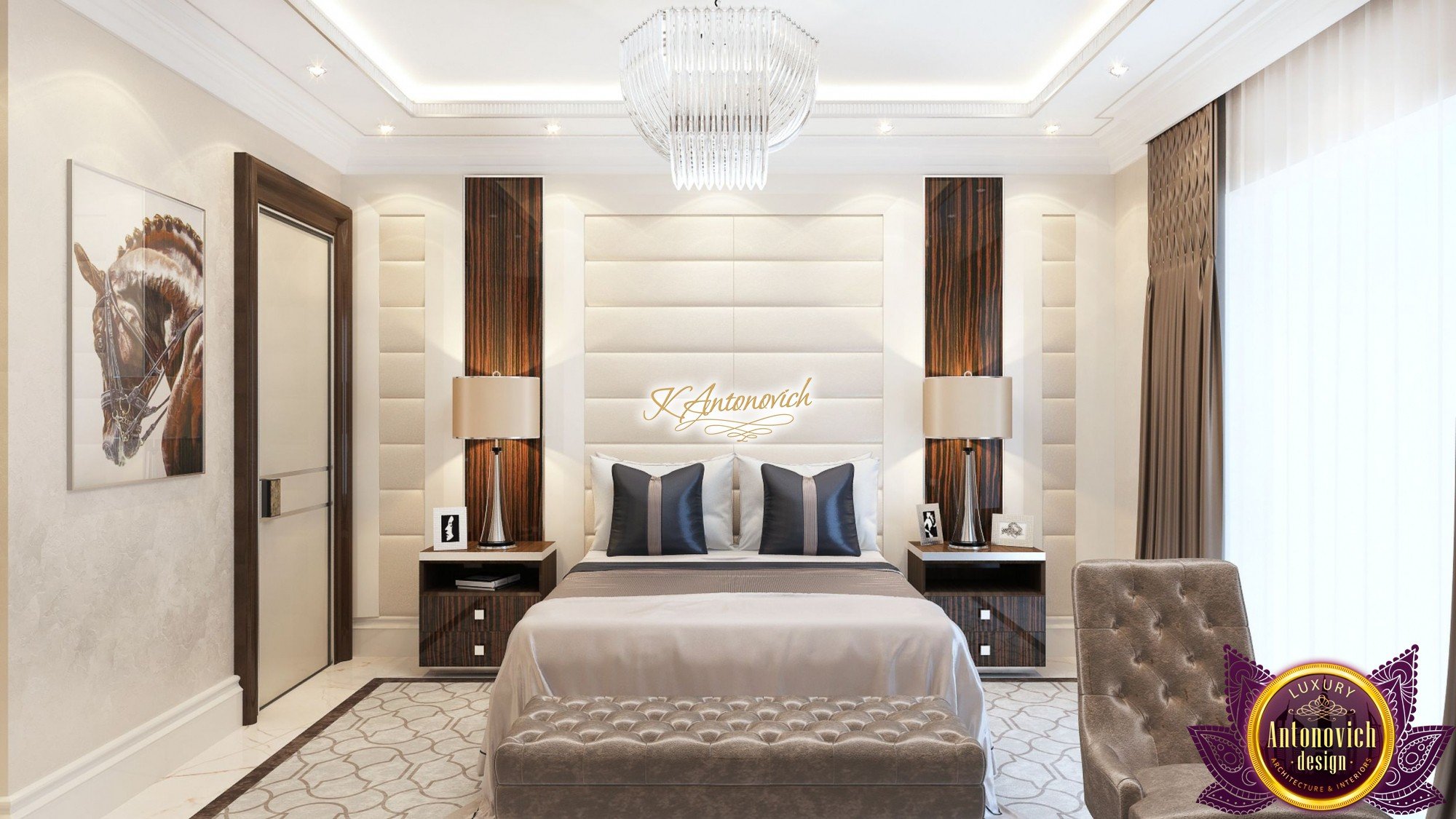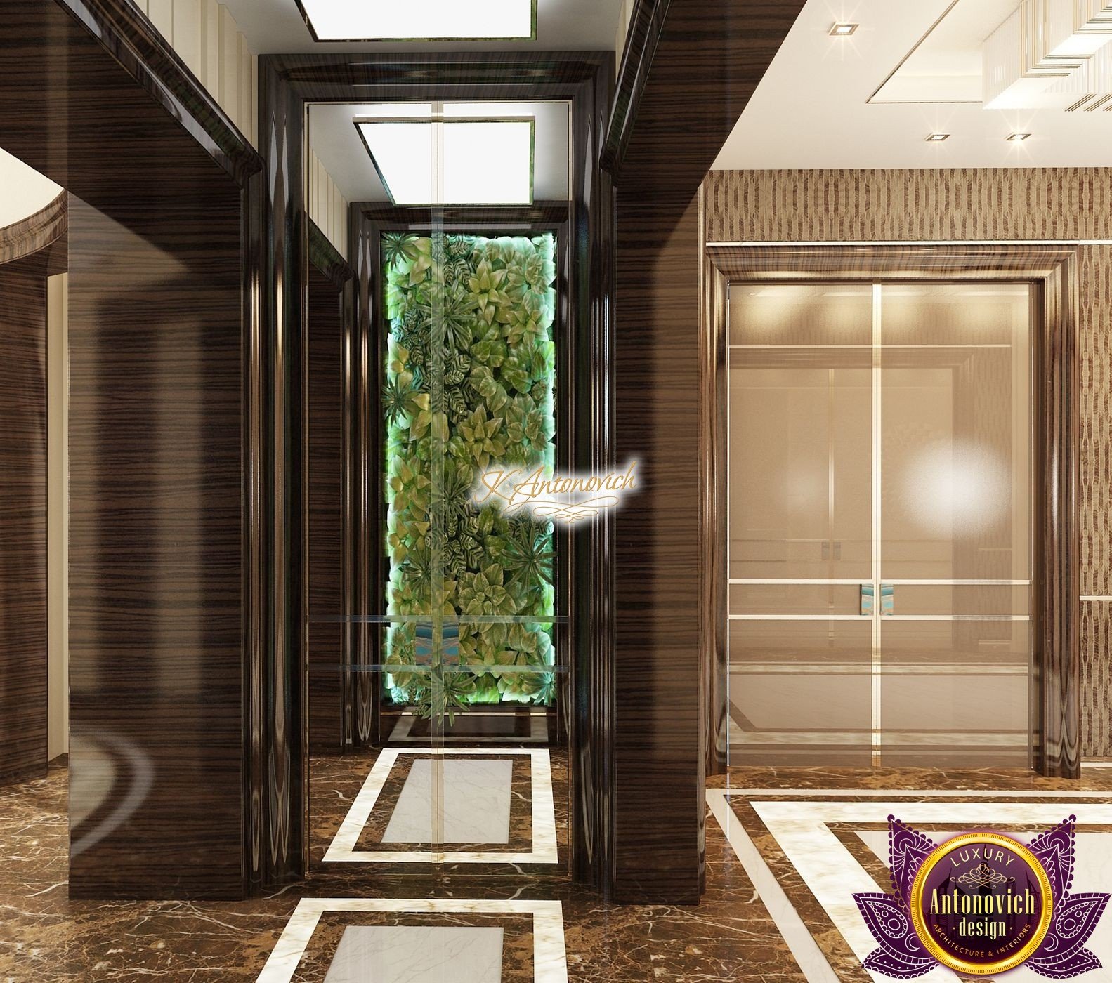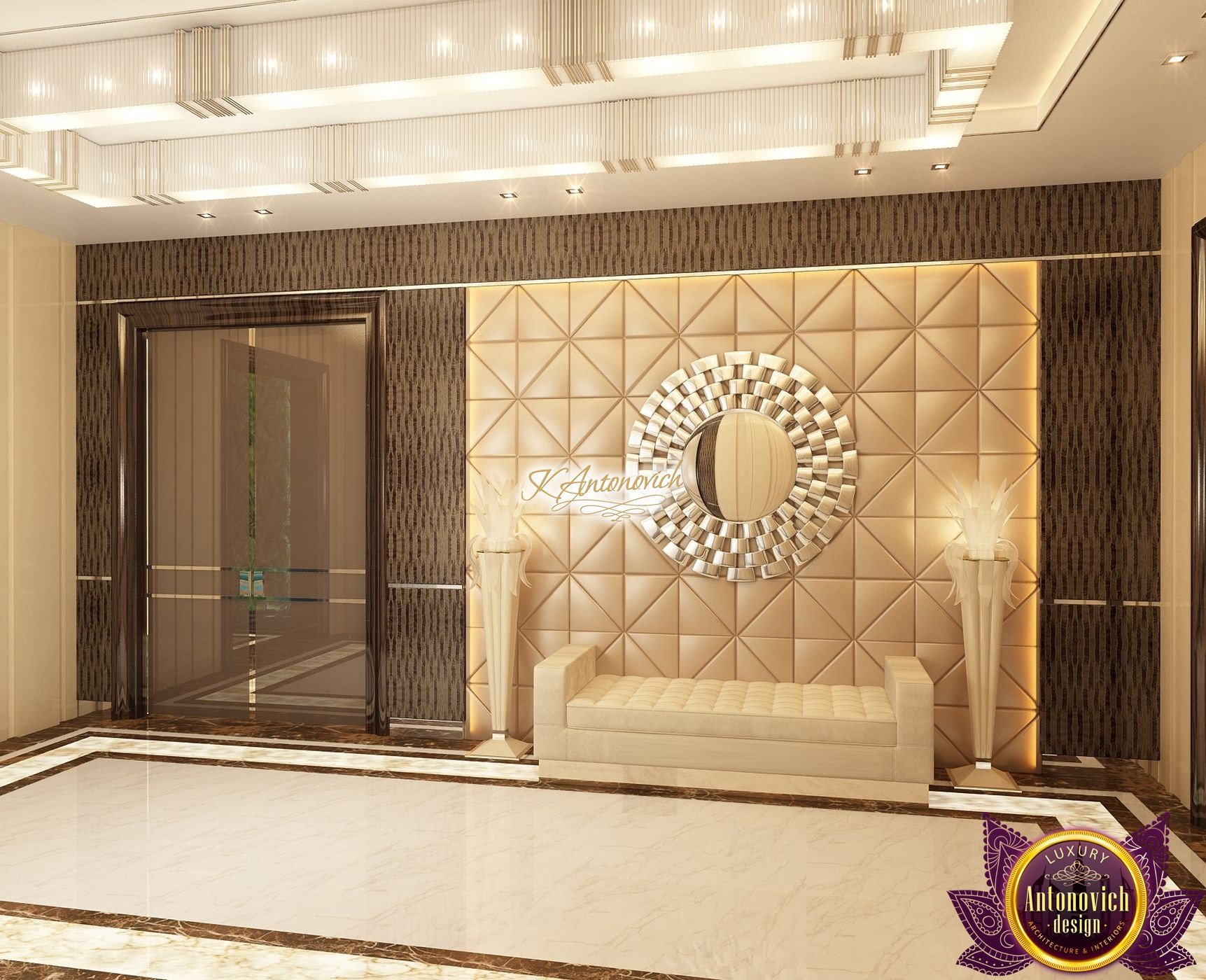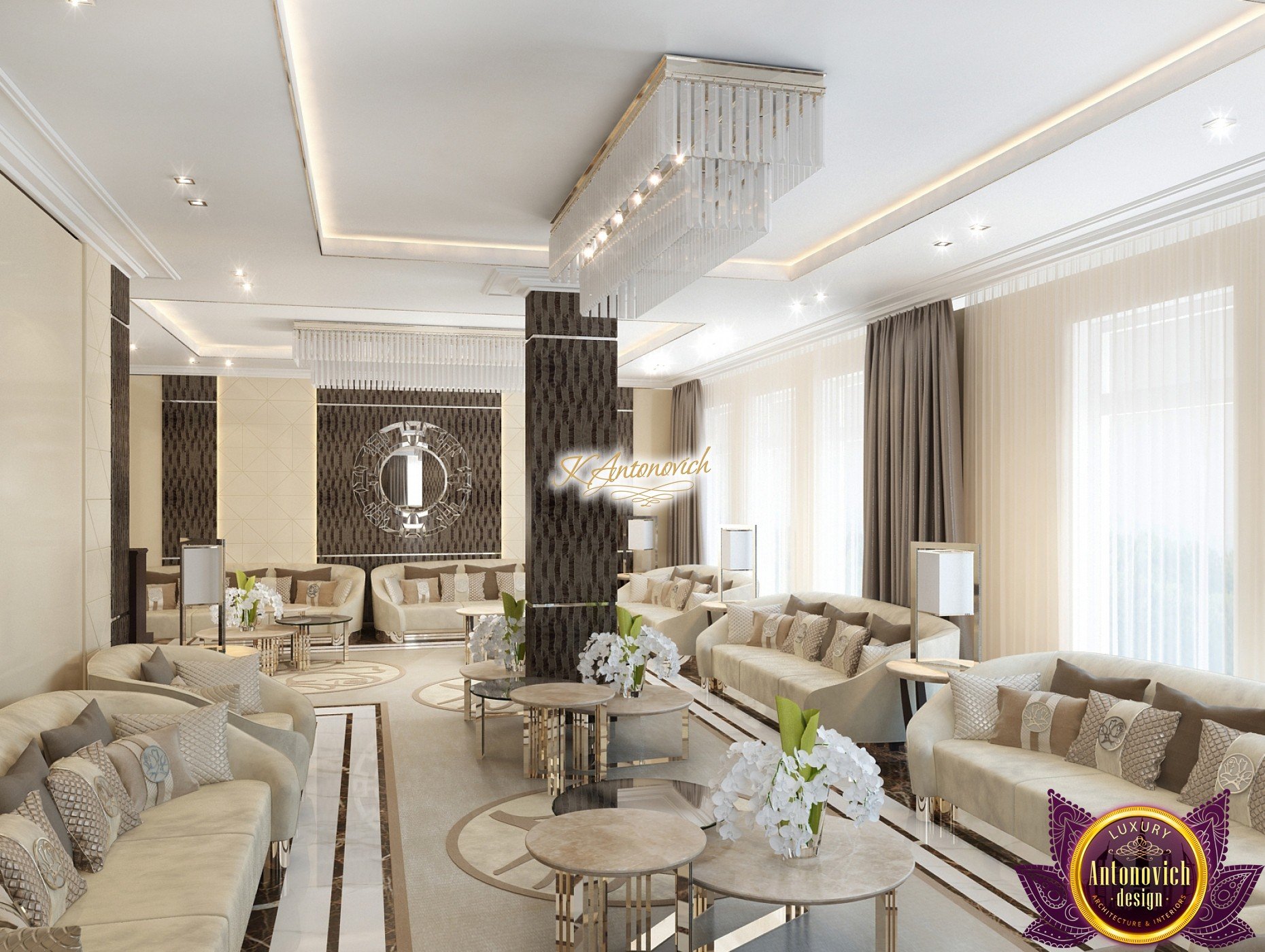 Interior design, as an art, of the studio Luxury Antonovich Design, is creating unique masterpieces of luxury and comfort in a variety of styles. The interior of this luxury villa in the style of modern classics.Each room in the house has acquired its own special character while remaining as a single entity in the overall design concept of the house.The living room is dominated a monochrome range of beige and chocolate colors. A large number of soft sofas says that the house has a cheerful and friendly atmosphere. The silk curtains in the living room, shade of milk chocolate became a cozy addition.Extravagant wall decor blends with the flooring design.The living room is extended to the spacious dining room, which confirms the kindness and hospitality of the owners of the house.Overall, in pastel shades very bright and juicy looks 18 soft seats upholstered in velvet blue hue. No less luxurious and modern look has the kitchen with a dining area.For this part of the space house, designers proposed style of minimalism.Fine materials and the perfect organization of the space give the kitchen a very nice and respectable look.At the same time, the interior is very comfortable and ergonomic.A spiral staircase with graceful curves connects the two floors of the house.Each of marble steps is highlighted. In order to visually enlarge the space of staircase portal designers used in the decoration of the walls mirrored panels with bevel. In these panels reflected wonderfully a beautiful chandelier in art deco style.Soft decor panels of leather, solid lacquered wood, and vertical greening on walls filling the interior with particularly cozy and warm mood.