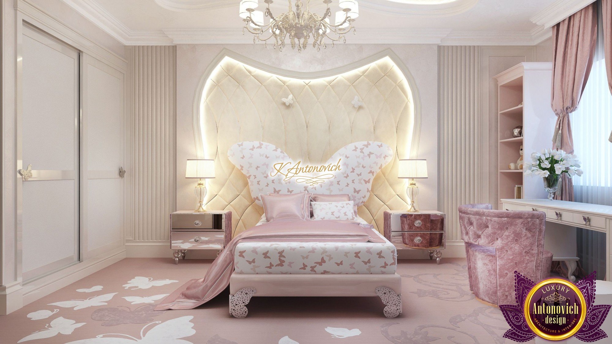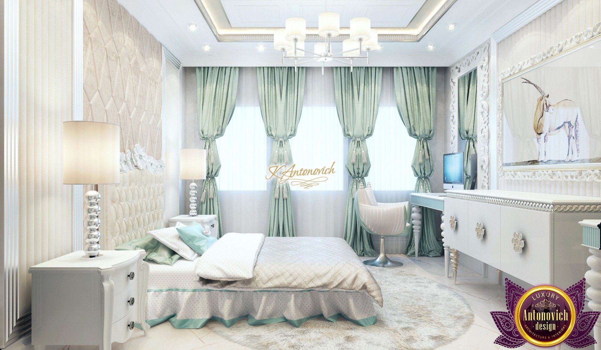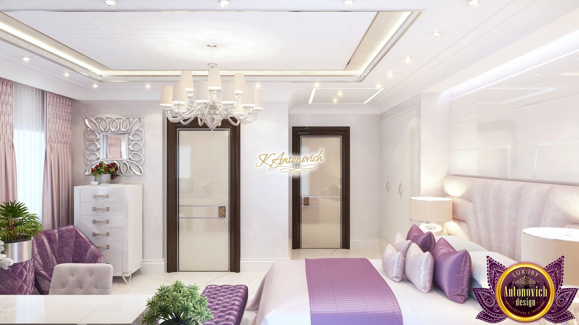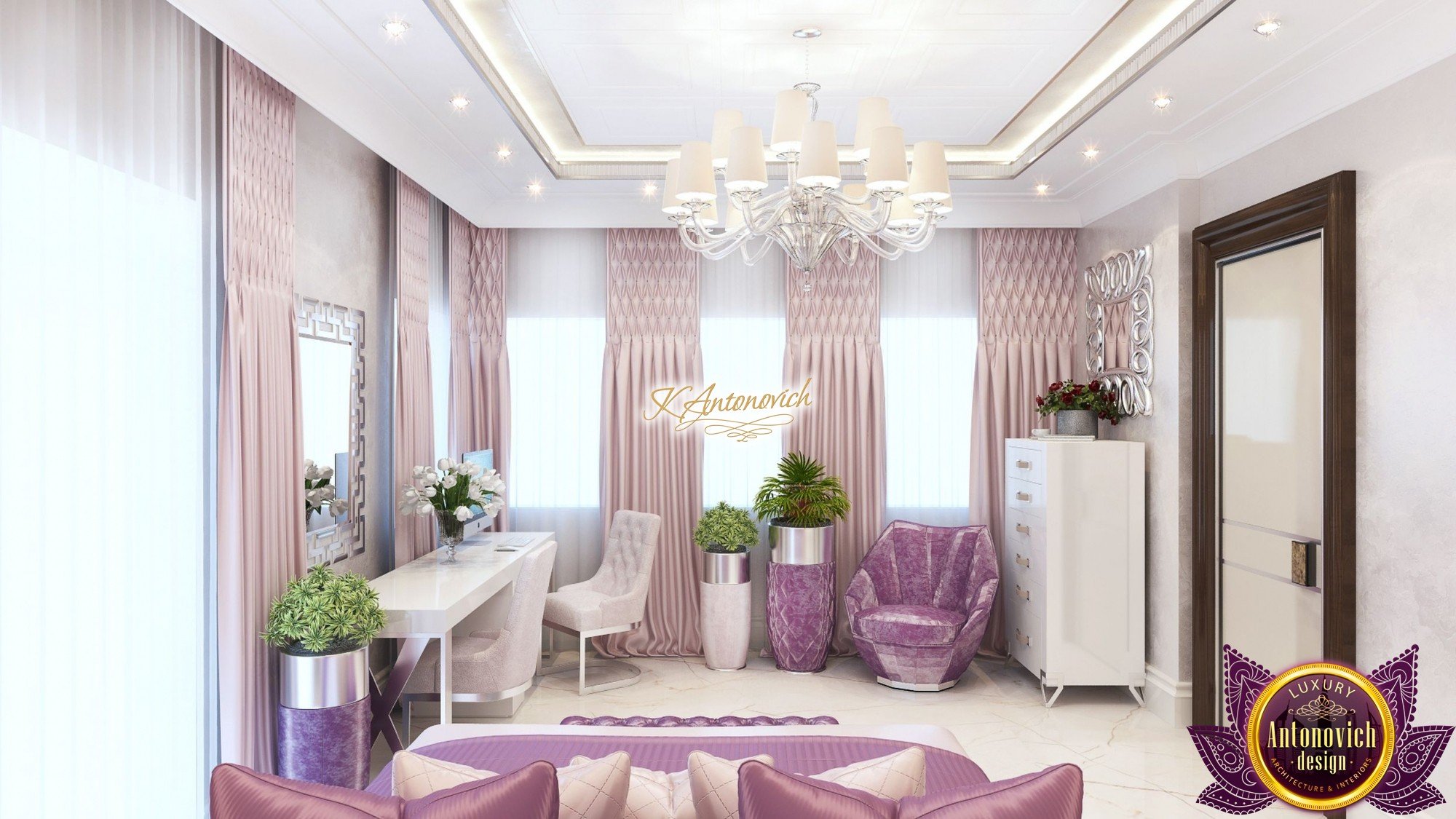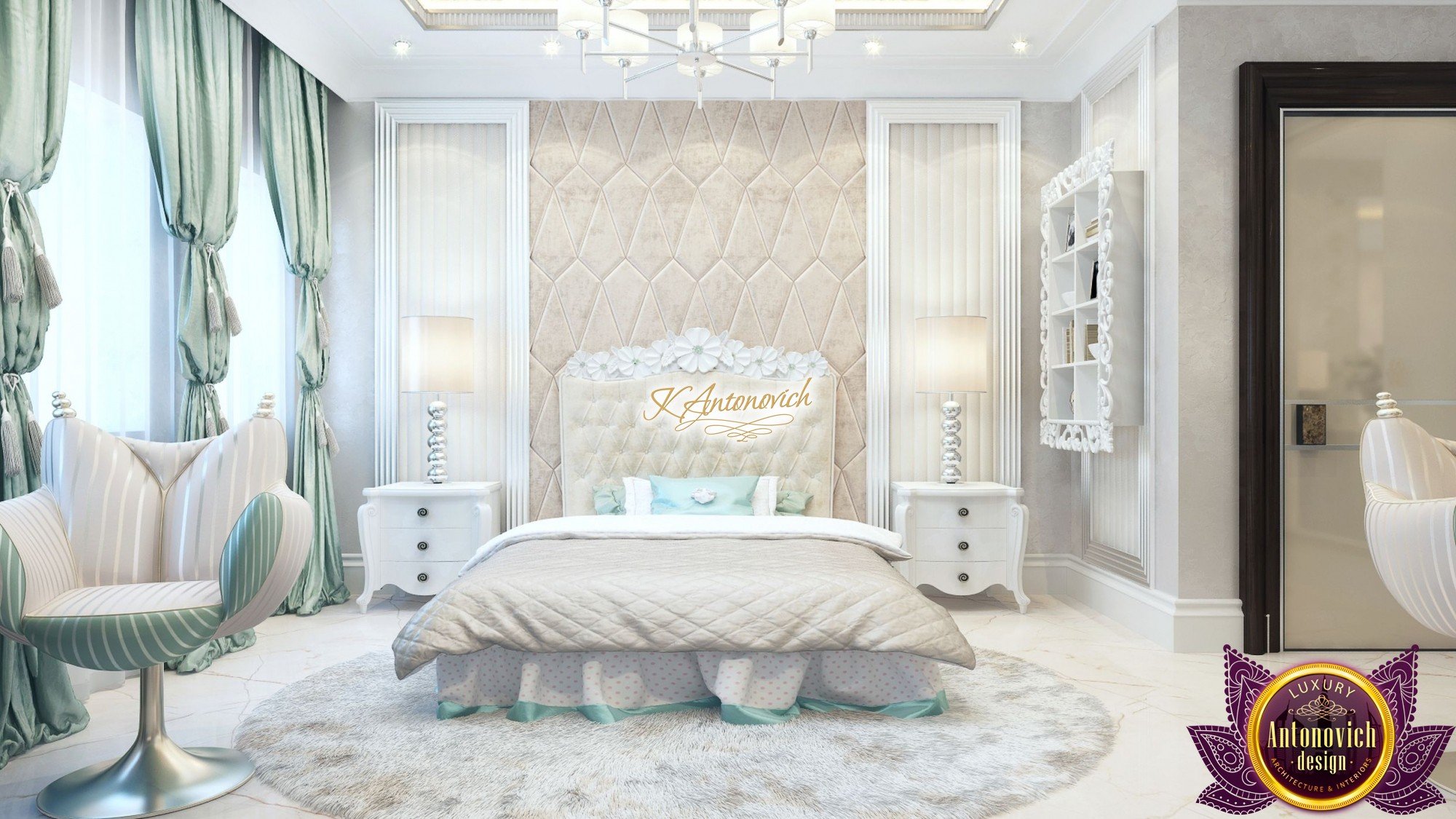 Interior design, as an art, of the studio Luxury Antonovich Design, is creating unique masterpieces of luxury and comfort in a variety of styles. The interior of this luxury villa in the style of modern classics.Each room in the house has acquired its own special character while remaining as a single entity in the overall design concept of the house.The living room is dominated a monochrome range of beige and chocolate colors. A large number of soft sofas says that the house has a cheerful and friendly atmosphere. The silk curtains in the living room, shade of milk chocolate became a cozy addition.Extravagant wall decor blends with the flooring design.The living room is extended to the spacious dining room, which confirms the kindness and hospitality of the owners of the house.Overall, in pastel shades very bright and juicy looks 18 soft seats upholstered in velvet blue hue. No less luxurious and modern look has the kitchen with a dining area.For this part of the space house, designers proposed style of minimalism.Fine materials and the perfect organization of the space give the kitchen a very nice and respectable look.At the same time, the interior is very comfortable and ergonomic.A spiral staircase with graceful curves connects the two floors of the house.Each of marble steps is highlighted. In order to visually enlarge the space of staircase portal designers used in the decoration of the walls mirrored panels with bevel. In these panels reflected wonderfully a beautiful chandelier in art deco style.Soft decor panels of leather, solid lacquered wood, and vertical greening on walls filling the interior with particularly cozy and warm mood.