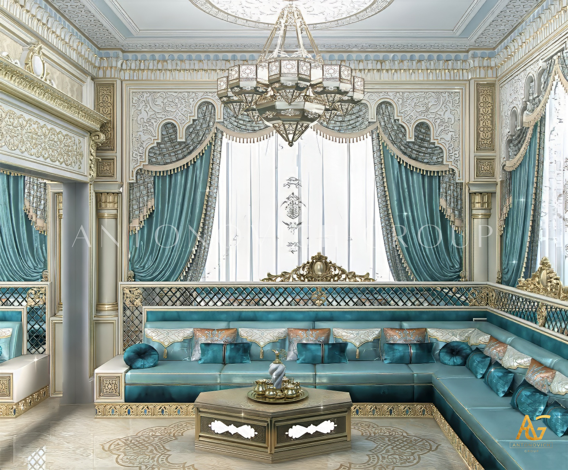 Arabic majlis interior design usually has a very detailed design with a touch of glam and elegance. Selecting every furniture design and decorations that will fill in the Arabic majlis interior is another challenging task for every interior designer. Most of the Arabic majlis sitting requires a customized furniture design that only a professional interior design company Dubai has the ability to perform. Luxury Antonovich Design is the most trusted architecture and interior design company that has the full ability and capacity to perform an extra luxurious and stylish Arabic majlis interior design as well as producing a set of customized furniture designs such as a Moroccan style sitting. In fact, this amazing Arabic majlis interior design with a Moroccan style sitting was indeed one of the masterpieces that the Luxury Antonovich design has been created. Take a look at how artistic the sitting arrangement and the detailed carvings have been perfectly engraved with a special lighting accent in Arabic design. Even the set of center tables has its detailed carvings that are perfectly stunning and suitable with the full majlis arrangement. What makes this Arabic majlis interior extra stunning is the walls and its artistic carvings in a set of window style decorations that blends the entire majlis interior design.