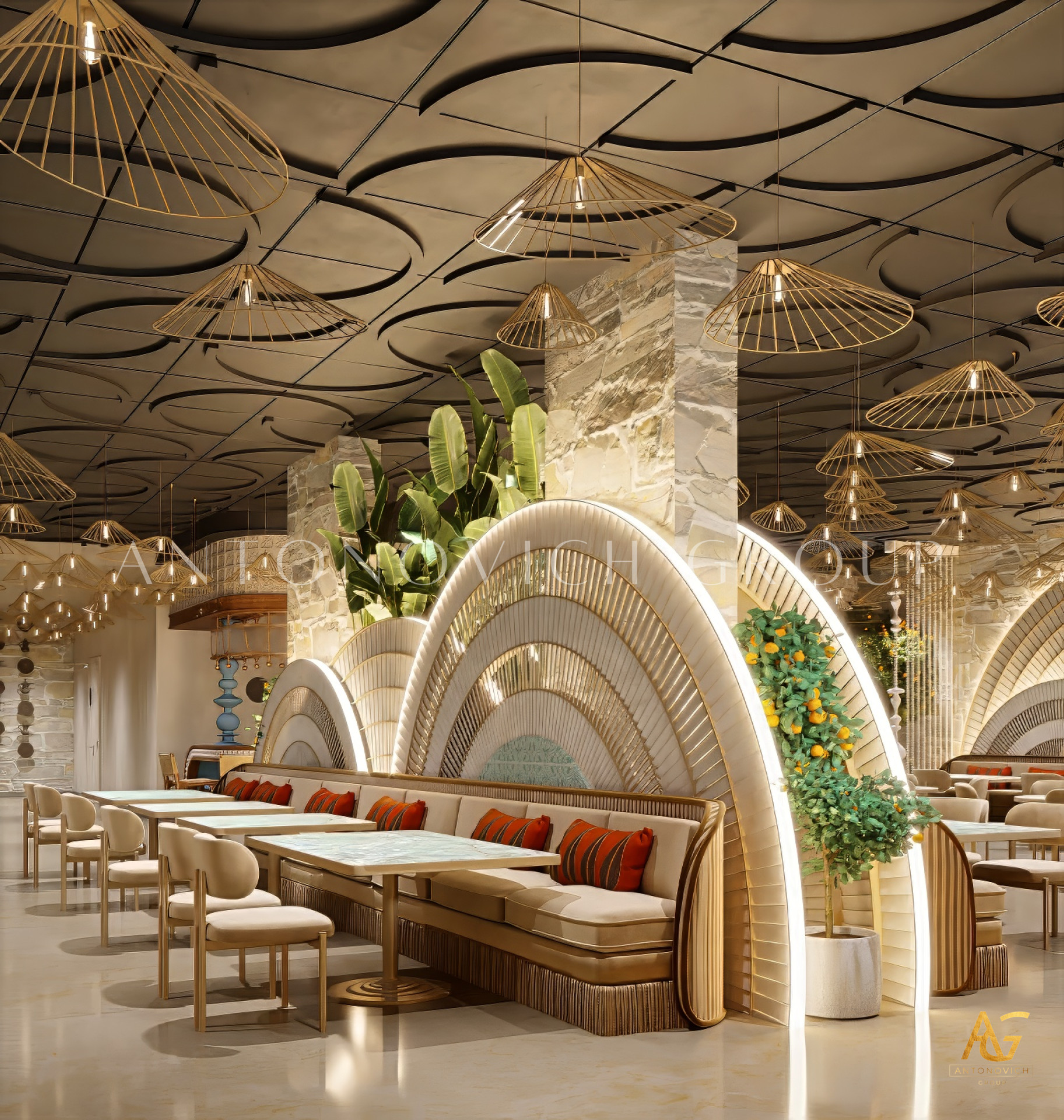 Antonovich Group also incorporates smart architectural design solutions, such as acoustic optimization, advanced kitchen ventilation systems, and ergonomic space planning — ensuring that every aspect of the restaurant’s architecture contributes to its functionality and success.