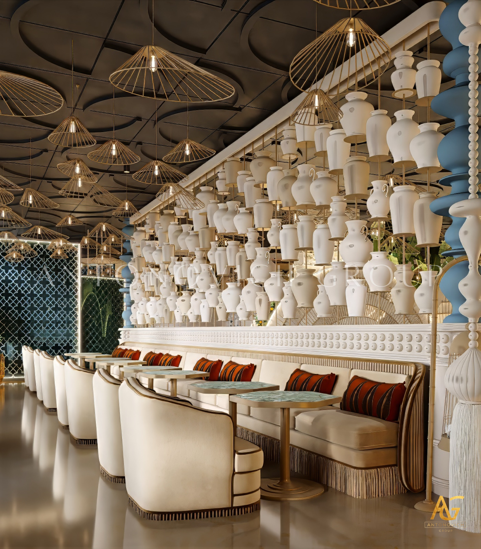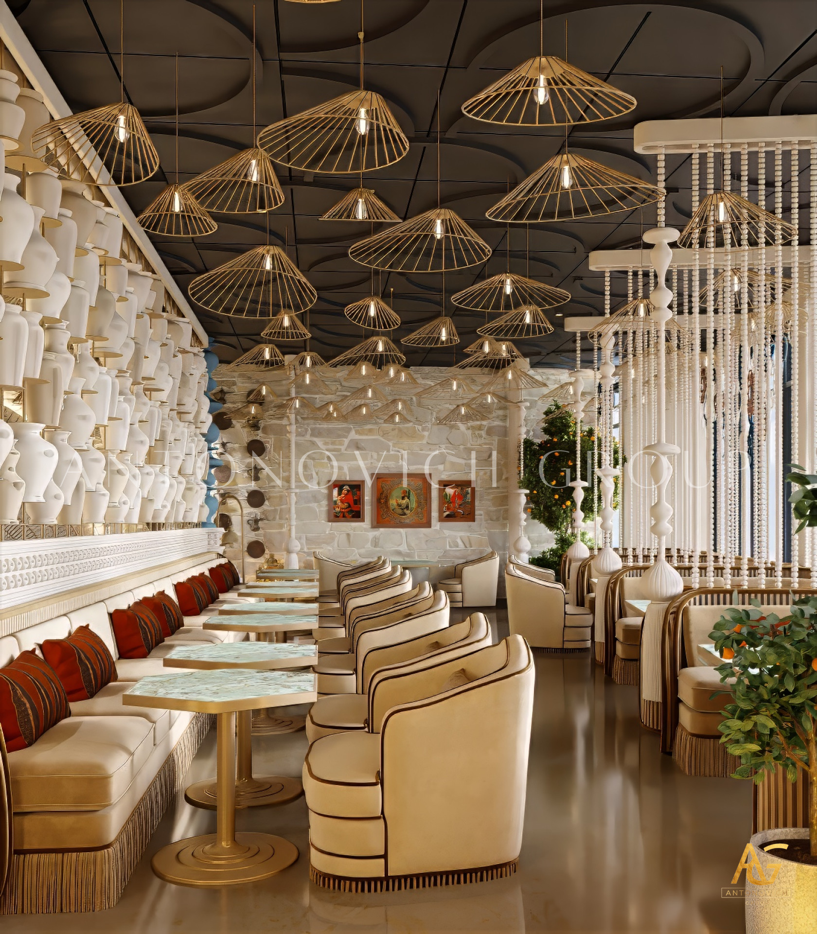 In addition, Antonovich Group is known for its bespoke joinery and furniture production, which allows clients to enjoy customized pieces designed specifically for their restaurant’s theme. From fine dining tables and chairs to lighting fixtures, bar counters, and wall panels, each piece is crafted with artistry and attention to detail, adding character and sophistication to the overall space.