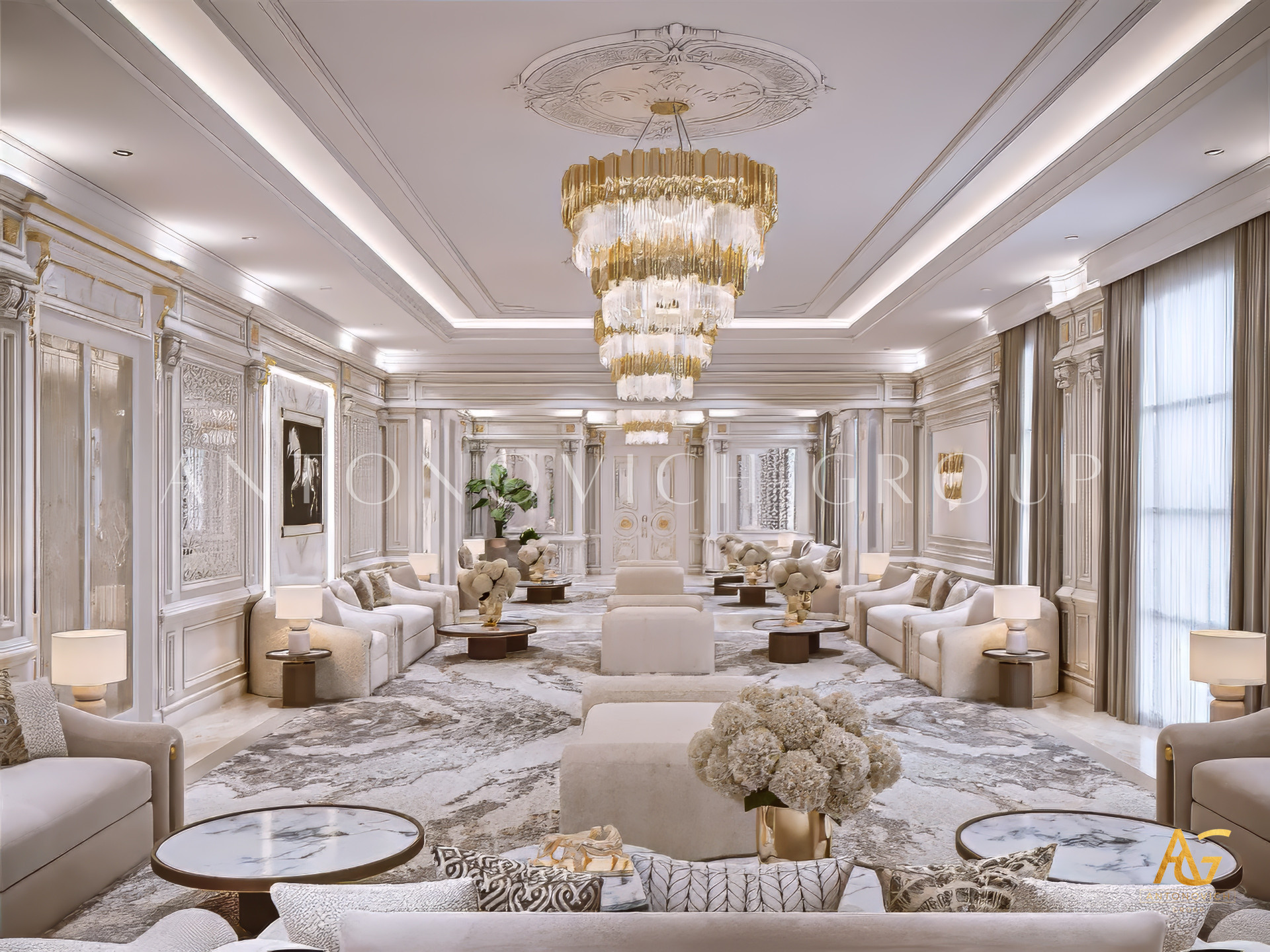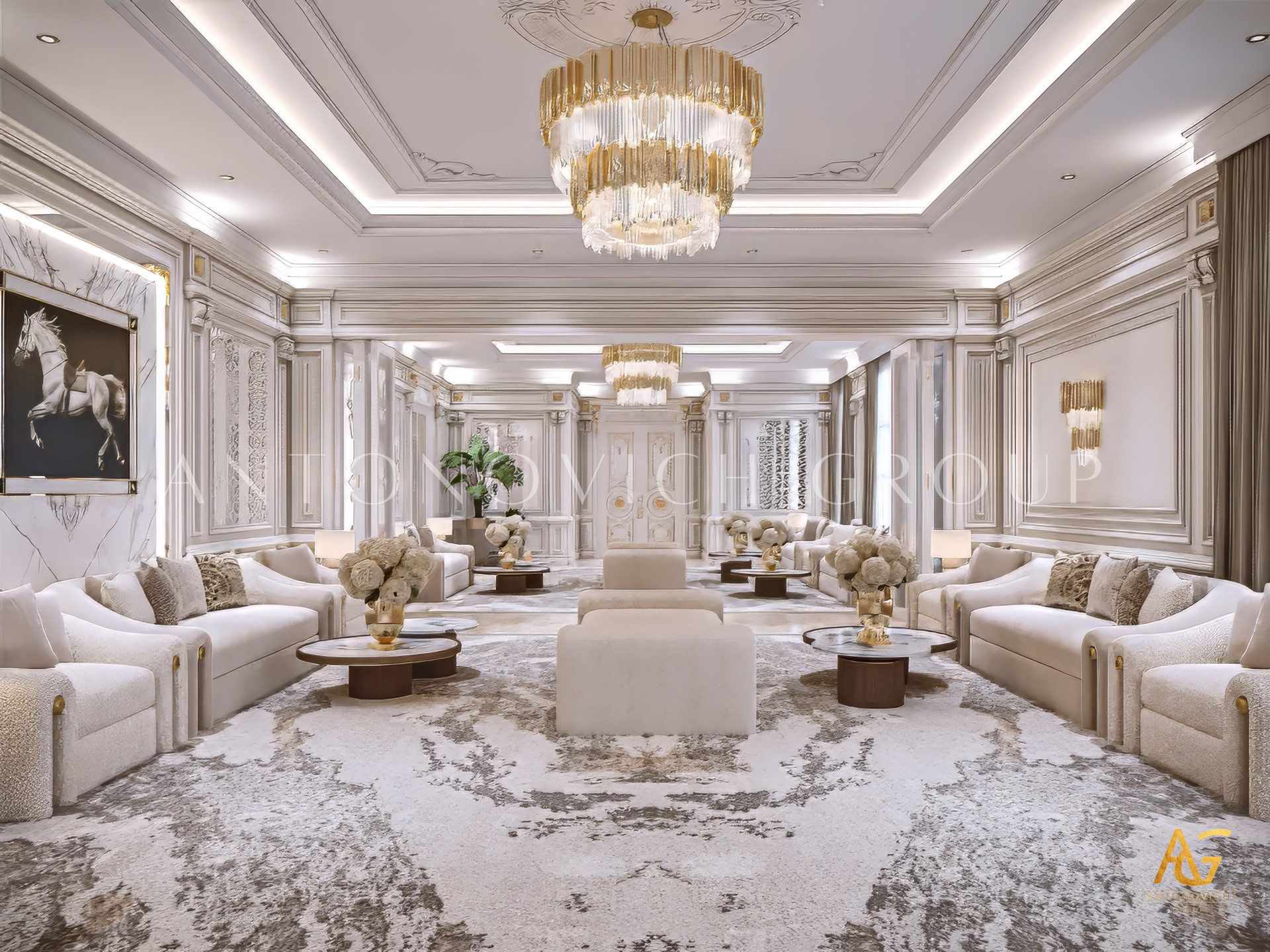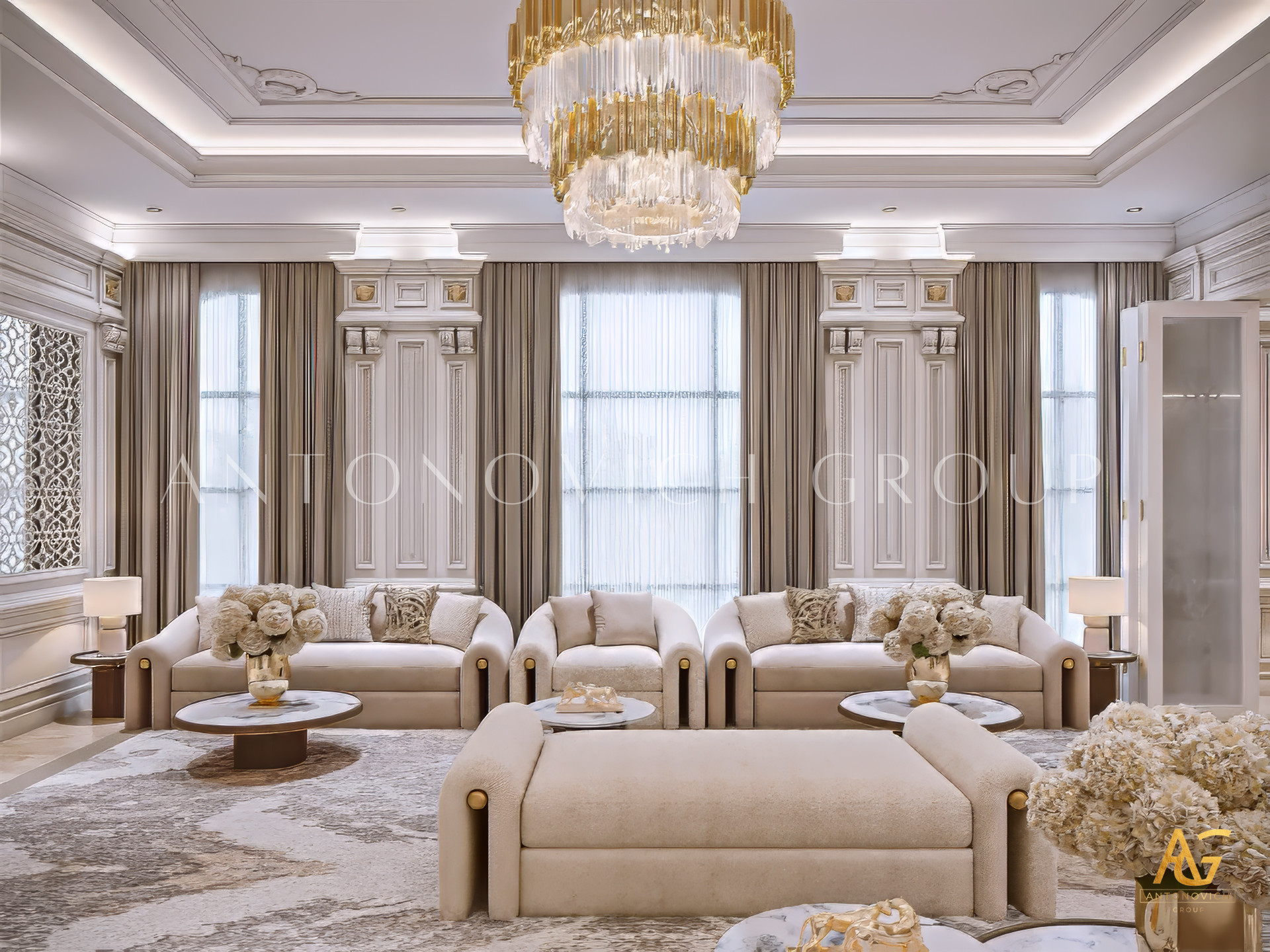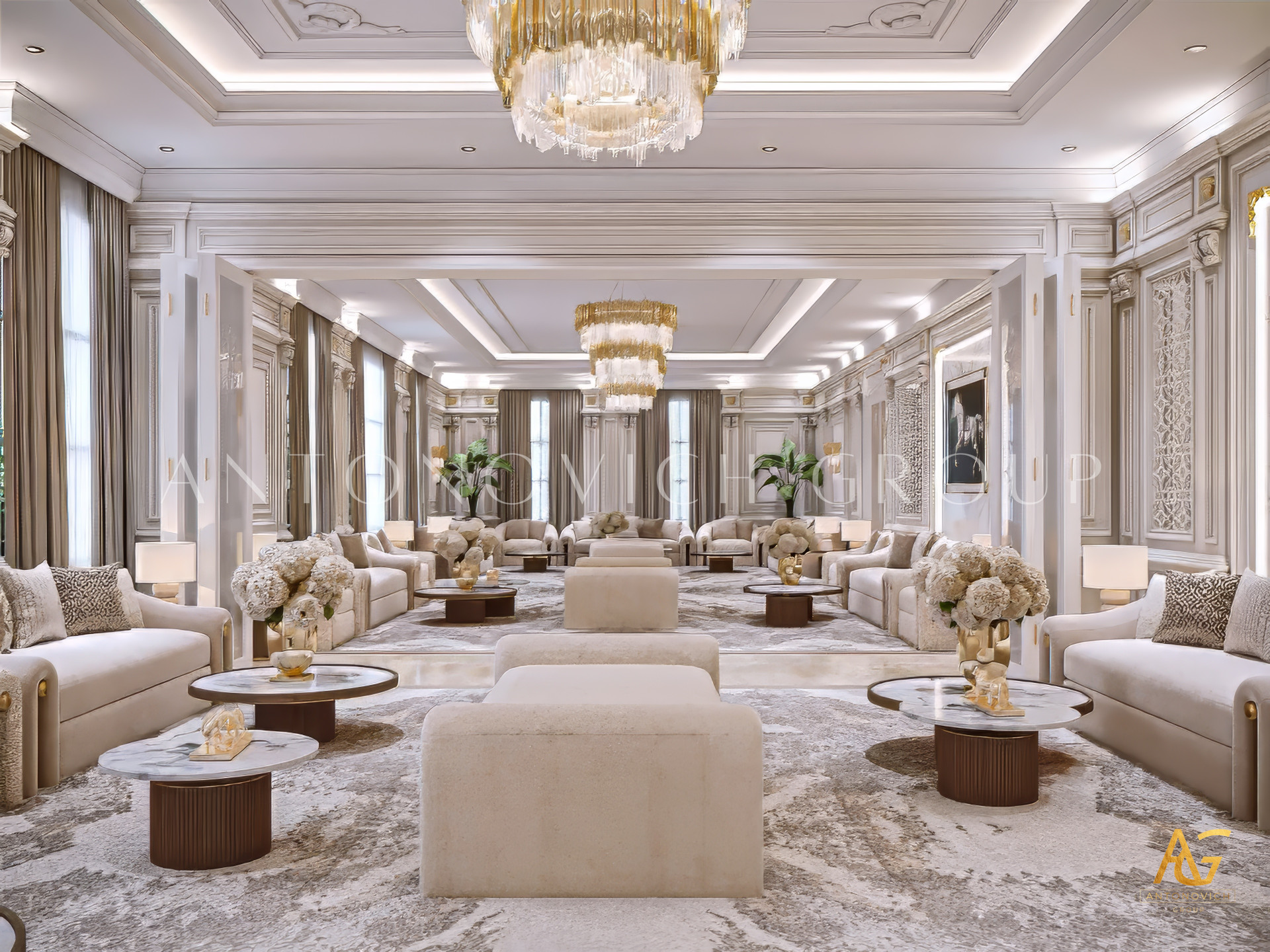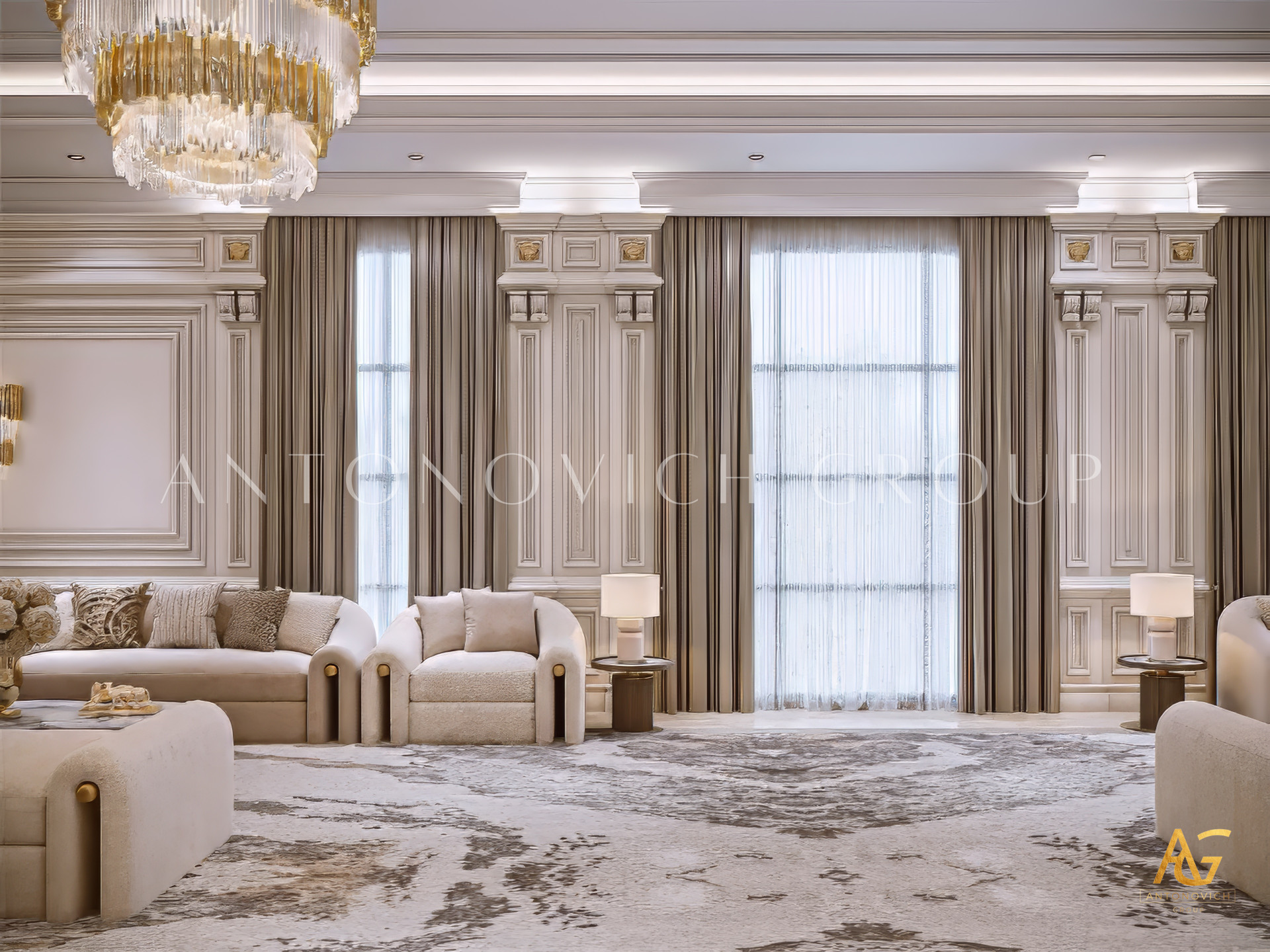Luxury Antonovich Design creates magnificent interiors that are one of a kind and unique. Being a cultural space that is mostly used in social gatherings Majlis is one of their most sought-after interior design. Luxury Antonovich Design is well known for their amazing majlis design that is consisted of different styles – classic, contemporary, whatever your choice of style is they will surely bring out their best designs. The model design above is designed in a more modern look with prime interior design. You will still see a little touch of classic elements presented by the rich textures all around. The inspiration of the interior design is something cozy and decorative. You will notice the luxurious walls that have gold linings which creates a beautiful focal point. This walls will surely be a talk of the party once your guests enter your majlis. It is also furnished with a neutral colored sofa that has a dark colored cushion that creates a contrast to the room. The curtains that drape from the floor to ceiling windows create a nice illusion of an elongated space.