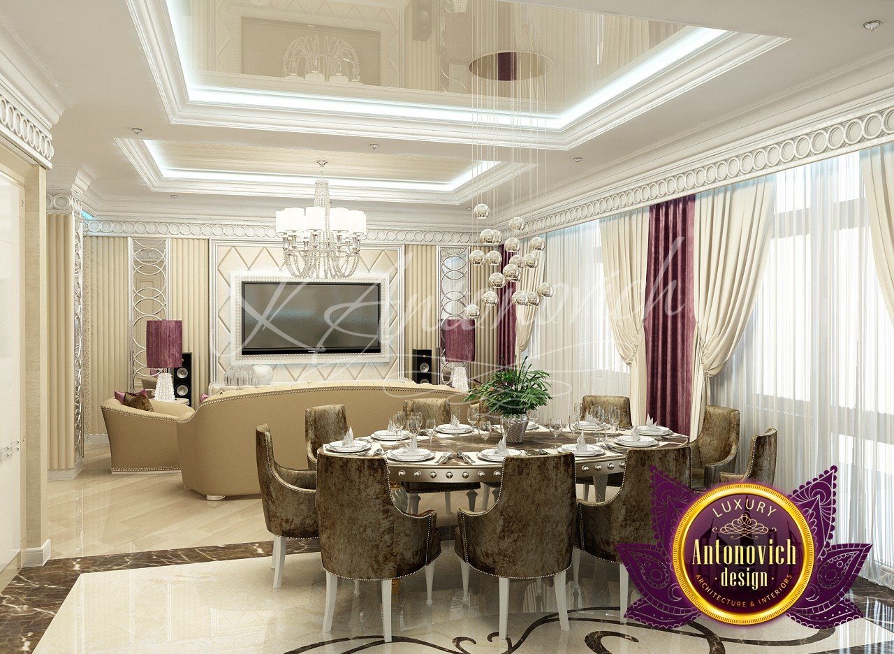 The dining area is equipped with world-class furniture. The bold violet curtain and throw pillow add to the beauty of the aristocrat apartment interior design. Its cream and white look also give the perfect luxury vibe to the apartment. This interior design is completed with luxury patterns that are seen from the television rack to the luxury walls of the rooms.