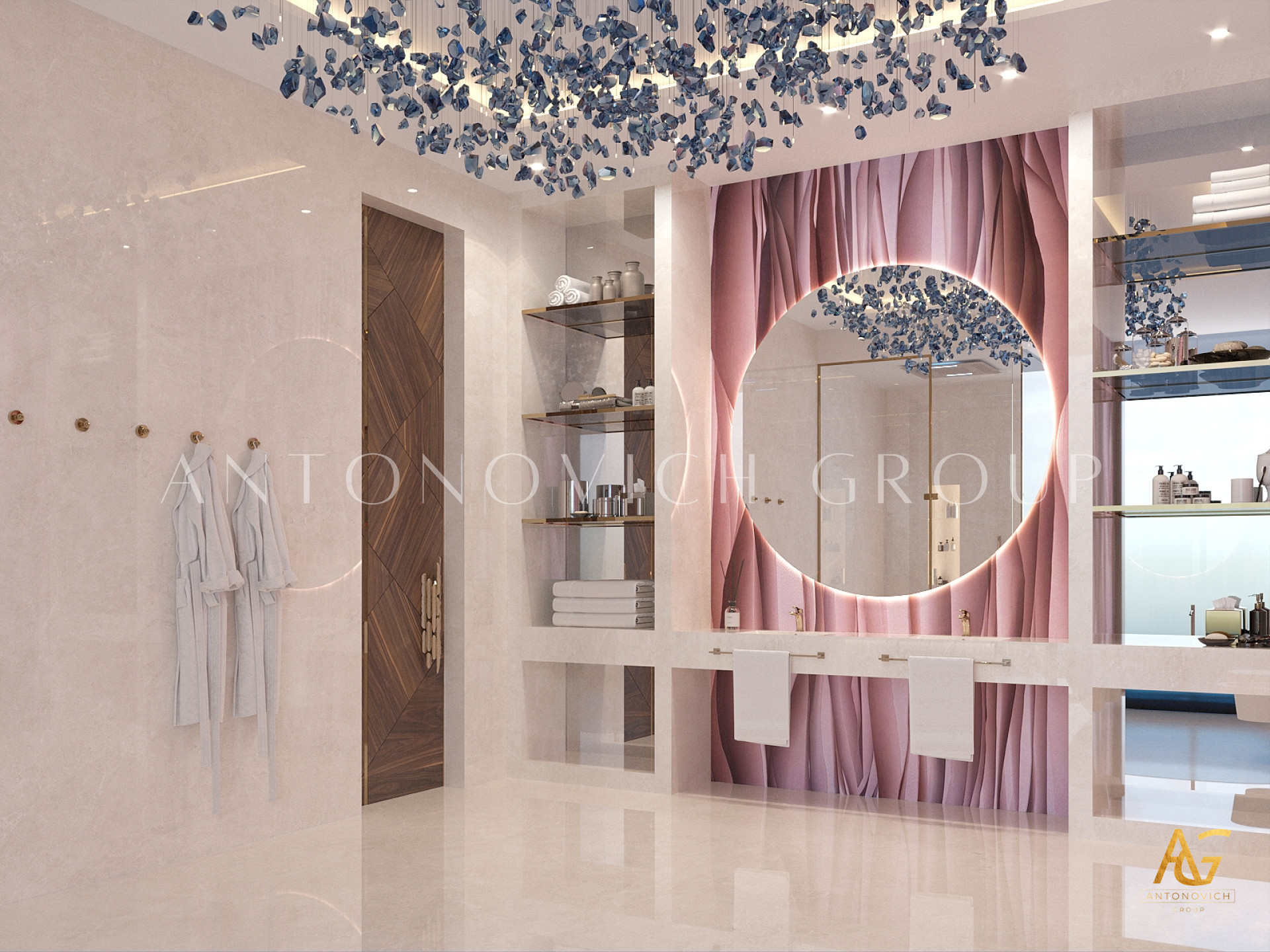 Bathrooms designed by Antonovich Group are not just functional spaces; they are expressions of bespoke luxury. The customized chandeliers and stylish walls become signatures of Antonovich Group's commitment to crafting environments that transcend the ordinary. Every design decision is intentional, transforming the spacious bathroom into an oasis of personalized indulgence.