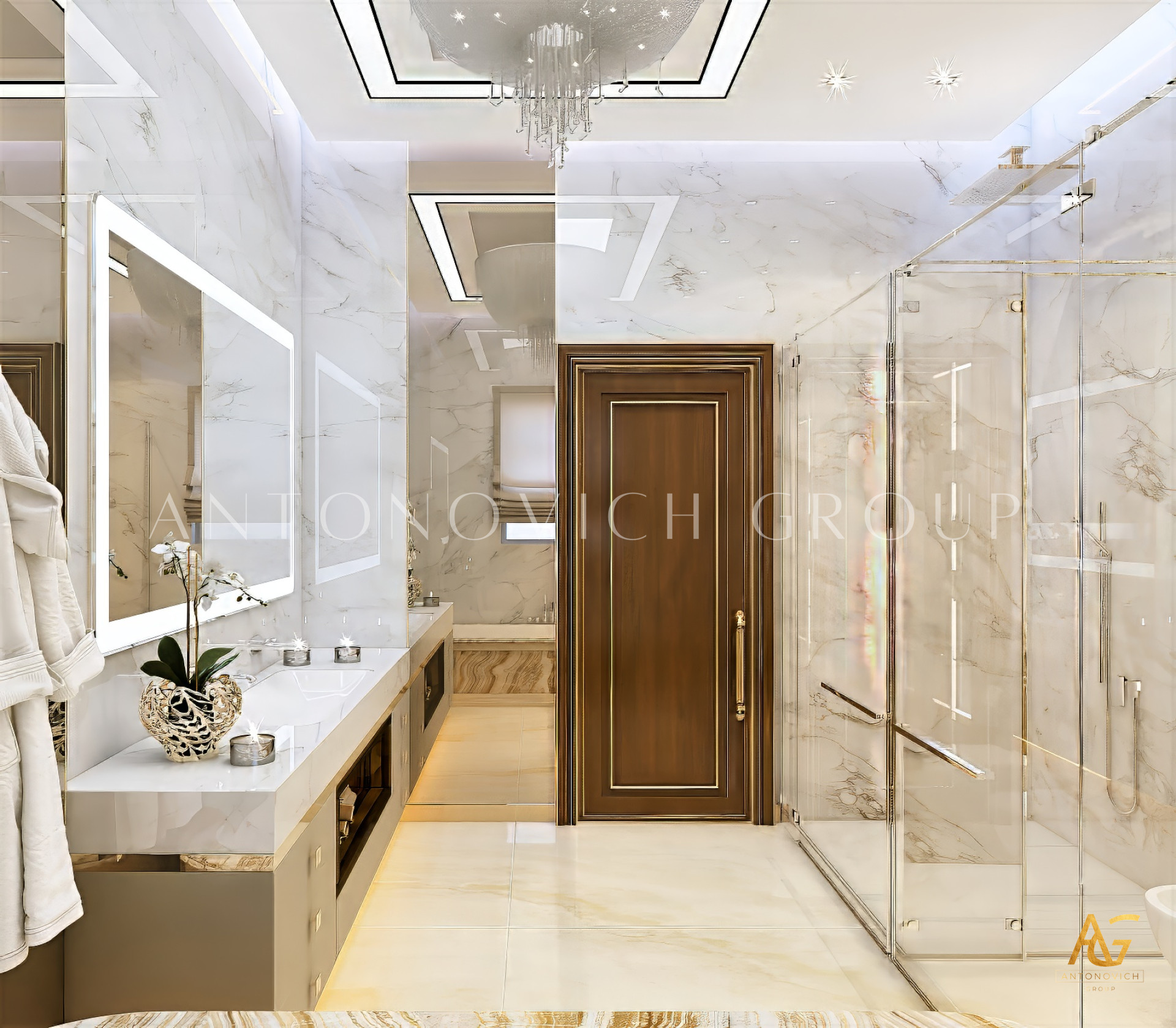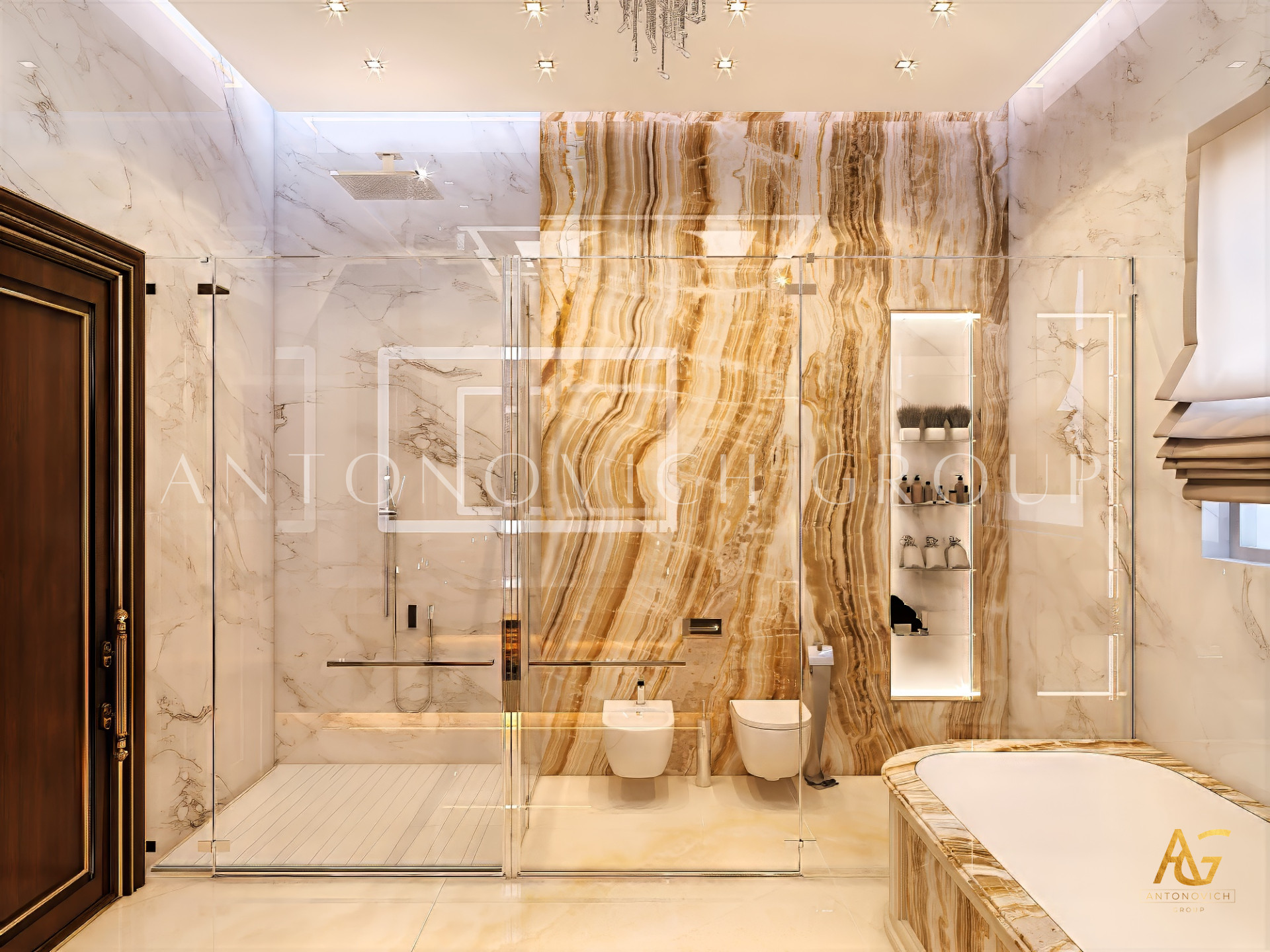 A large mirror in the luxurious bathroom interior design allows you to dress up and apply makeup. This luxurious interior design in Lagos will also appeal to your family because it provides ample space for them to walk around without feeling restricted. The rooms soothing environment is ideal for unwinding after a long day. The luxury bathroom interior design also features a high ceiling, which contributes to the rooms large feel. The golden walls are also very magnificent and the patterns that were created are beautifully done.