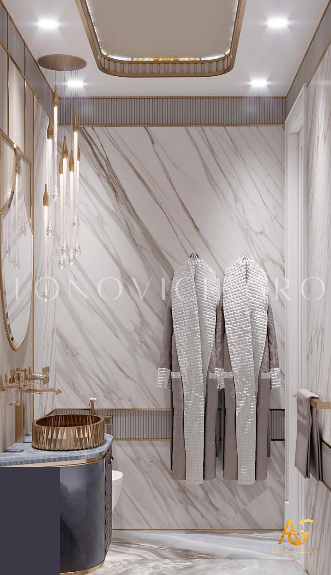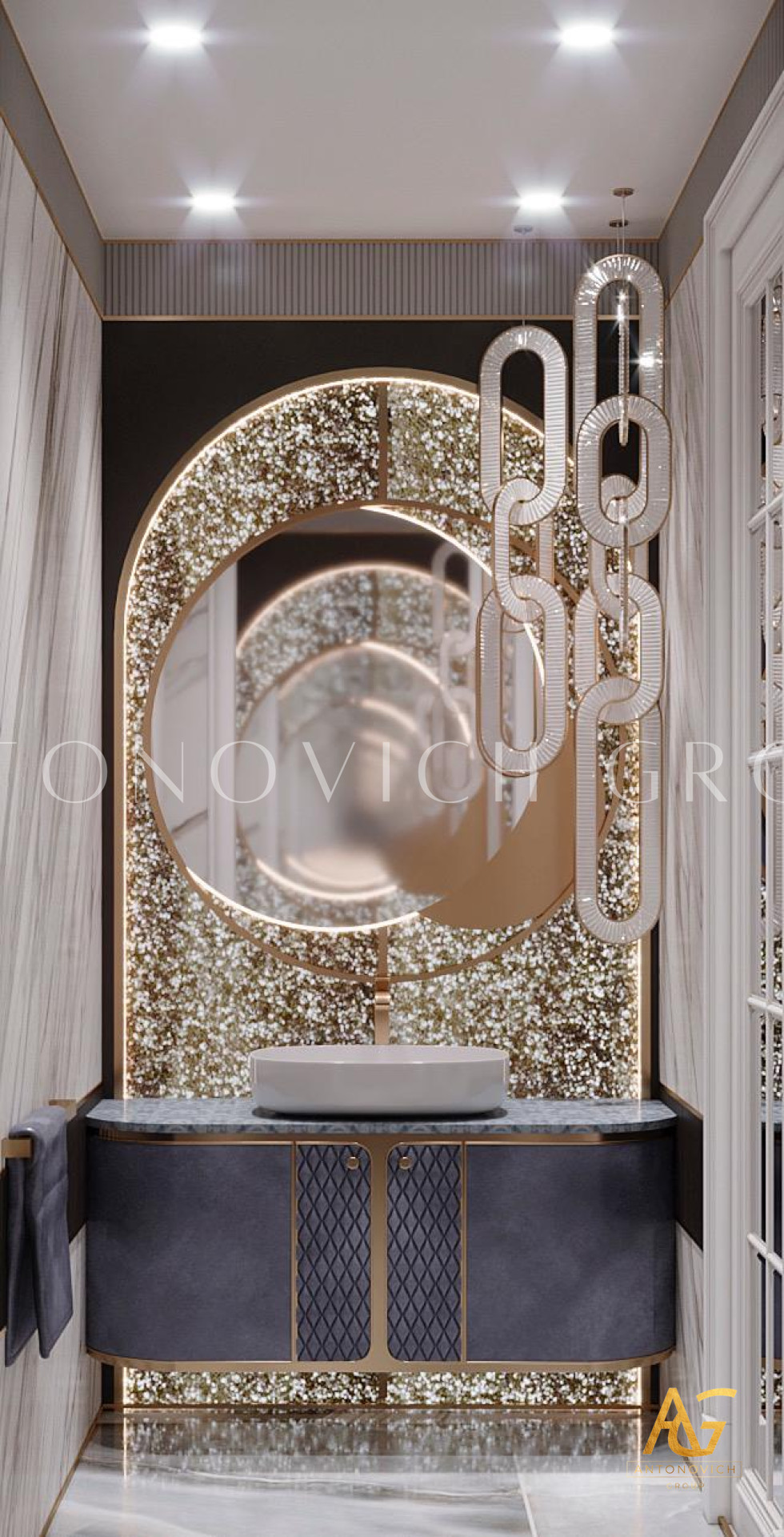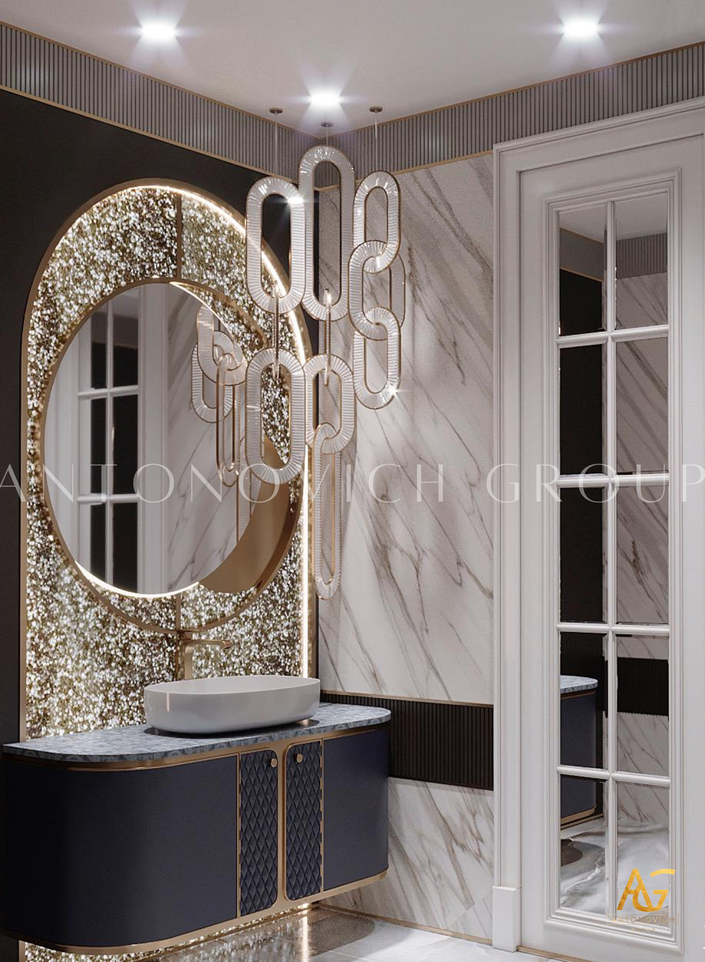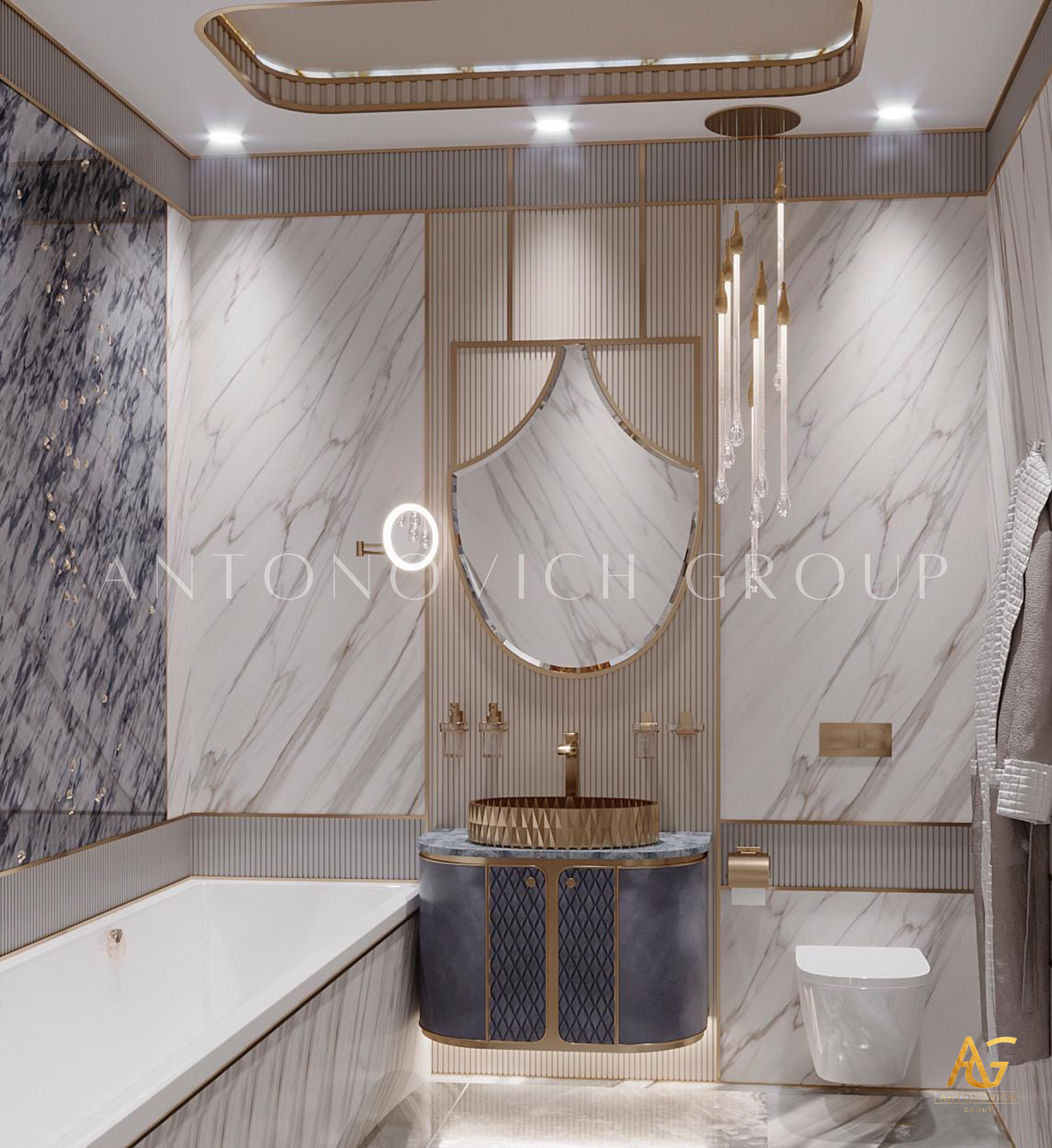 For decoration, it was decided to use light colors, white and beige marble. And dark colors were used for accessories and small details — for accents — gray marble mosaic with golden elements. Mirrors are a separate topic in talking about the interior design of a small bathroom. With their help, we created the illusion of infinity space. Mirrors can be used everywhere: shelves, cabinets, walls, ceiling. Decorators carefully thought out the lighting of a small bathroom by Luxury Antonovich Design. And our professional designers recommend using a multi-level, bright light. Even a small bathroom can be the epicenter of beauty and comfort. The main thing is to correctly decorate the walls, buy the right furniture and plumbing. The style you prefer will also dictate the rules, so consider the nuances.