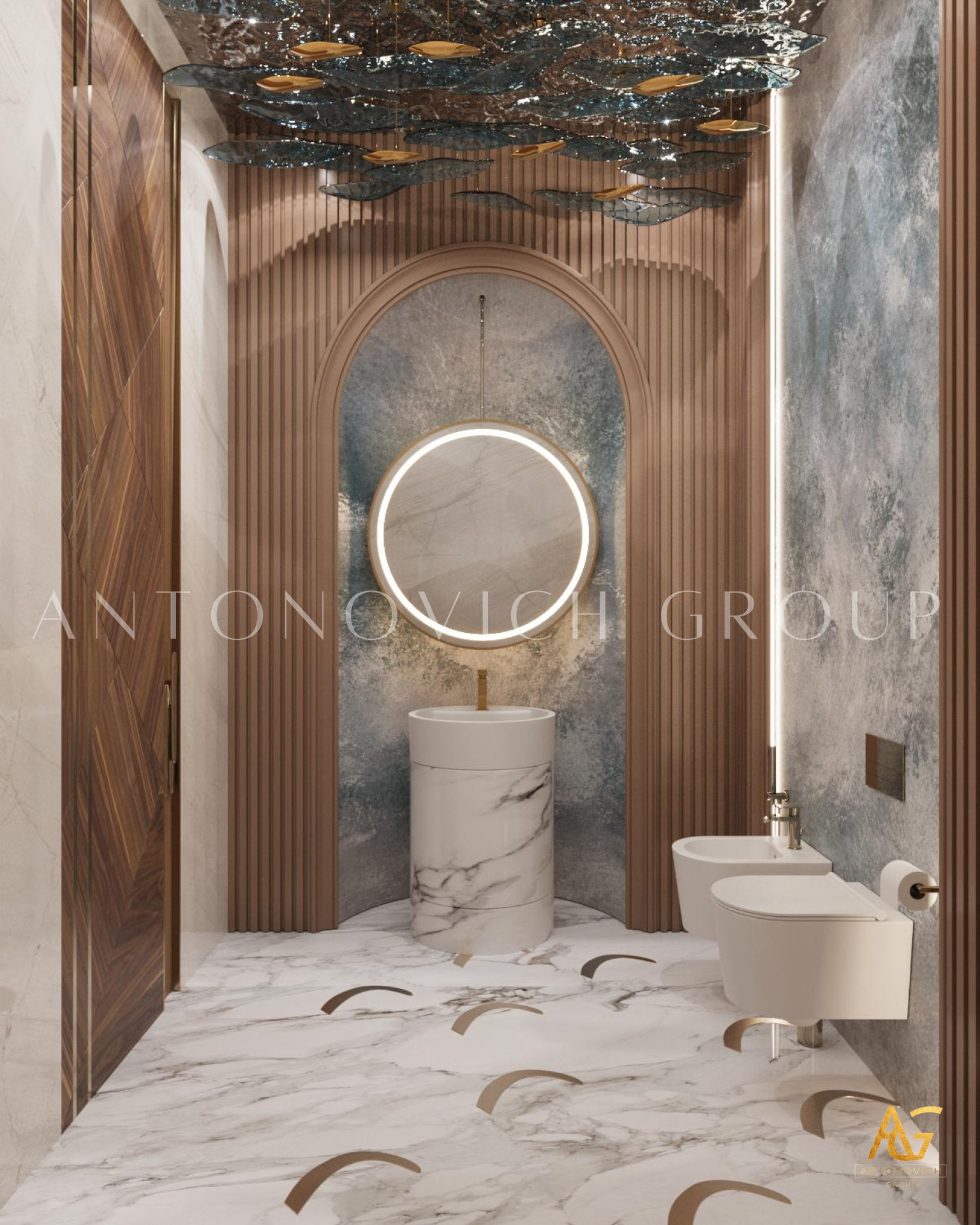 It is critical to ensure that every aspect of the bathrooms, including the décor, is built of high-quality materials and finishes. And, because the Antonovich Group has its own furniture manufacture and factory, every lavish bathroom interior design will undoubtedly accomplish the most ideal arrangement precisely according to the owners requirements. Choosing the right lighting will always add a touch of glam to any bathroom decor, and by making the most artistic ceiling and gypsum, the entire bathroom will attain the ultimate elegance.