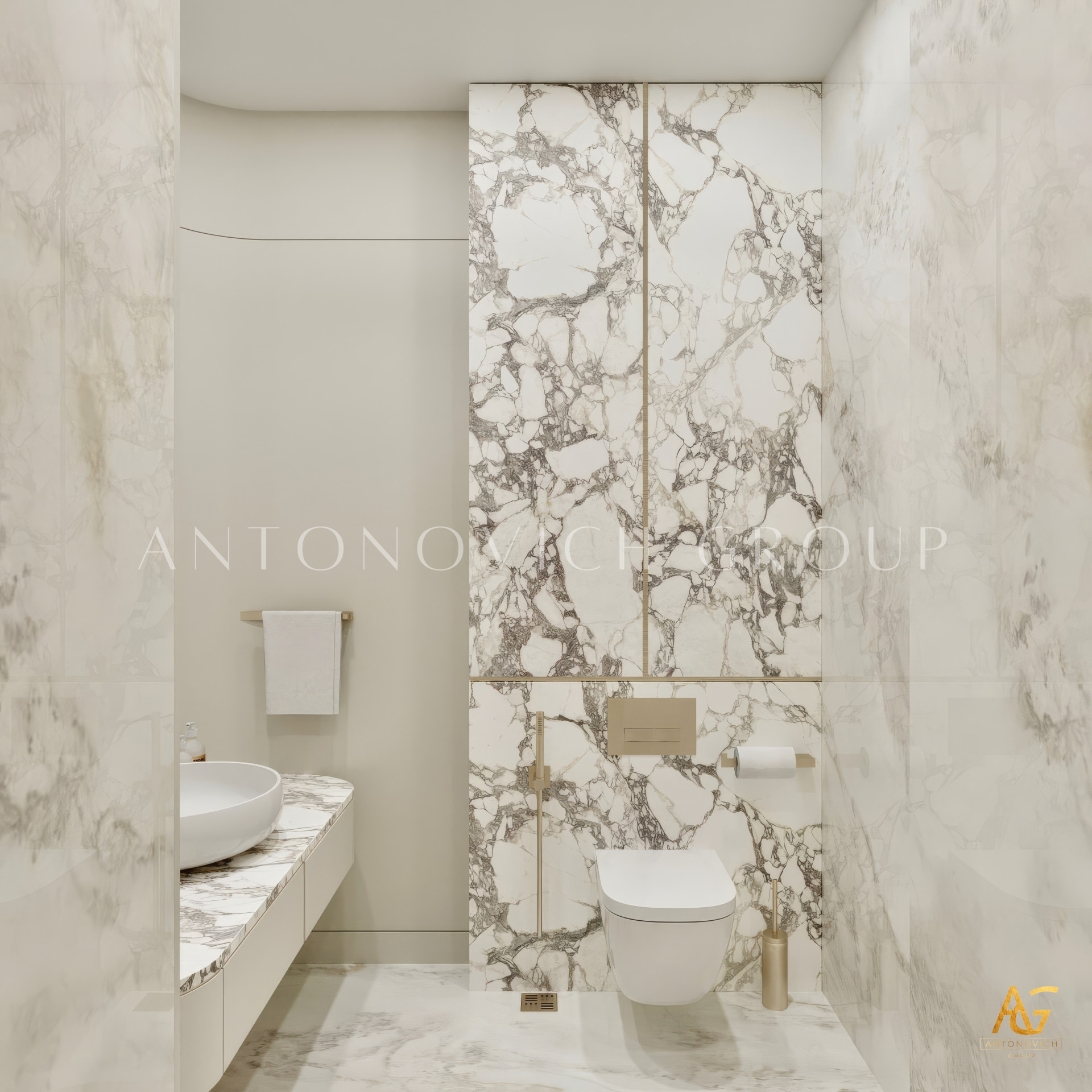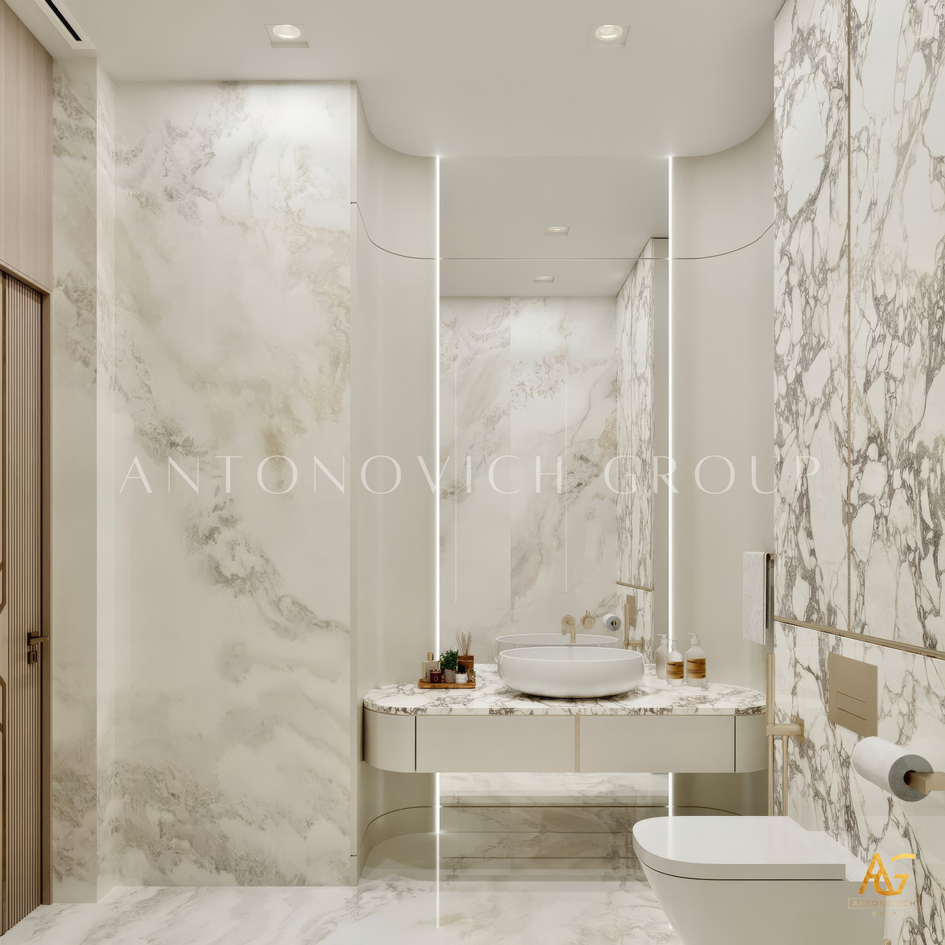 With little space, this bathroom interior design necessitates a modern-luxury idea. Antonovich Group achieves the optimal balance in every bathroom material and sanitary element by completing proper space planning. To complement the interesting bathroom luxury décor, we have chosen only the best and nicest bathroom accessories. Having our own production and manufacturing for every sanitary solution has been a huge advantage for us, allowing us to provide a fully hassle-free and cost-effective service to each of our clients.