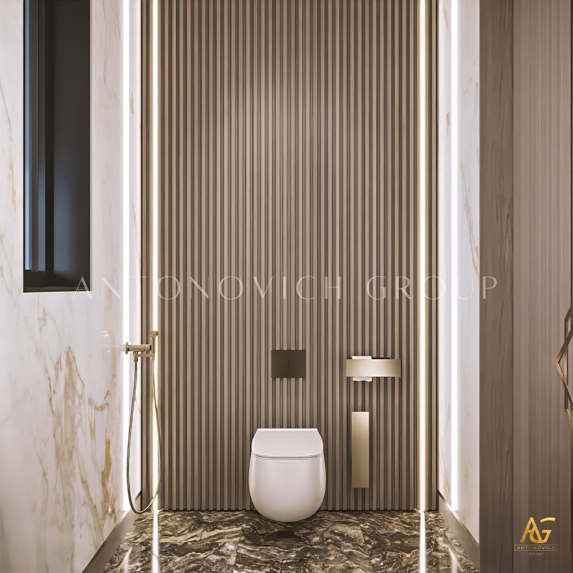 Antonovich Group is not only known for exceptional design concepts but also for delivering turnkey bathroom fit-out solutions. Their in-house team of designers, engineers, and craftsmen oversee the entire process — from concept development to installation and finishing.