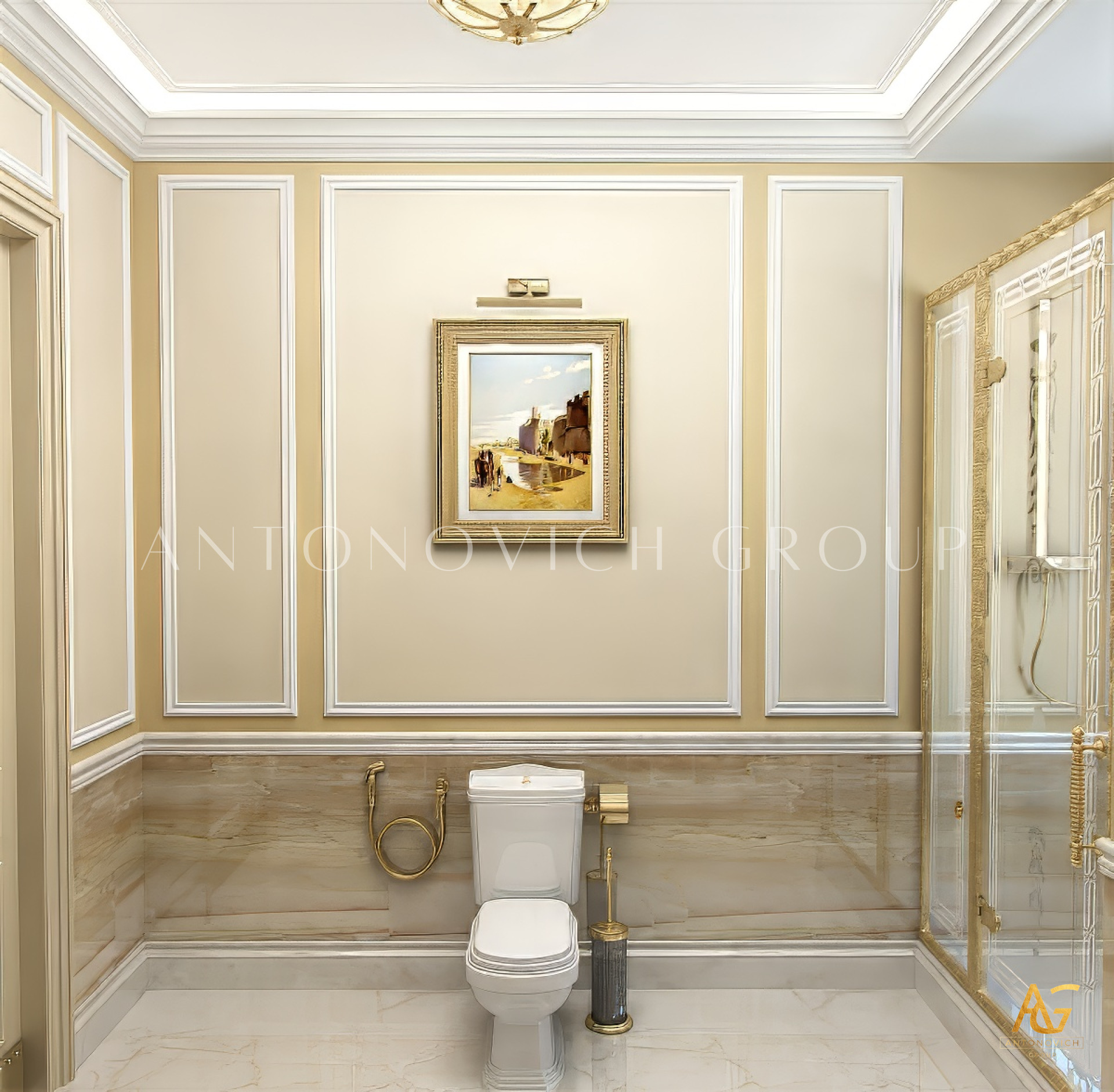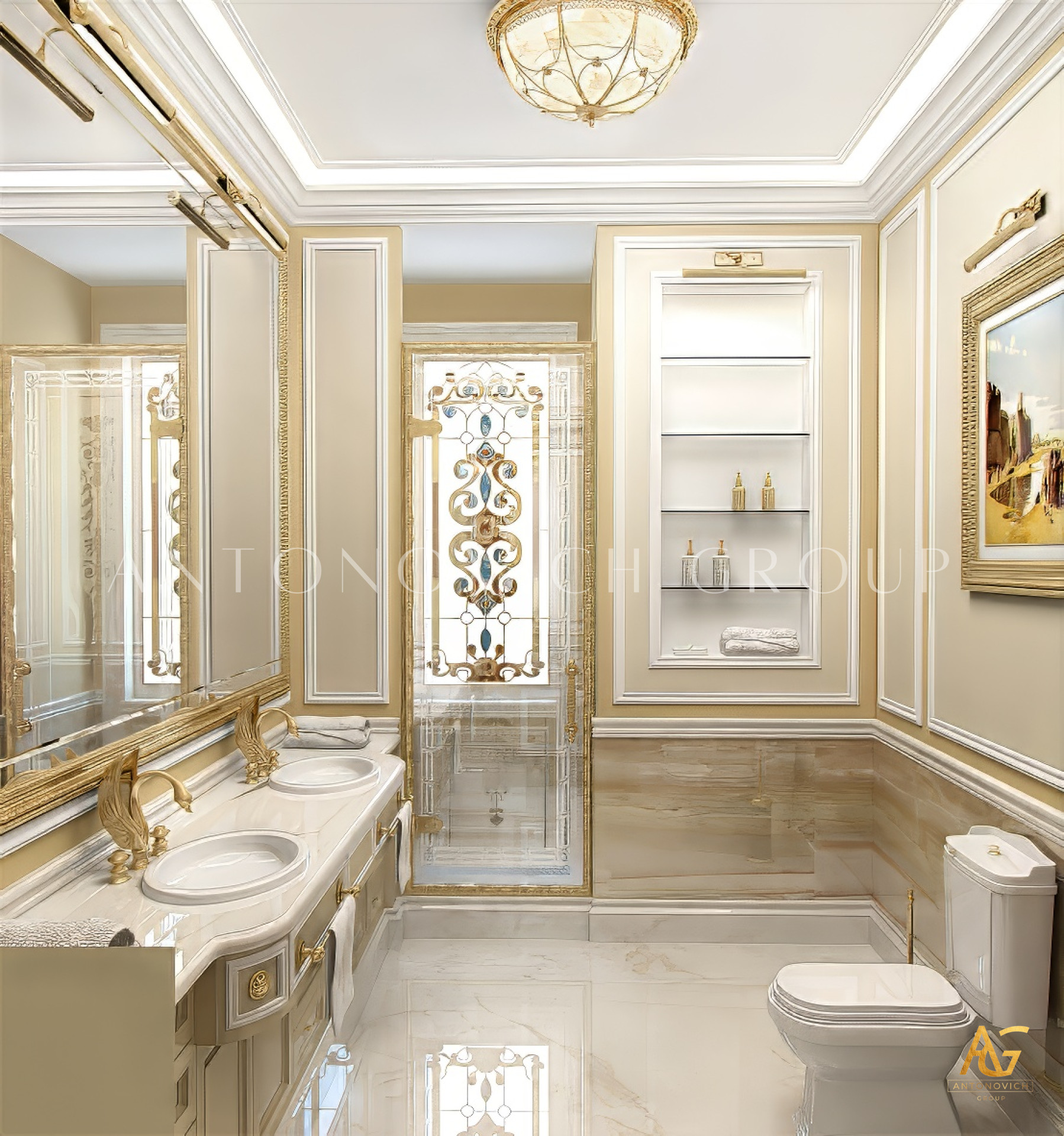 One of Antonovich Group’s signature ideas is the use of premium materials such as Italian marble, onyx, and gold accents to create a lavish atmosphere. The firm’s designers also emphasize smart space planning, integrating custom-made vanities, floating cabinets, and sleek glass enclosures that enhance both practicality and aesthetics.