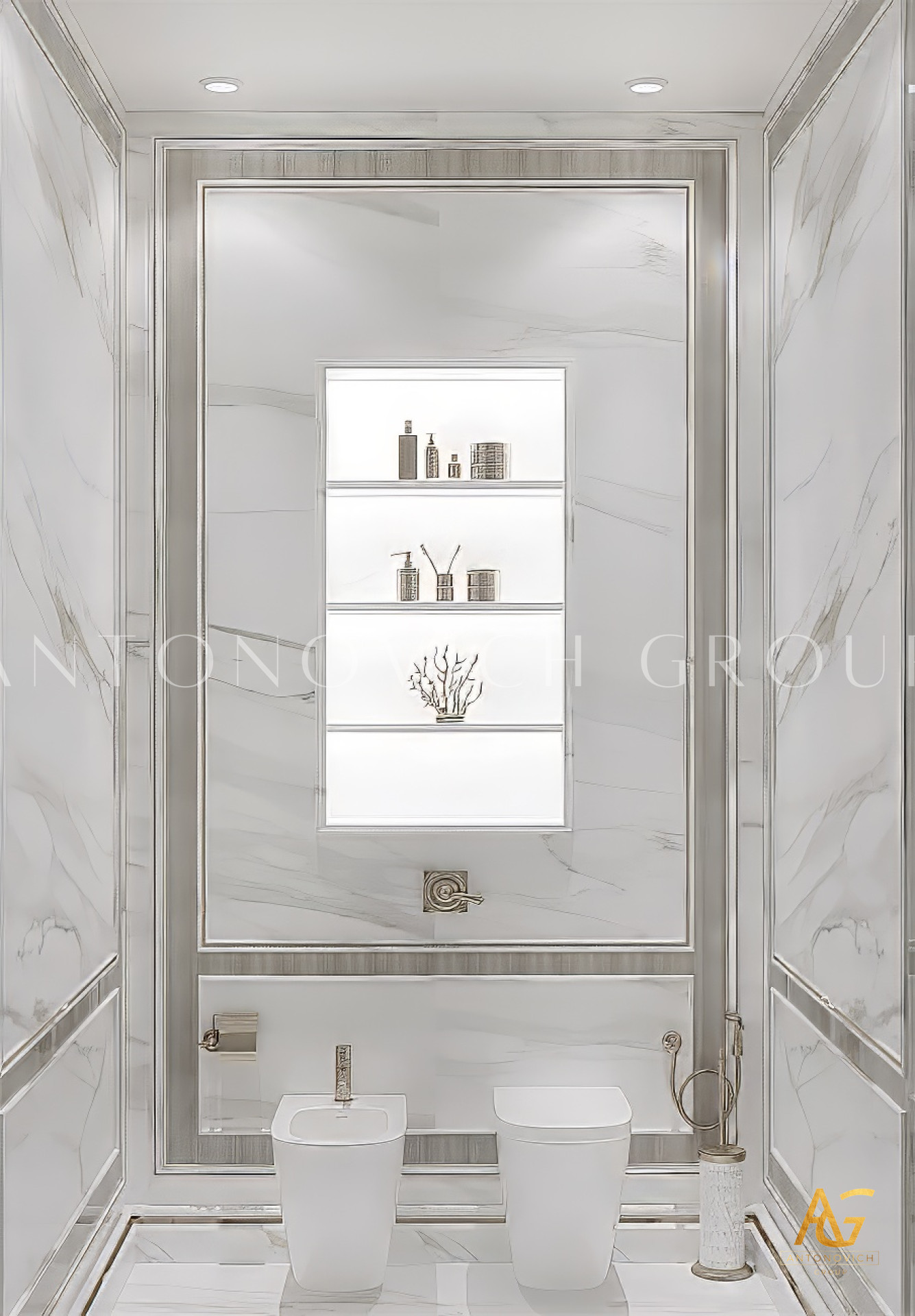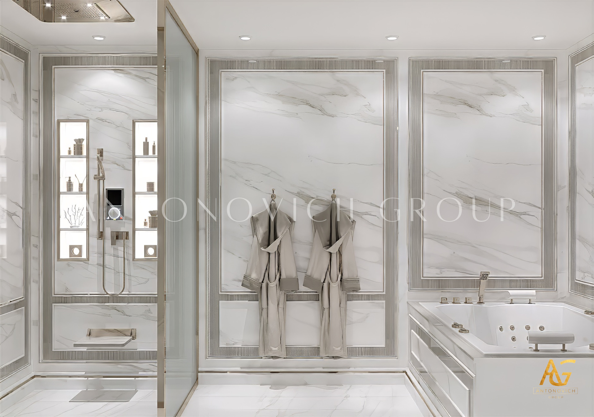 One of the defining features of Antonovich Group’s bathroom designs is the use of high-quality materials. Fine marble, porcelain, glass, natural stone, and warm wood elements are carefully paired to achieve a timeless appeal. Decorative wall panels, elegant tiles, and designer accents enhance visual interest without overwhelming the space.