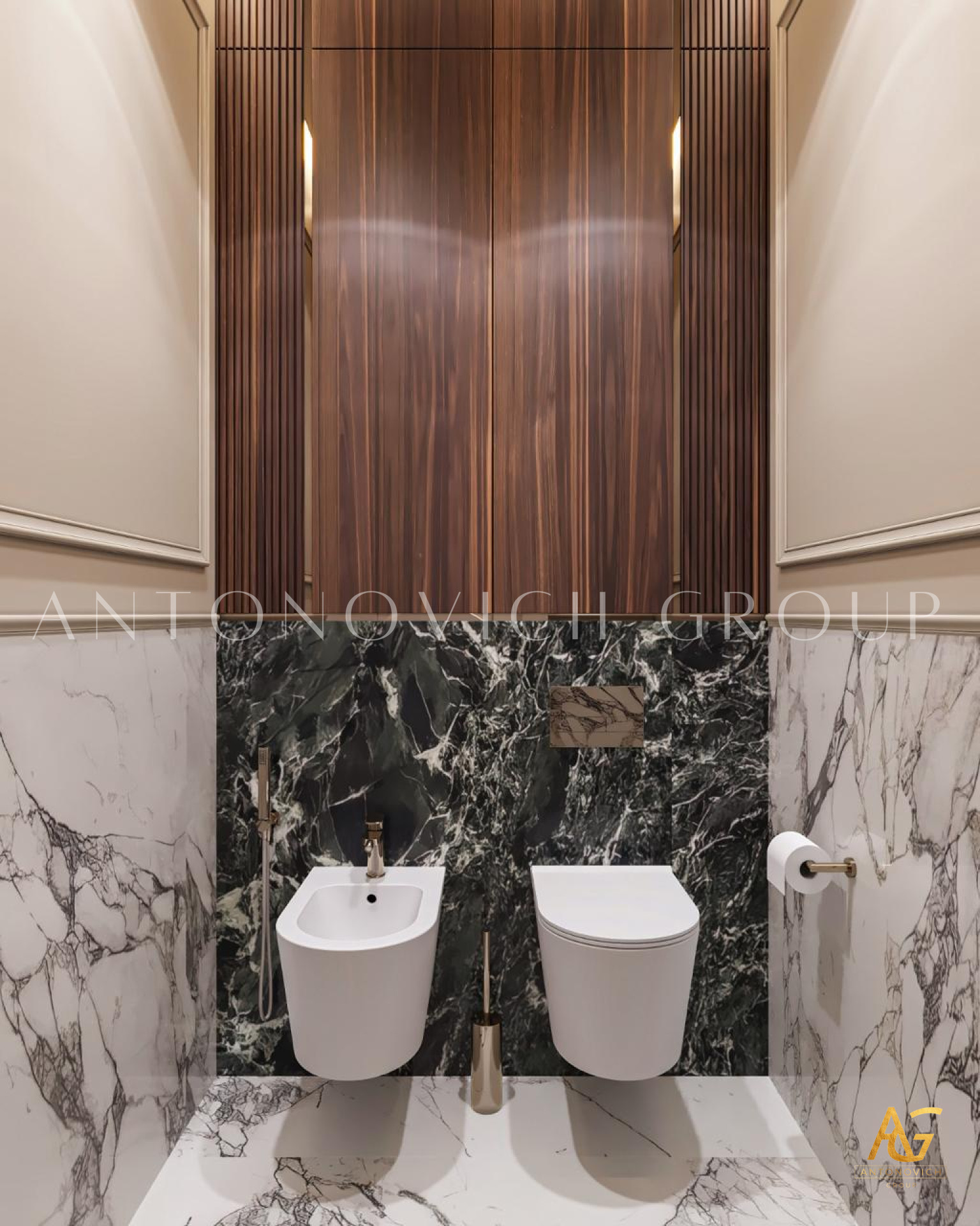 Bathroom interior design, due to the premises’ purposes, has some nuances. Dubai Interior Designers in the bathroom interior of the luxury villa in the UAE continued lush decoration and classical motifs. In a relatively small space, spectacular decorations look quite harmoniously. The ceiling is adorned with the elegant classic chandelier that looks amazing with stucco decoration. The floor design in every project of the design studio in Dubai is the creation of artistic and expressive images. The bathroom interior is decorated with carved marble floor with shiny ornaments. The walls are decorated with cream-colored stucco with the marble texture. On this background, the carved baroque frame with gold looks very juicy and bright. Zest of the bathroom interior is the door with fanciful patterns. The interior design is filled with beautiful motifs of traditional classics, which perfectly underlines the respectability and gentility of the interior.