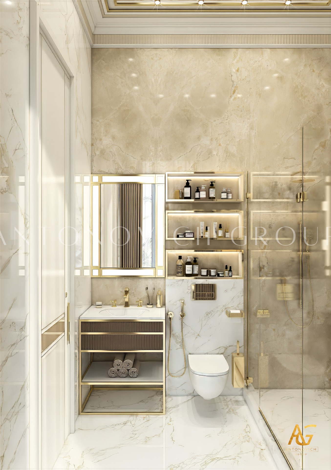 Antonovich Group’s design philosophy centers on merging art and functionality. Their designers curate high-end materials such as natural marble, onyx, custom glass, and gold-accented finishes to create visually stunning bathroom spaces. Each design is accentuated with sophisticated lighting concepts, bespoke mirrors, and custom vanity units, blending timeless style with modern comfort. The use of premium sanitary ware and high-performance fittings ensures every bathroom not only looks luxurious but also functions flawlessly.