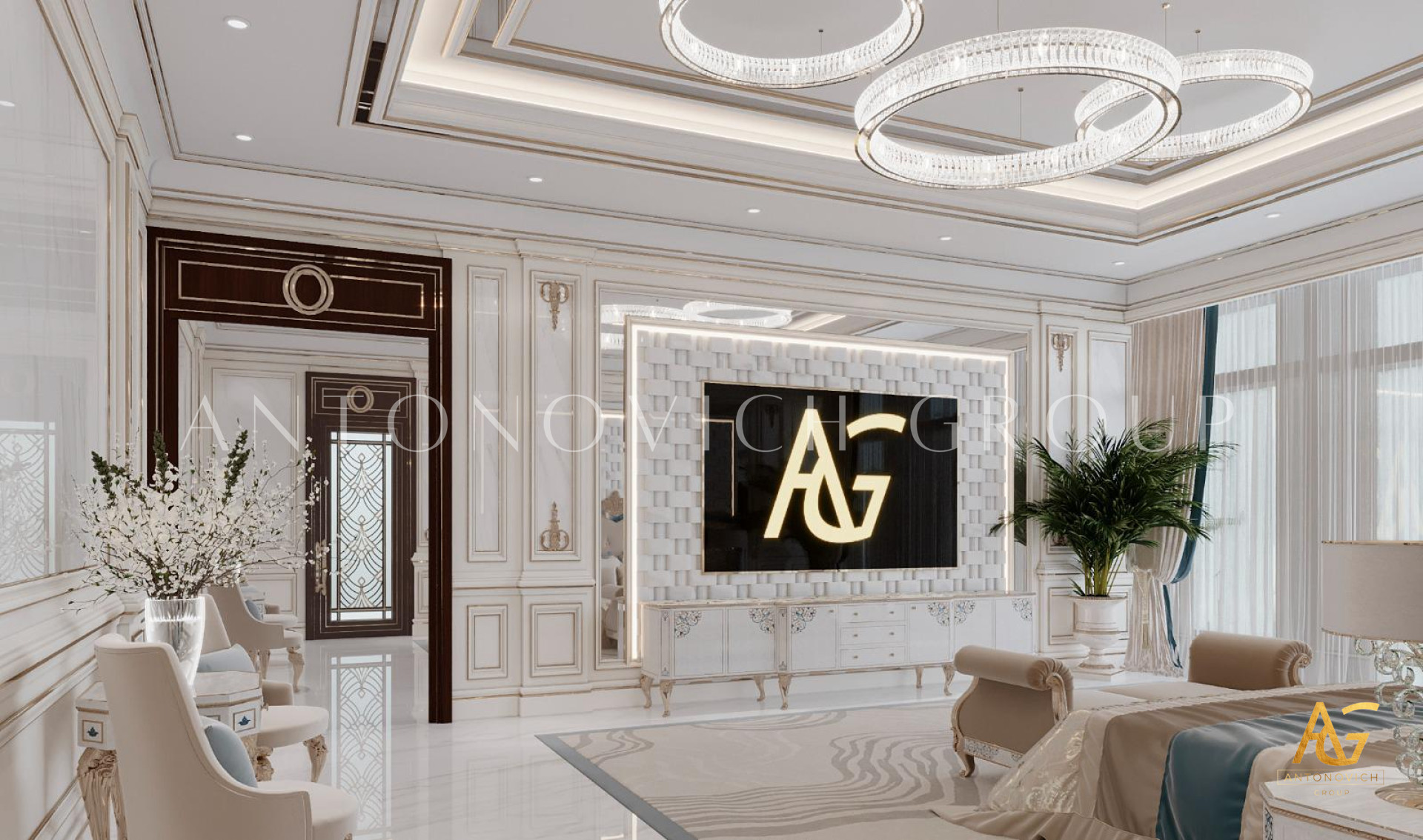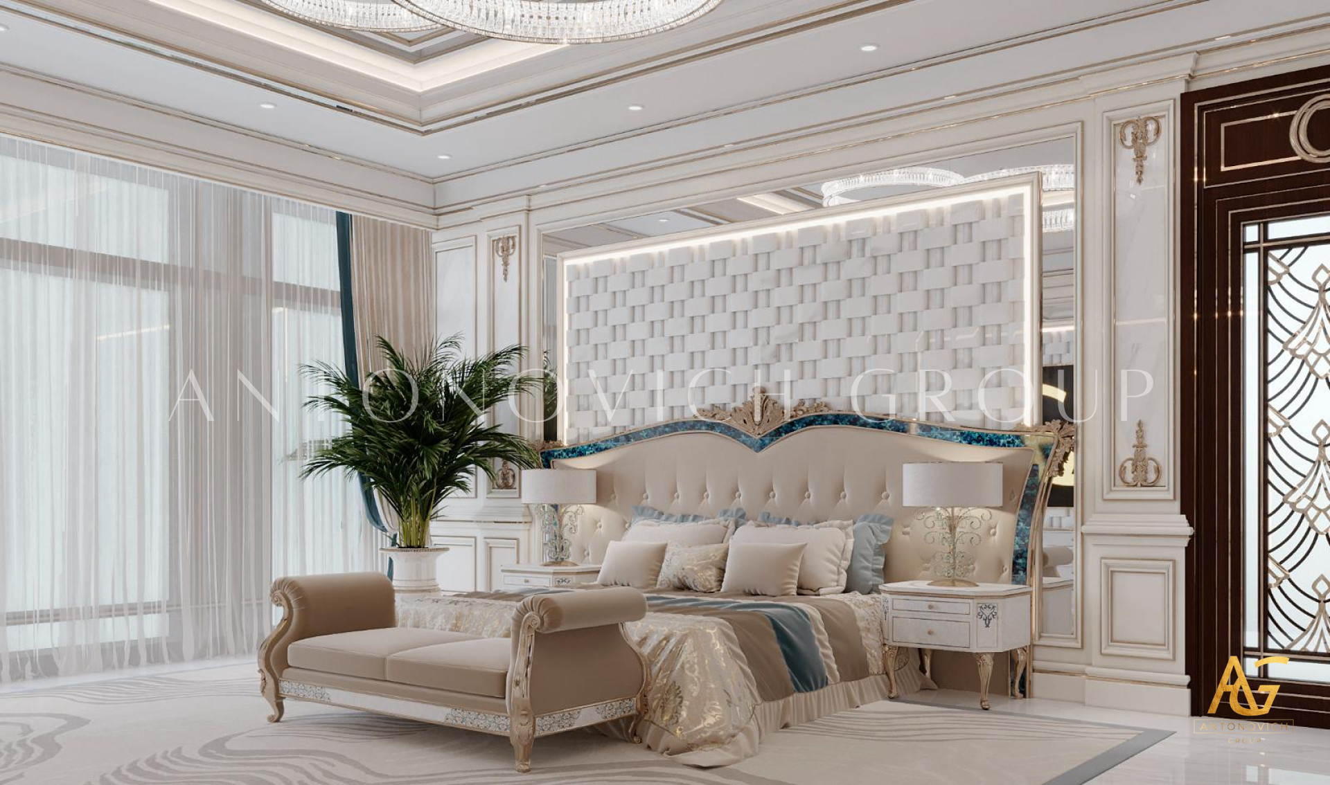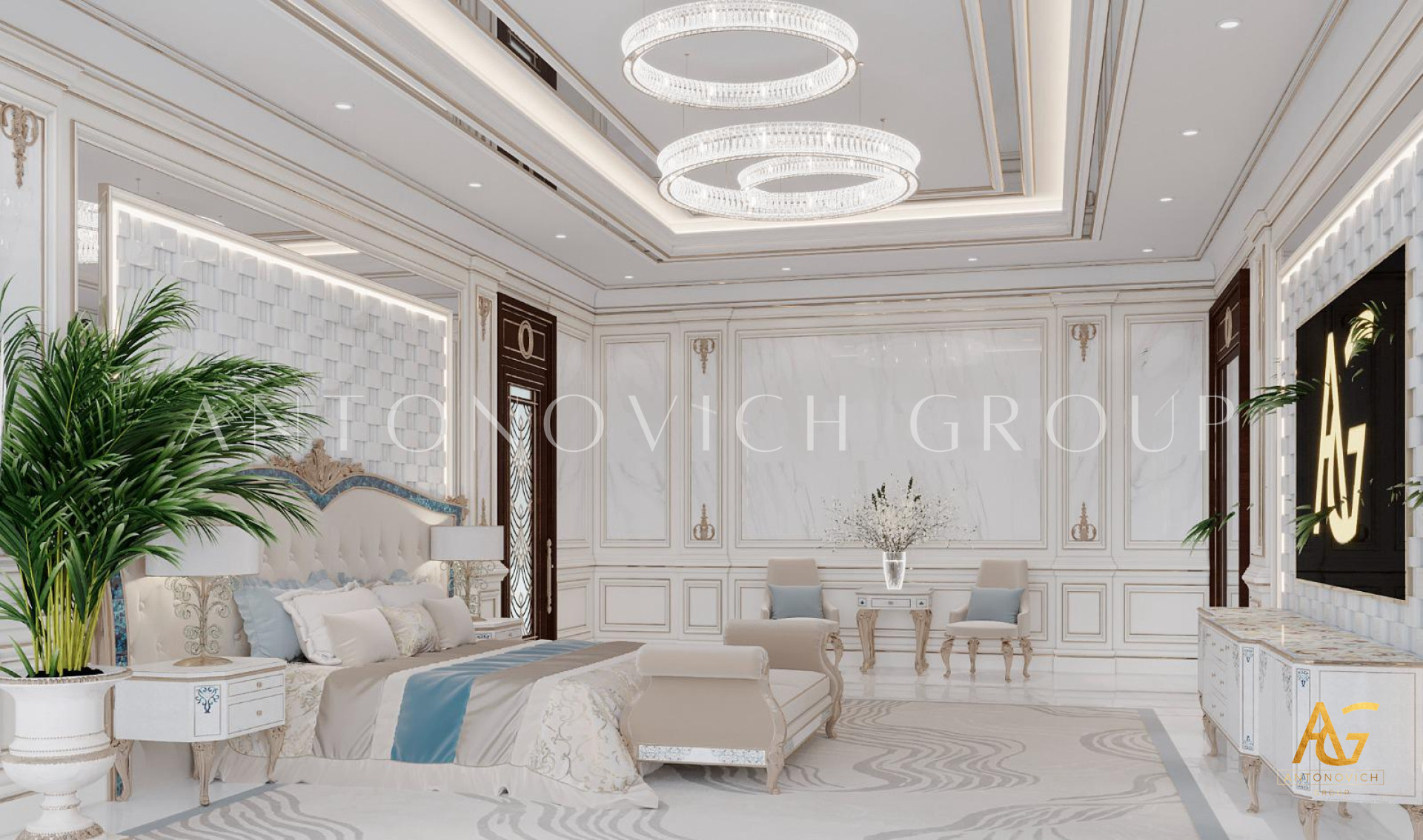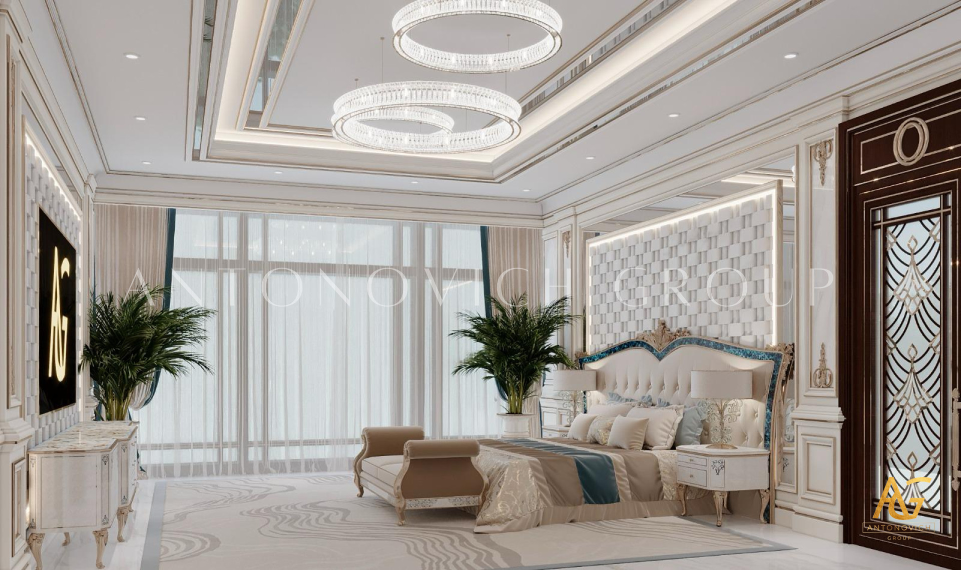 Clarity of lines and perfect harmony gives the bedroom interior design respectable and elegant character. The bedroom interior design in classic style consistently underlined the talent and skills of the interior designers. The subtle combination of fine and precious moments in the decor fills bedroom interior design with perfect harmony. In the best tradition of the classic style the ceiling is decorated. In a total milk-creamy palette thin golden lines look delicate and elegant. In the centre of a medallion, an elegant chandelier with forged elements and neat shades of chocolate hue look exquisite and stylish. Interior design for bedroom is created in a nice palette of beige and brown shades. The windows are decorated with curtains of precious silk in coffee with milk hue. Curtains look bright with a translucent white tulle. Each element of the decor, every idea of the interior designers Dubai aims to create a cozy, charming atmosphere in the bedroom interior design. In the interior design bedroom, there are many charming and cozy moments. They are a large carpet in the middle of the room with laconic geometrical ornament, luxury furniture, designed in the overall colour scheme of the walls decoration. The pieces of furniture made of genuine leather look gorgeous. The luxury bed with a creamy headboard looks catchy and stylish with a textile panel on the wall, which is made of velvet in brown colour. Poufs are upholstered in fabrics with damask patterns.