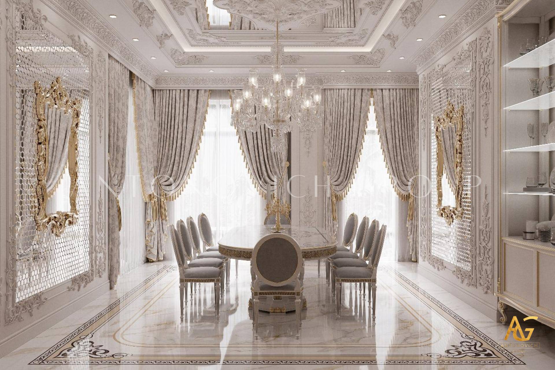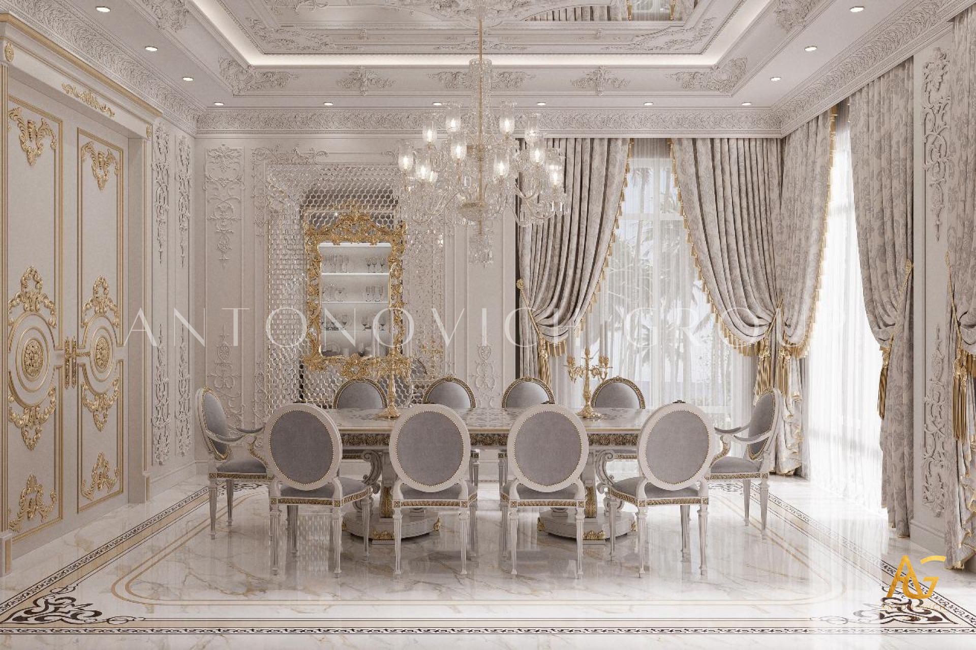 The color palette in a classic dining room interior is often rich and sophisticated, featuring shades of gold, cream, burgundy, or deep blue. Walls adorned with decorative paneling, damask wallpaper, or hand-painted frescoes contribute to an aristocratic charm. To enhance the grandeur, ceiling medallions and intricate crown molding add architectural interest and depth.