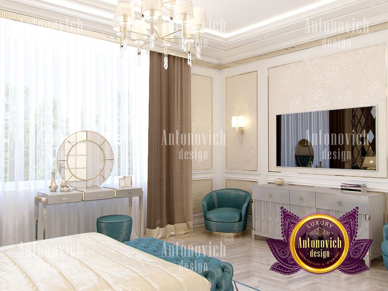 Sometimes only a geometric pattern can play a decisive role in the formation of an artistically expressive image of the interior. And in this bedroom, the beautiful motifs of the mesh rhomboid ornament exquisitely decorate the interior. The interior design of the bedroom combines classic style and art deco motifs. In the best traditions of the mentioned above art deco, the wall behind the headboard was decorated with large faceted mirrored panels. It not only visually expands the interior but also makes it very catchy and bright. Inside this radiance, a decorative panel of many stylized suns is very expressive and bright. To highlight these bright and elegant accents, the interior designers use more restrained motifs in the decor of the ceiling and furniture. Almost invisible closet perfectly fit into the bedroom interior, without loading it. A pearly white smooth surface of the ceiling was decorated with a neat chandelier with small lamps and a soft backlight along the perimeter. The authors of the project continue geometric improvisation in the design of the floor. On the parquet of light wood interestingly looks a large natural carpet with a large pattern. The bed and soft furniture of ash-blue color become the color accent. The high headboard and its footplate are decorated with a soft panel of silk with small rhombs. For window design, curtains of two types of silk were perfect. One of ash-blue color, which repeats the shade of upholstery furniture, and another of warm bronze shade. Elegant boudoir table by the window is complementing an exquisite image of the interior.