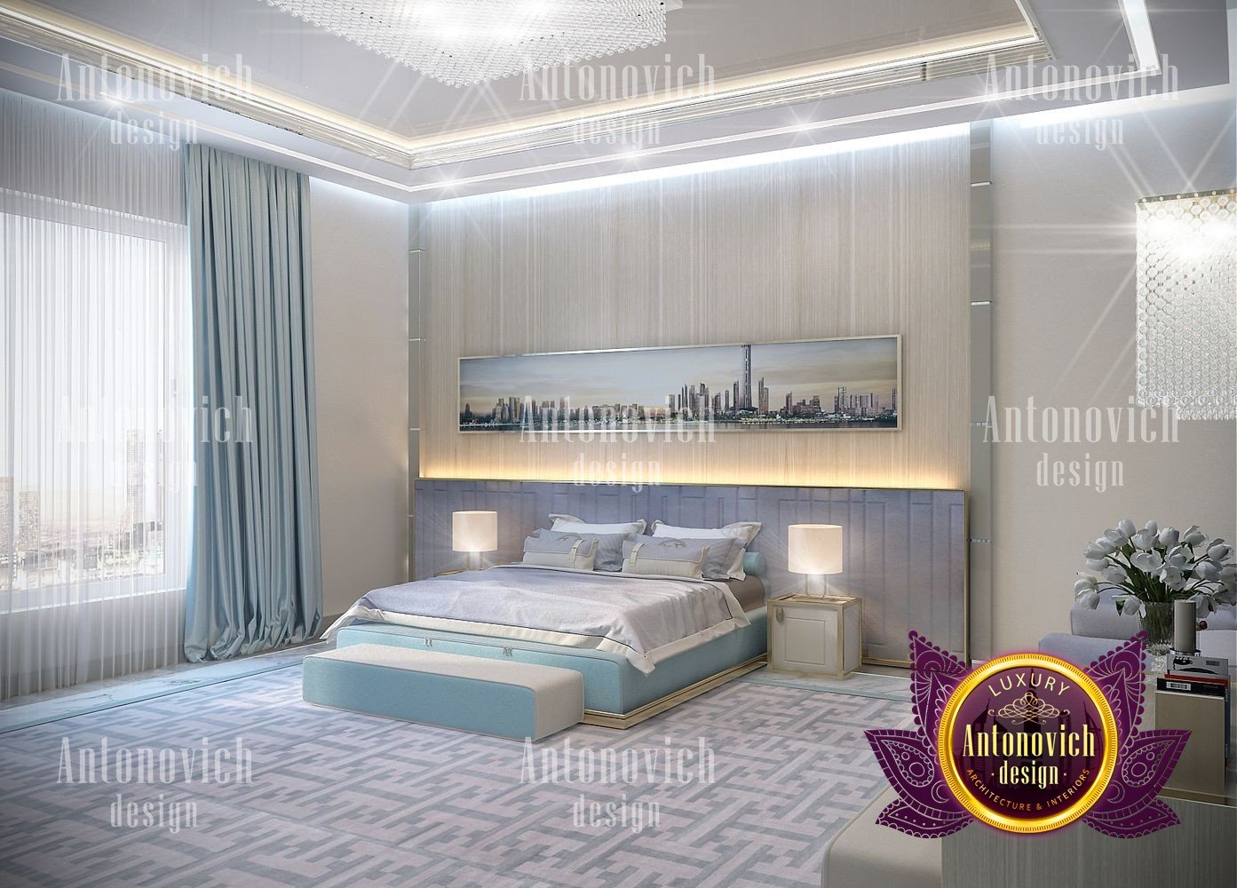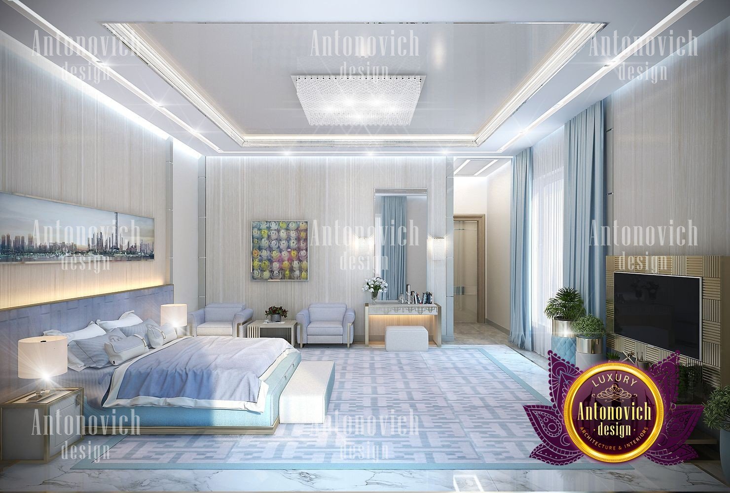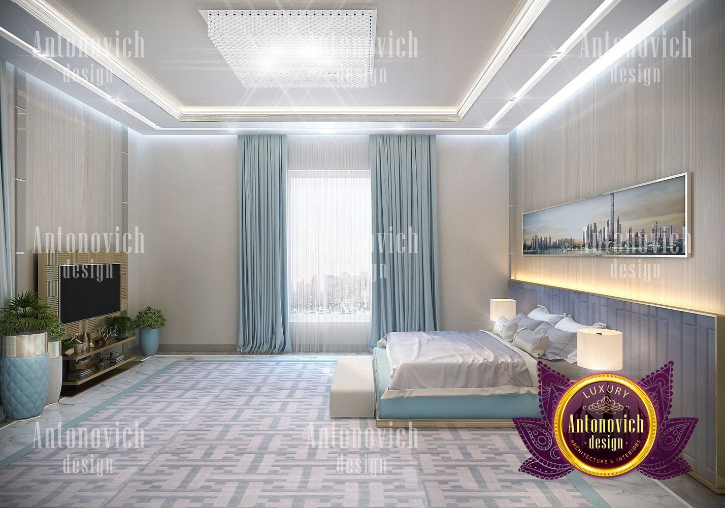 In this amazing bedroom interior design, the team has been successfully implemented the proper balancing in all spaces and interior design settings. The full bedroom interior design looks very stunningly beautiful with the most comfortable and refreshing atmosphere from a very nice combination of hues and texture selected. A very stylish carpet design creates a very positive mood towards the full bedroom as it complements the bedroom design and concept and it perfectly matches over the marble base flooring. Take a look at how detailed the interior designers have been matched the hues and materials in every curtails, bed sheets, linens, and pillows that achieved a very consistent style. Walls have been perfectly decorated with a set of stylish and solid materials wall paneling with a very nice accent of wall backlighting. The panoramic artwork at the top of the bed headboard is like the continuation of the outside view from the wide windows covered by classy curtains and shades. The ceiling and gypsum design have been completed the amazingly beautiful the interior design of this bedroom, having a full crystal chandeliers design with a very special accent from the gypsum backlights that provides the perfect blend of brightness towards the full bedroom interior.