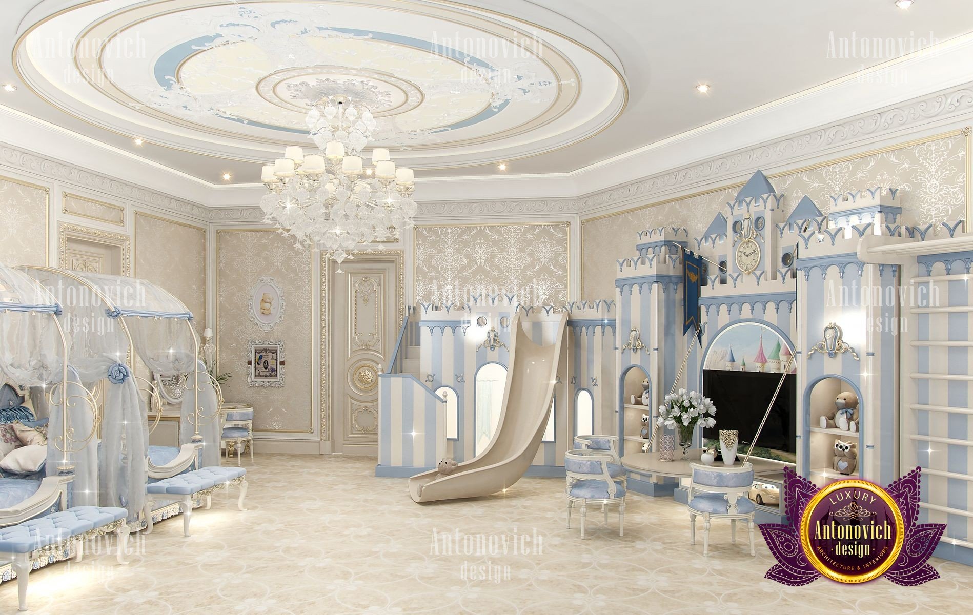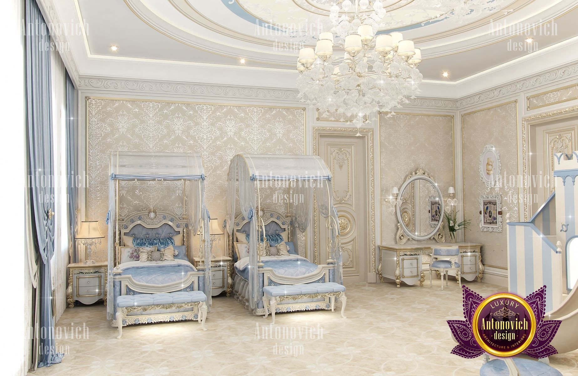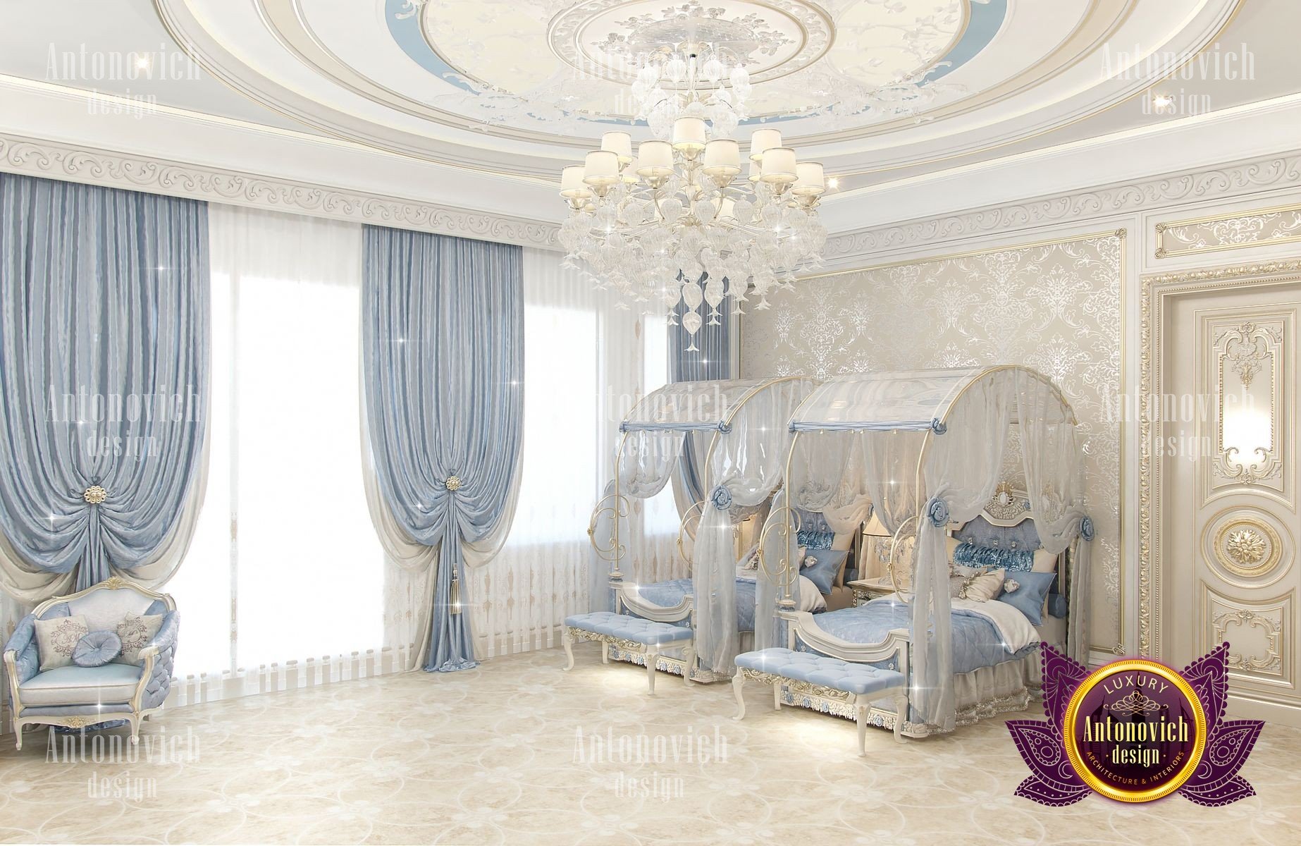 The design of the childrens room, which is similar to a happy fairy tale, was created by the creative designer of the studio Luxury Antonovich Design Katrina Antonovich. Everything is so beautiful here that you want to admire this beautiful interior of the childrens room for two sisters aged 4 and 5 years. A large enough space allowed creating comfortable areas for sleep, games, and learning. Modern furniture manufacturers create incredibly beautiful options for childrens rooms. In this project, the highlight and the main decoration of the room were two charming beds. The carved headboards are encrusted with sophisticated carved decorations with silvering and inlay with semiprecious stones. An obligatory part of the bed was the charming ottomans. Especially luxurious look original canopies made of translucent blue silk, which beautifully decorates the beds with the help of special arched constructions. In the decor of the walls, floors, and ceiling, the interior designer continues the motives of the other rooms in the house. Very warm and cozy look natural parquet on the floor of a light valuable wood. The walls were decorated with elite silk wallpaper with damask ornaments in creamy-golden tones. A circular multi-leveled niche on the ceiling visually combined the space of the interior. A large crystal chandelier with large pendants and a magnificent molded decoration on the medallion around it fills the room with the mood of royal palace luxury. Beautiful curtains of blue silk fit perfectly into the interior of the childrens room. A large play area has become a real dream come true for two little princesses.